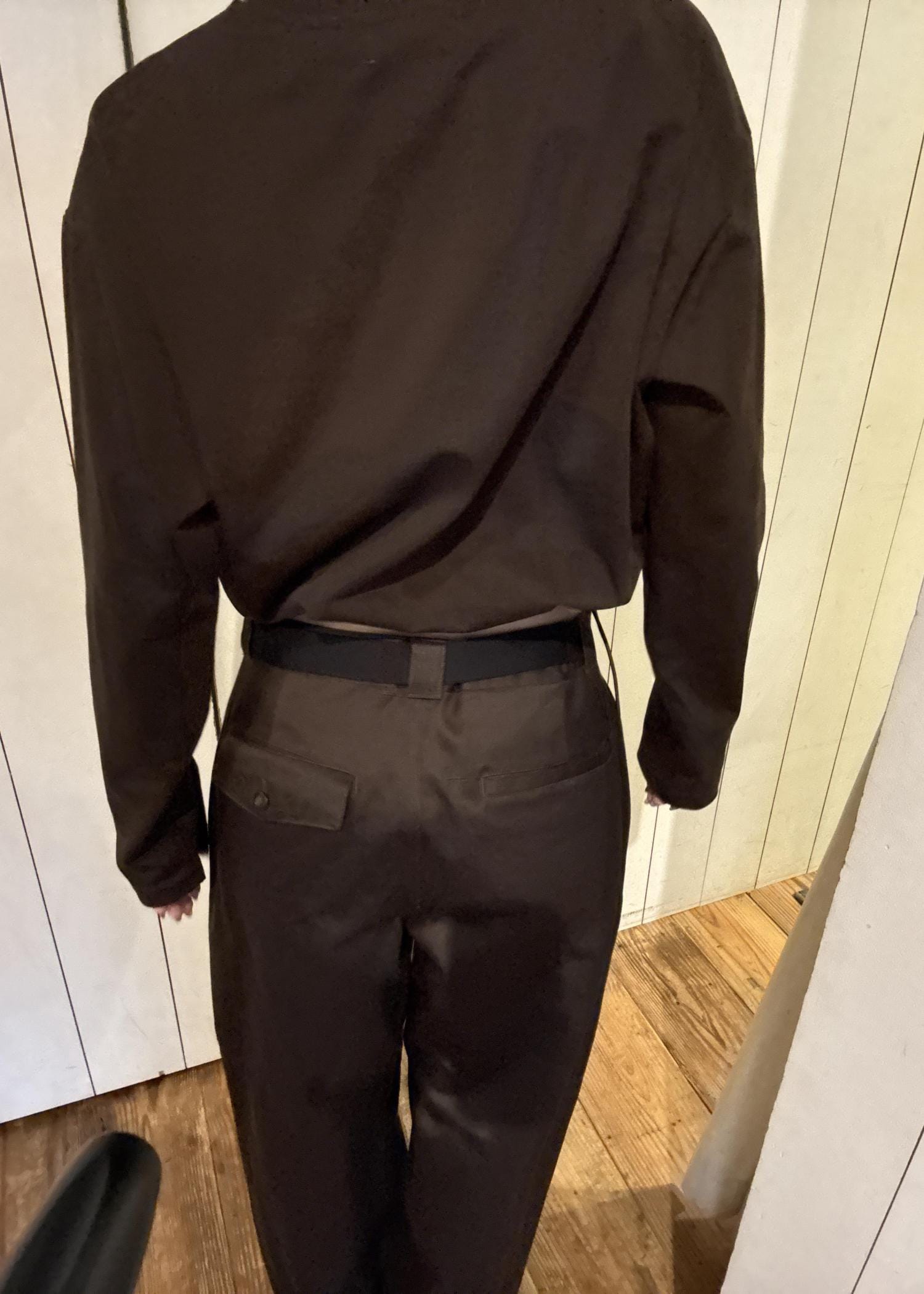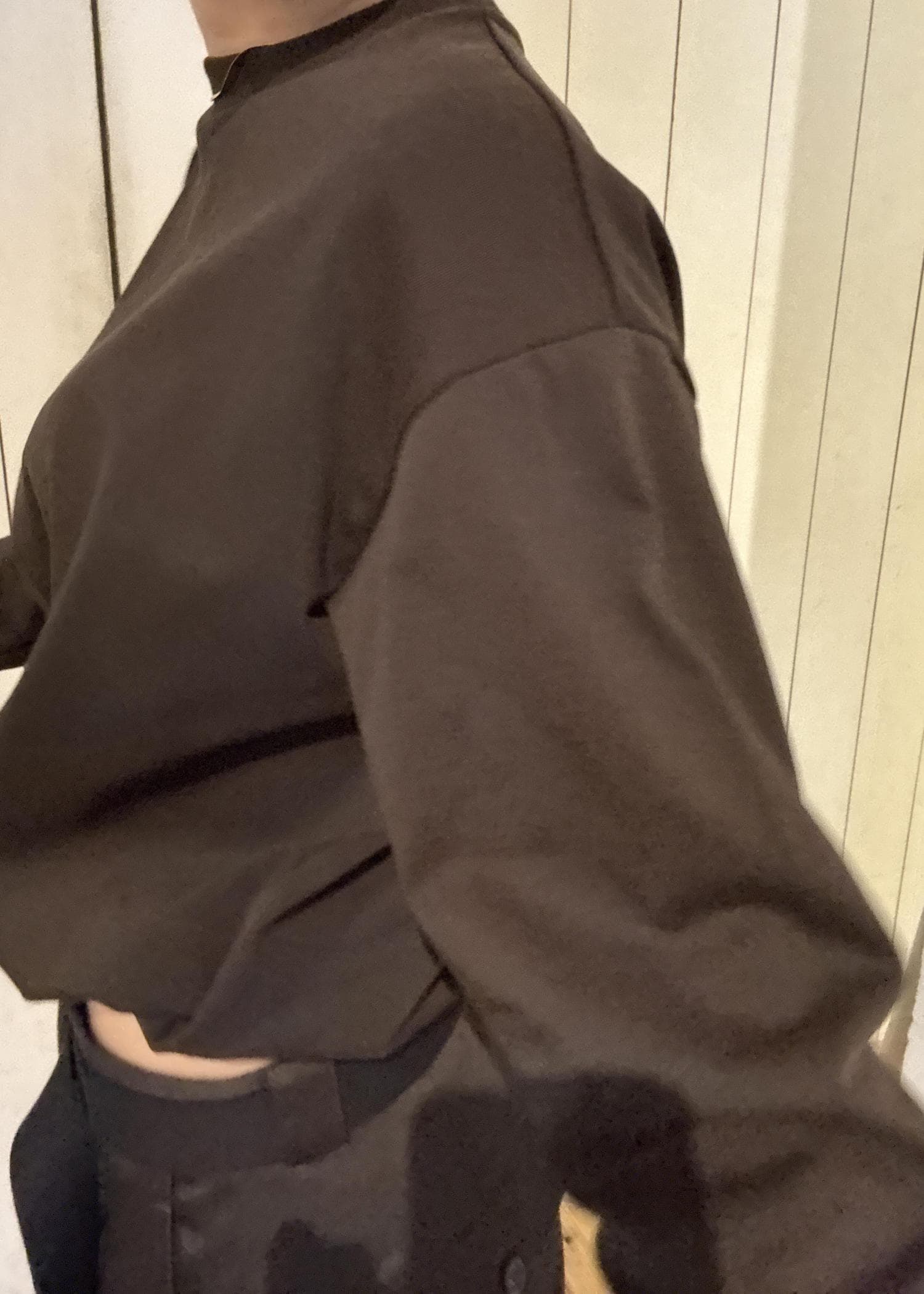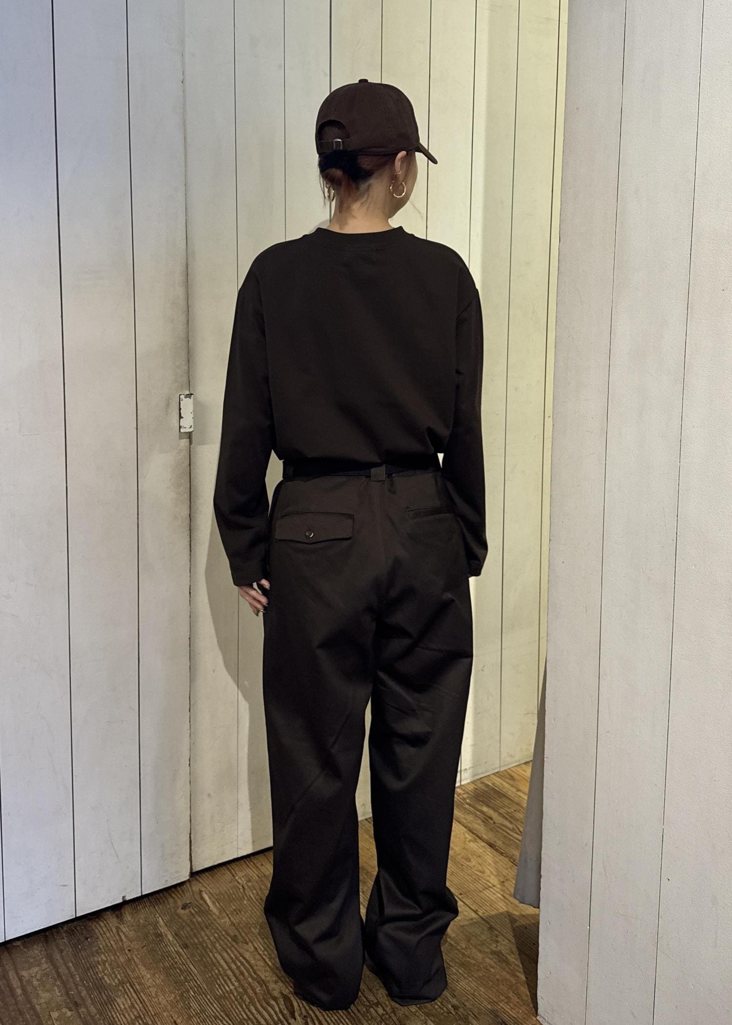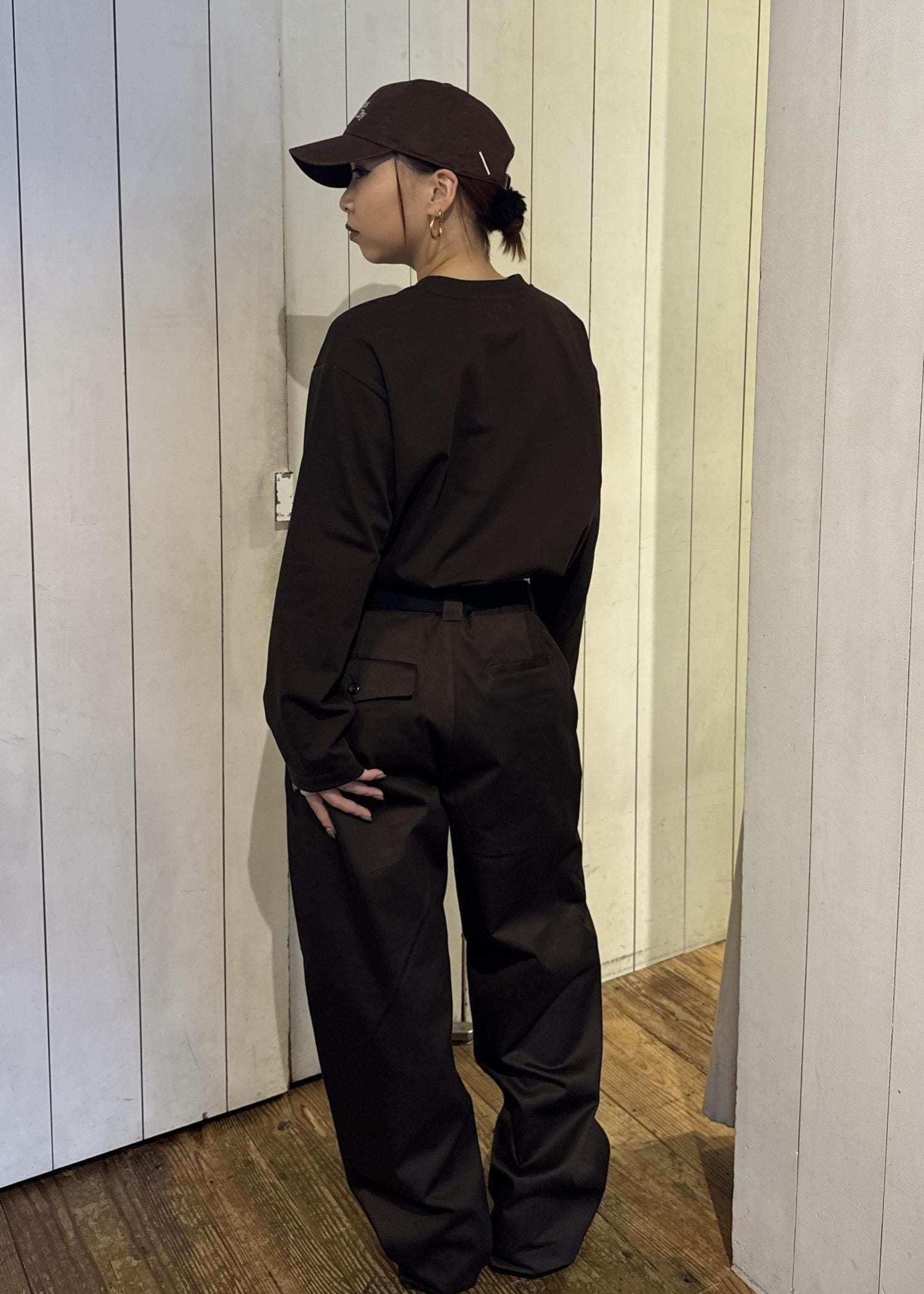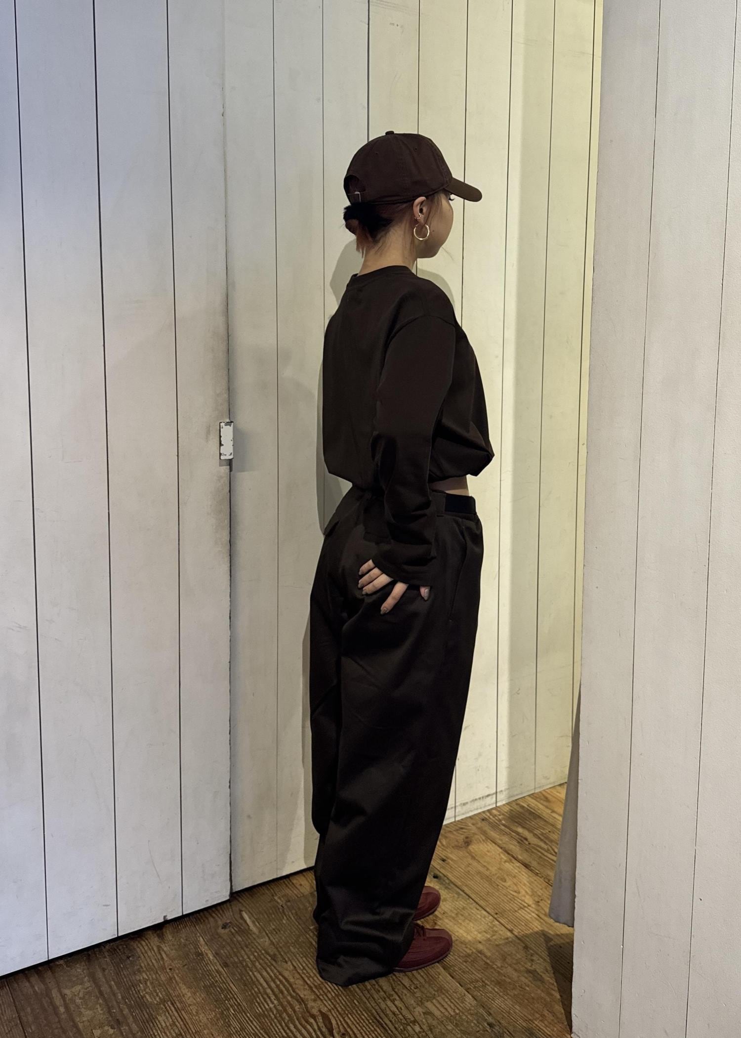ワントーンで統一しながら、ショート丈×ワイドシルエットでバランスを構築。ブラウンの柔らかい印象が、程よく抜けた都会的スタイルを演出。