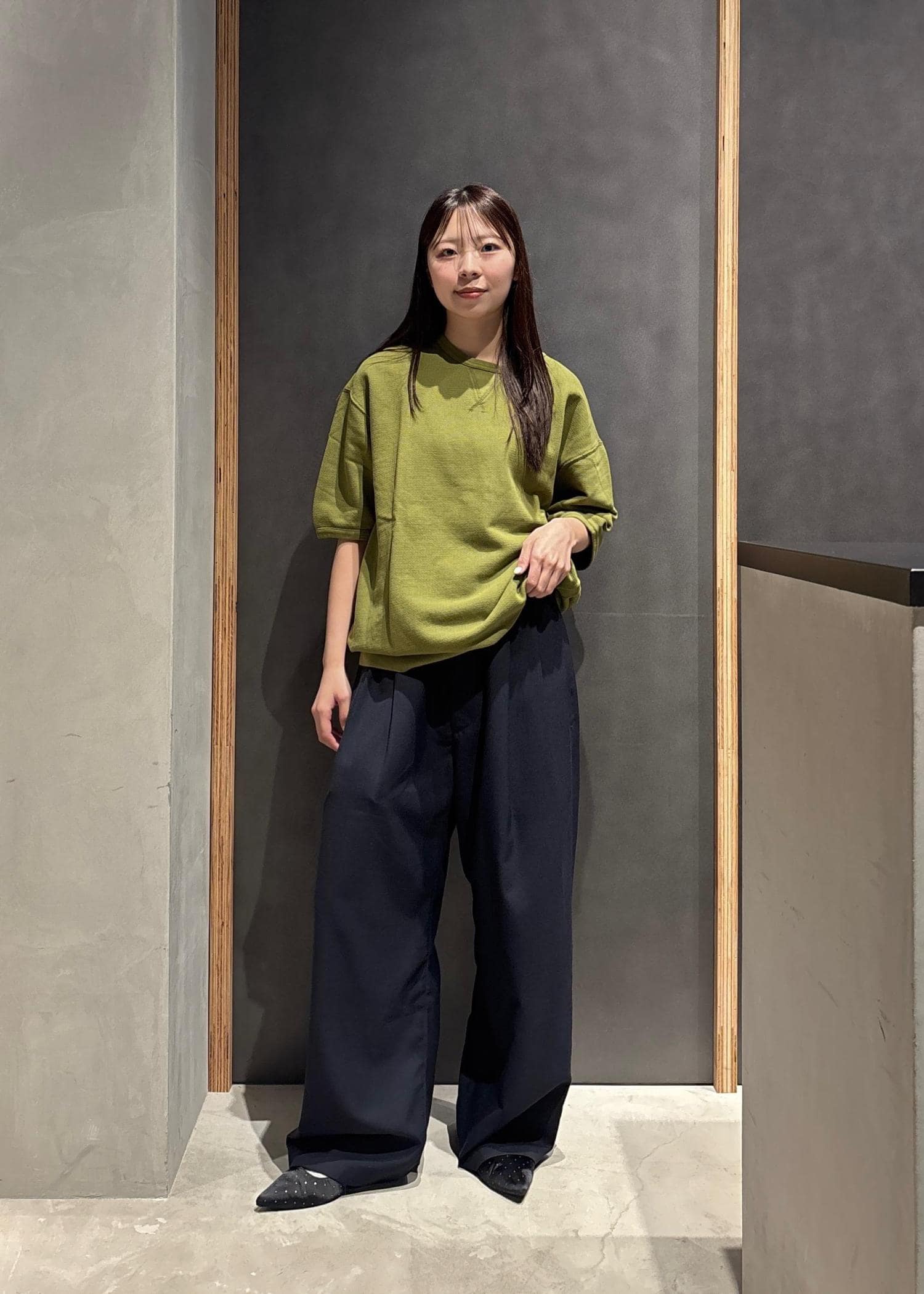 落ち着いた色味のスラックスと合わせ、キレイめだけどラフなコーデにしてみました^^