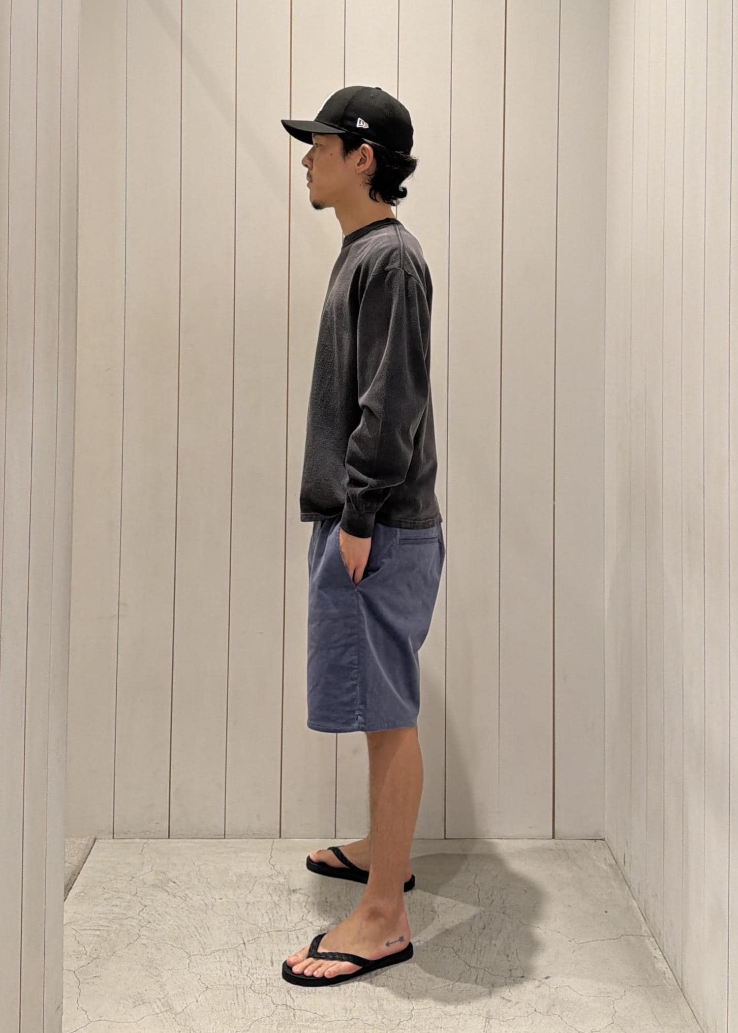 フェード感のあるロングスリーブTが程よくこなれた印象を演出し、シンプルながら雰囲気のある一枚に。