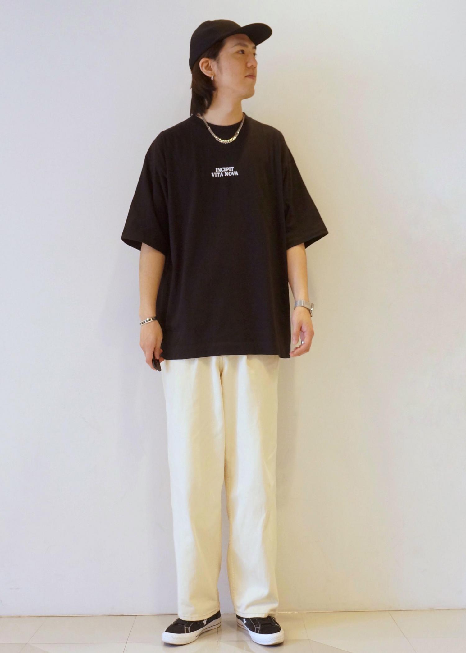 バックプリントが印象的なTシャツにワイドデニムを合わせた夏のリラックススタイル。