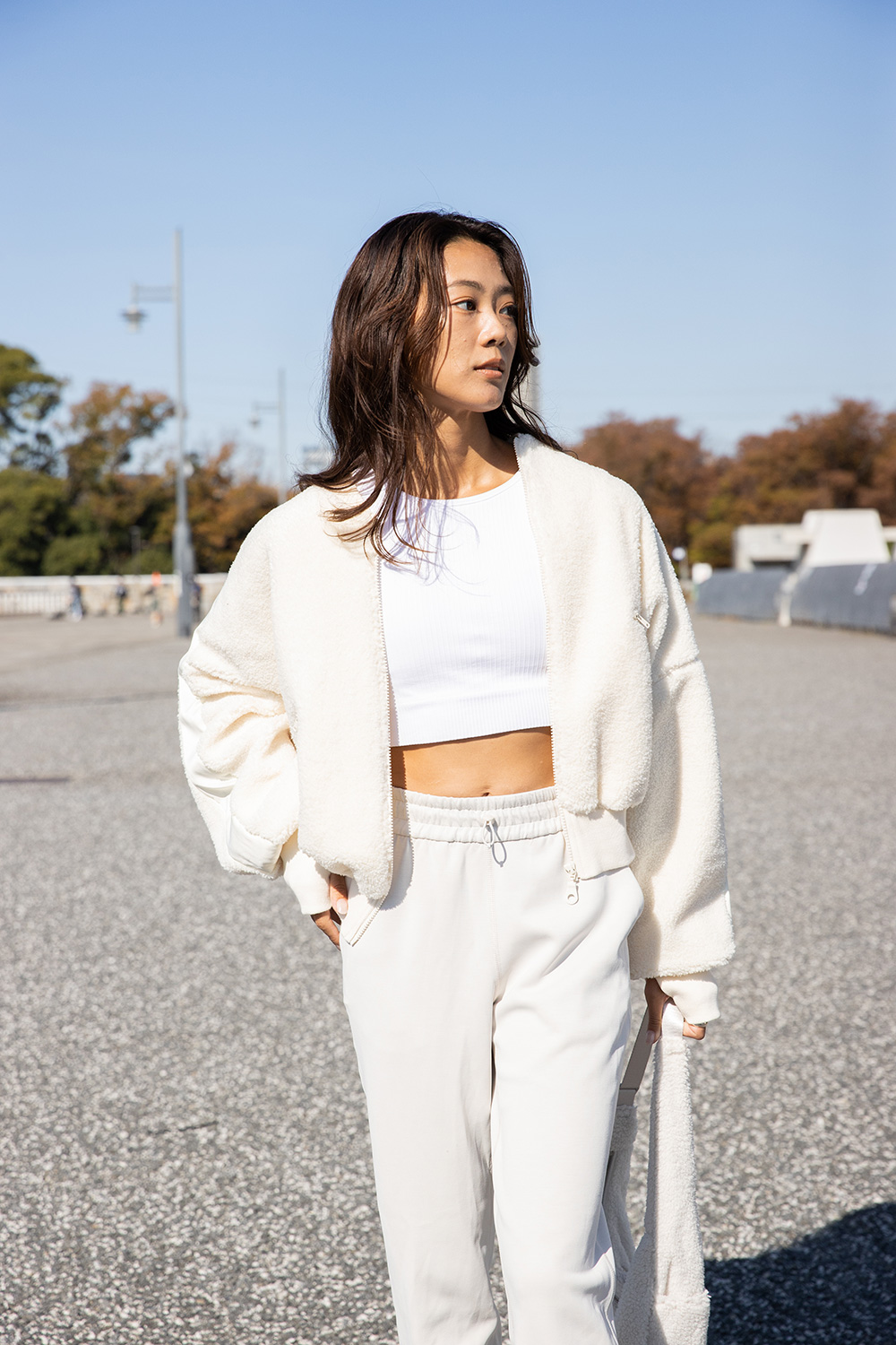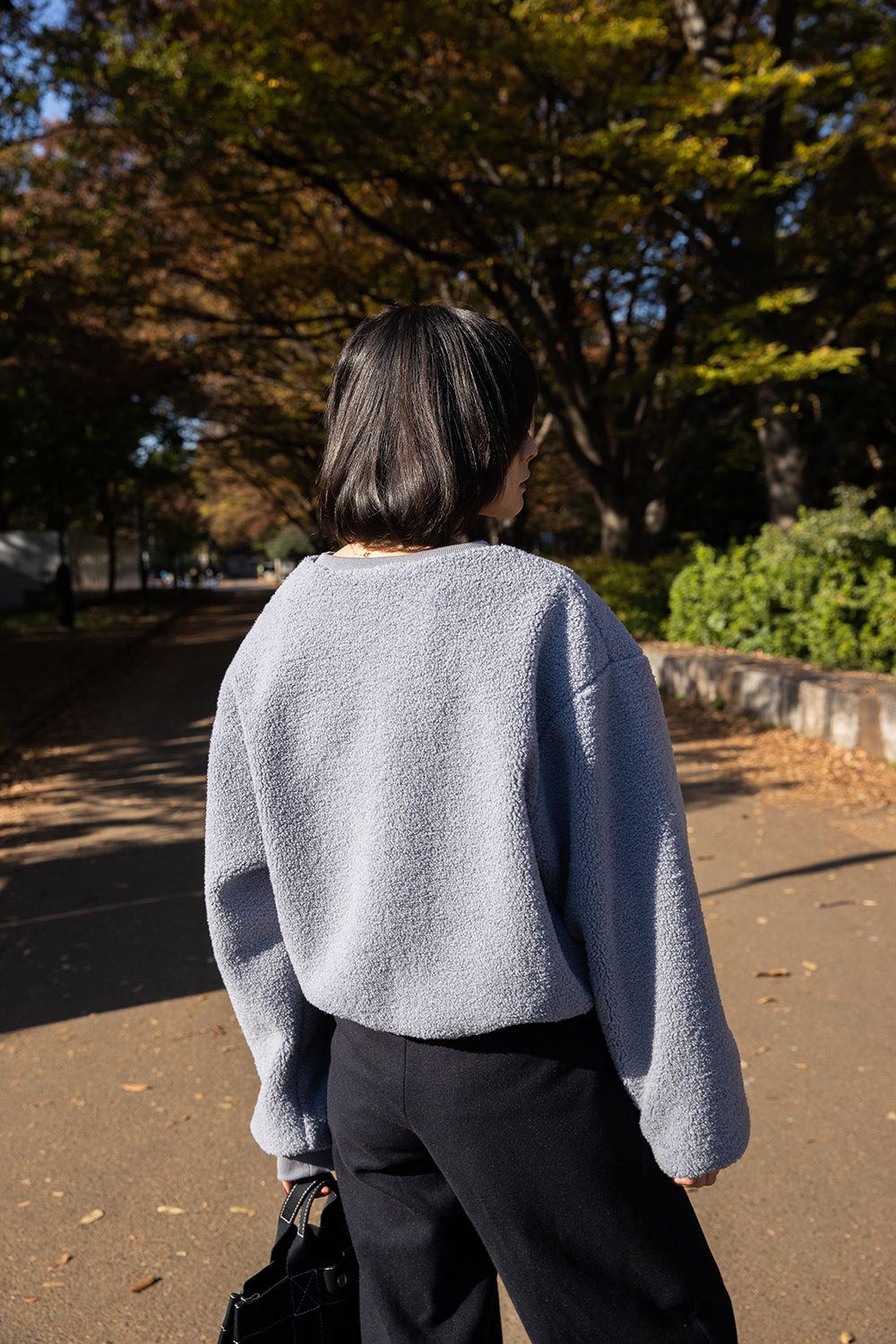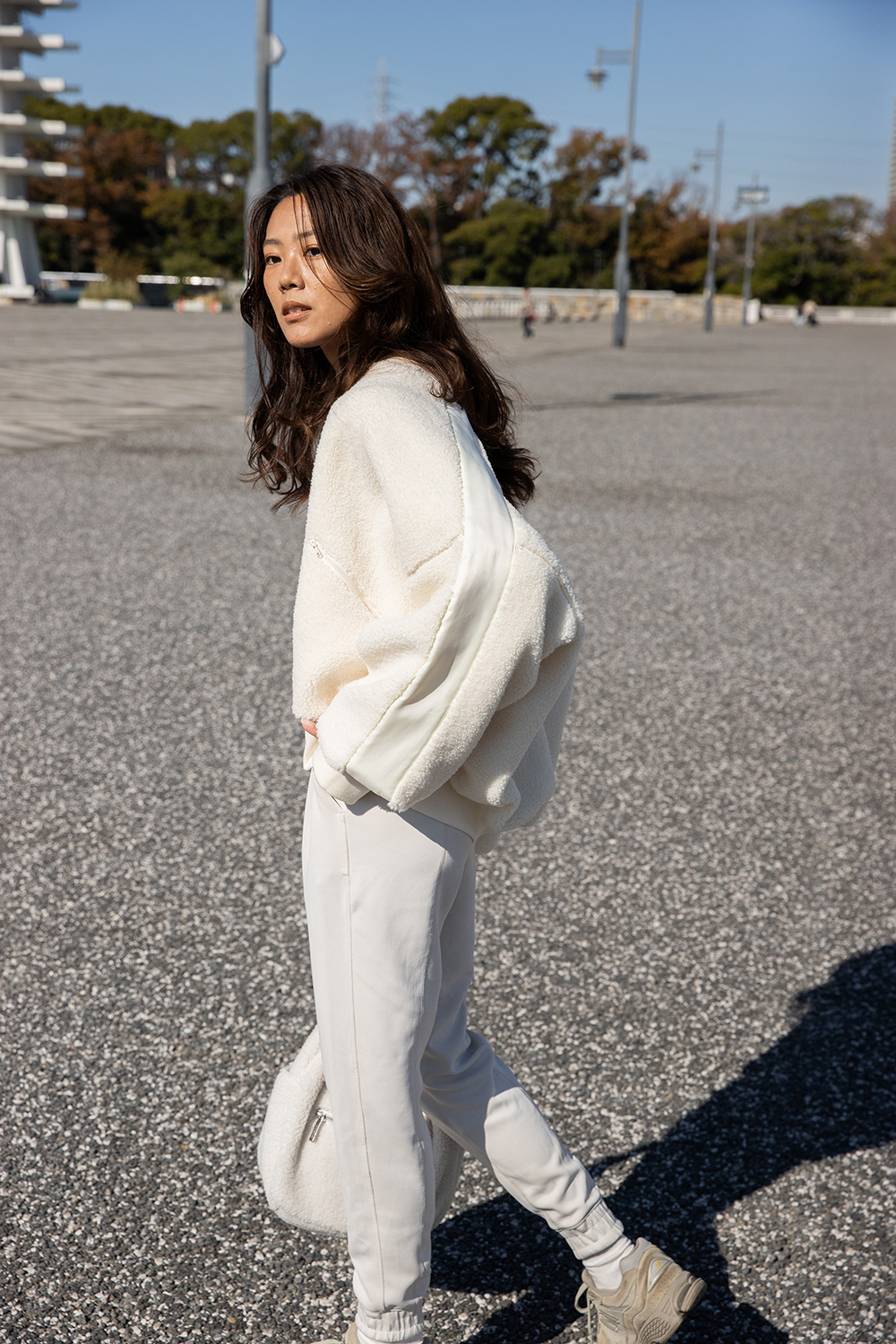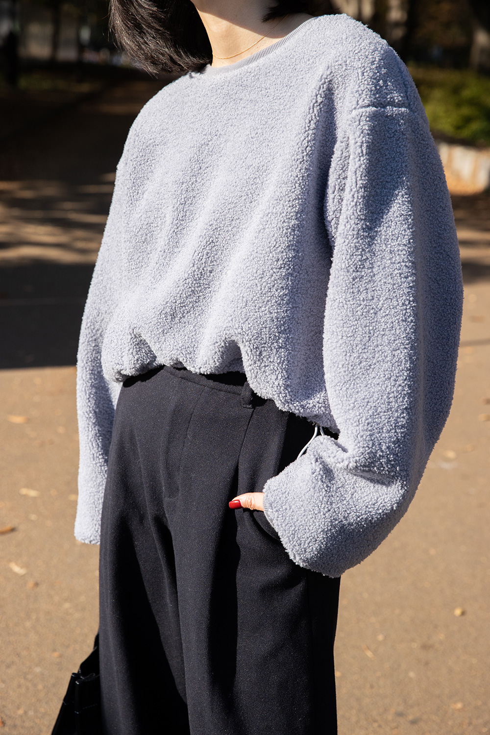 ボアブルゾンは、コロンとした丸みのあるシルエットですっきりとしたトップスとボトムで合わせる