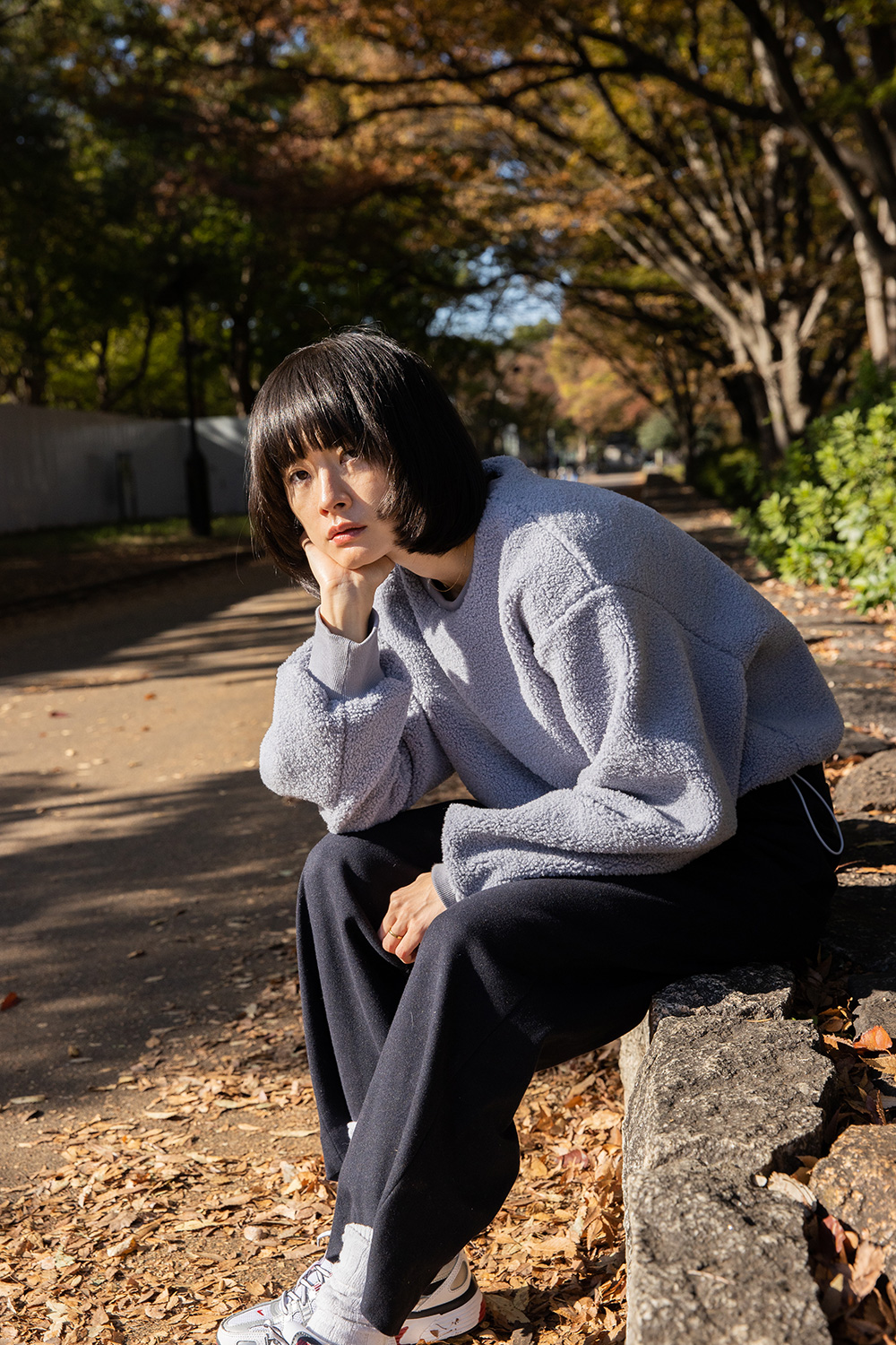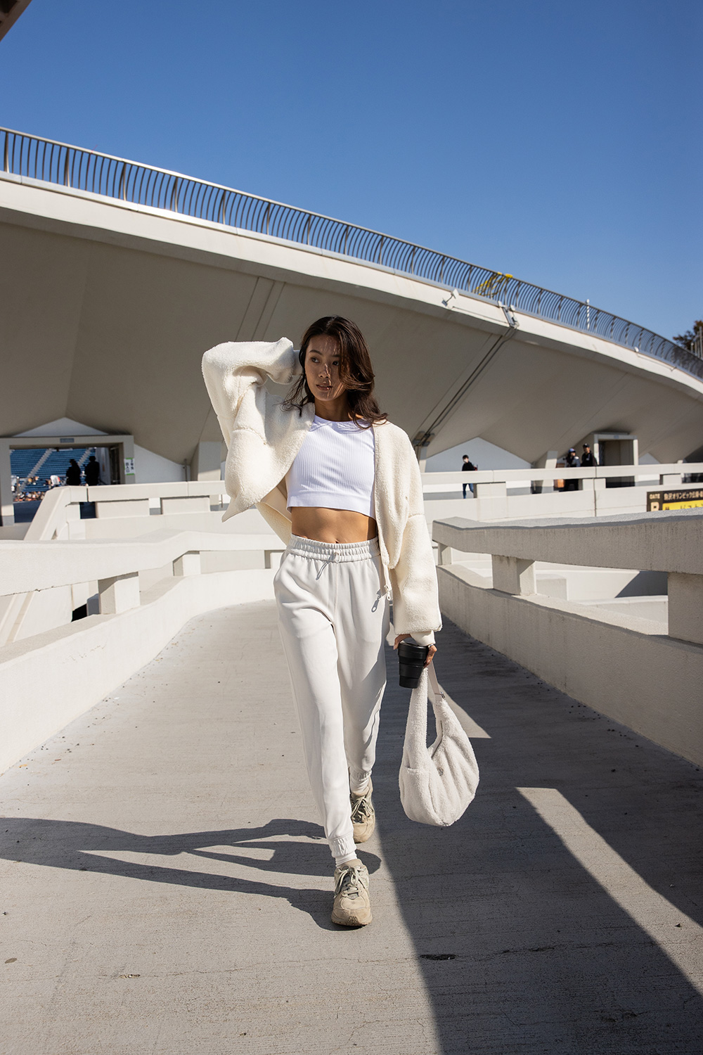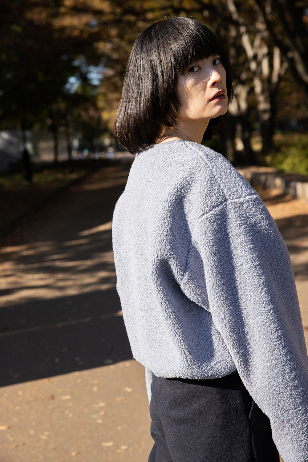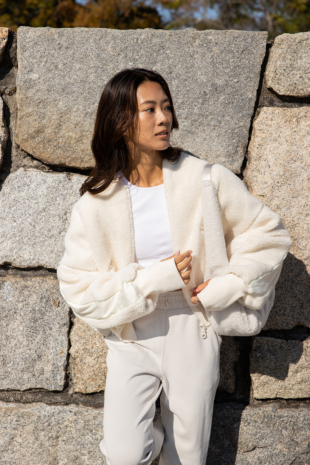 ボアブルゾンは、コロンとした丸みのあるシルエットですっきりとしたトップスとボトムで合わせる