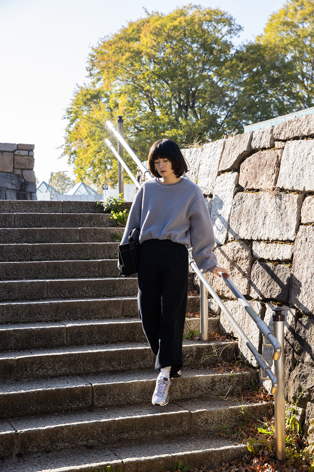 パンツとスニーカー合わせで、カジュアルだけどスタイリッシュに