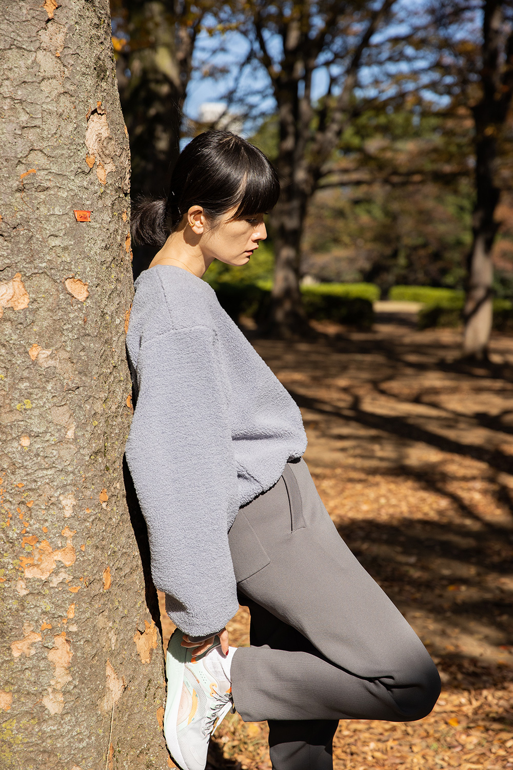 軽量ニット素材のテーパードパンツと合わせた秋のランニングスタイル