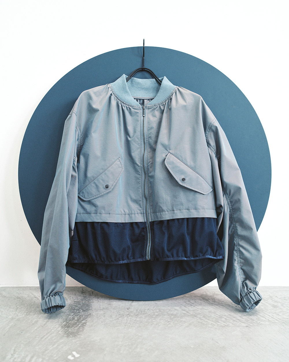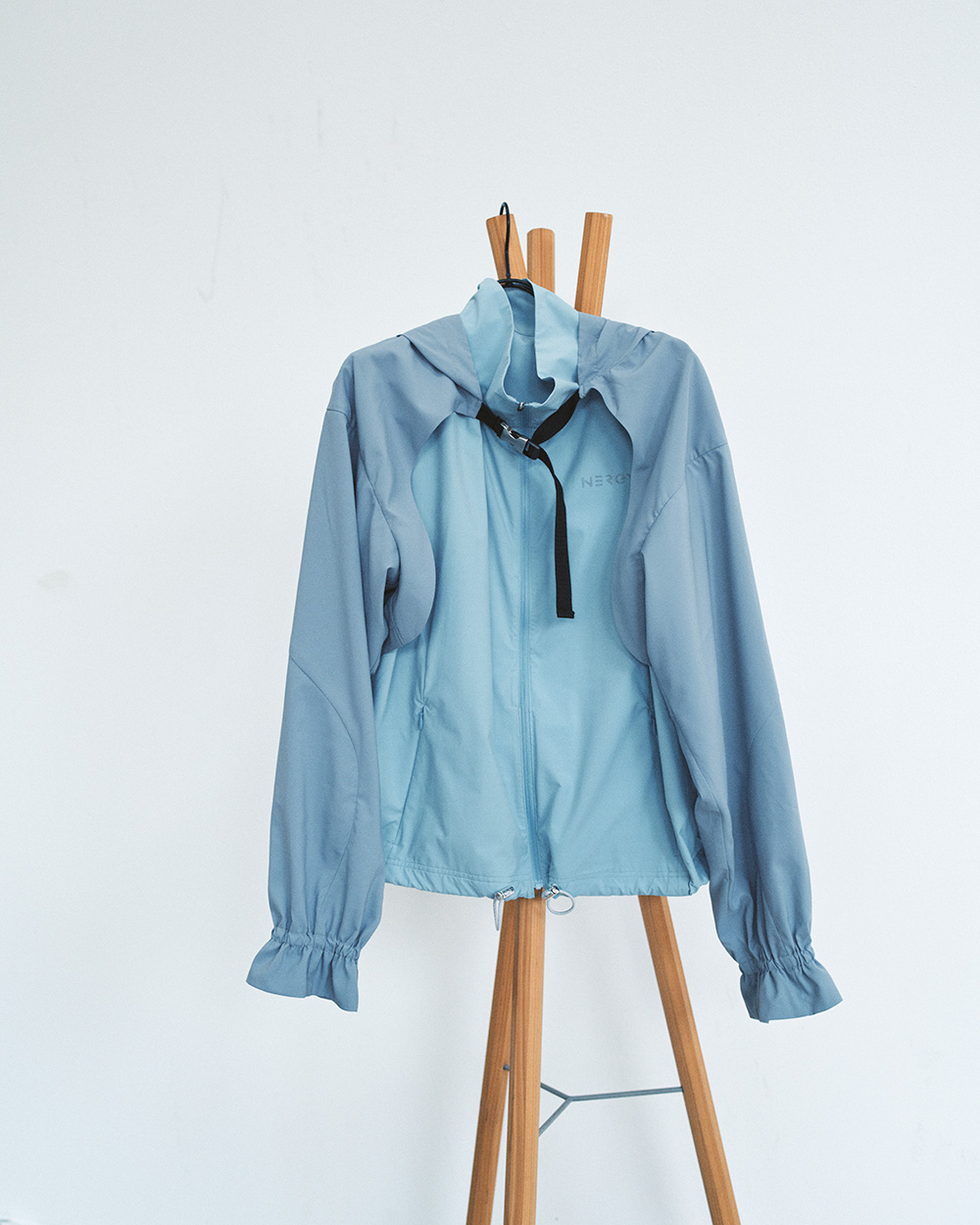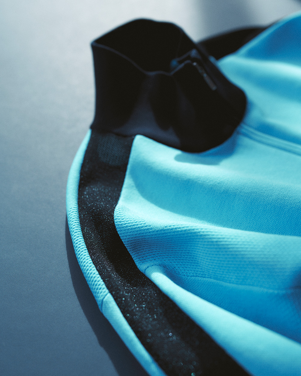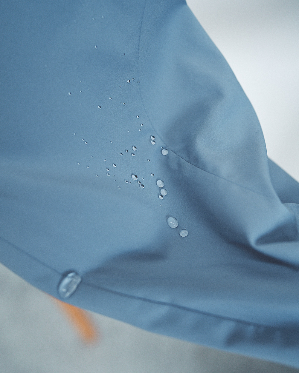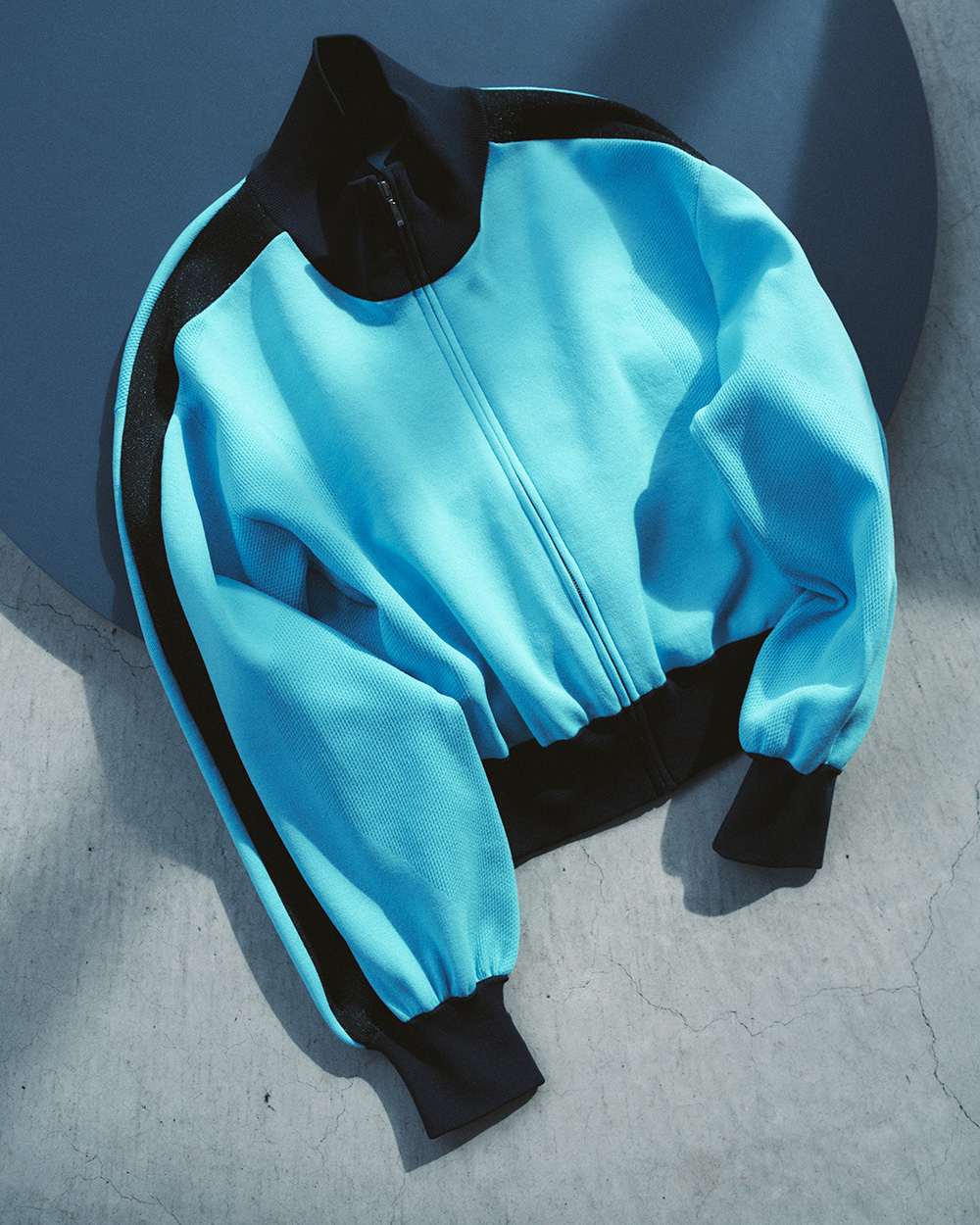 はっ水加工を施されたニット糸を使用し編み立てたトラックジャケット。ニット素材ながら、軽い雨を防ぎます。