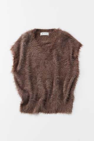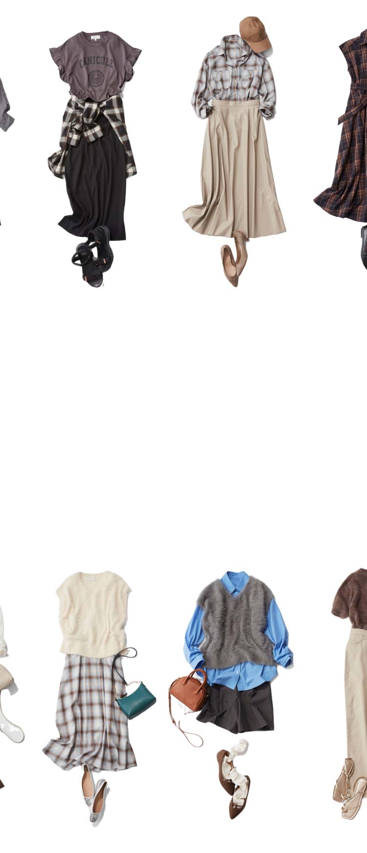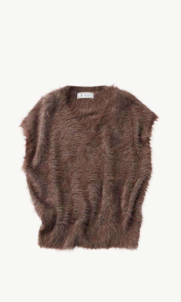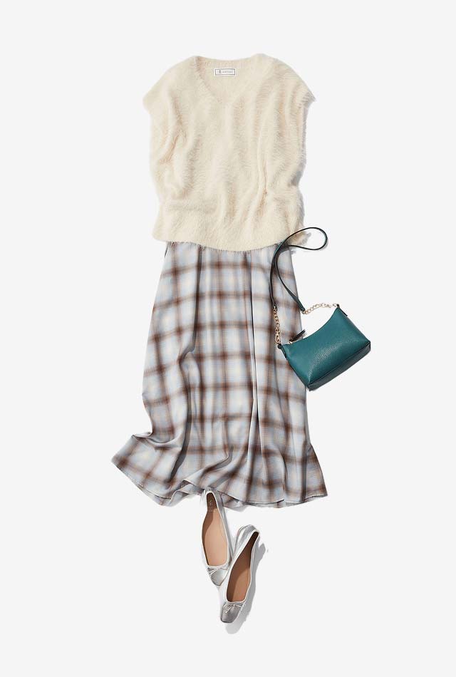 シンプルニットは柄アイテムと相性抜群。一見シンプルながら上品な毛足で華のあるスタイルに。