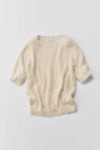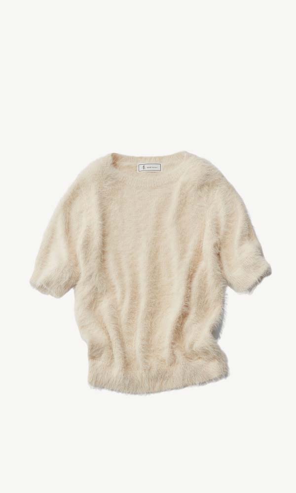 定番のTシャツ×デニムをフェザーニットにチェンジ!素材感が変わるだけでグッとおしゃれな先取りコーデに早変わり。