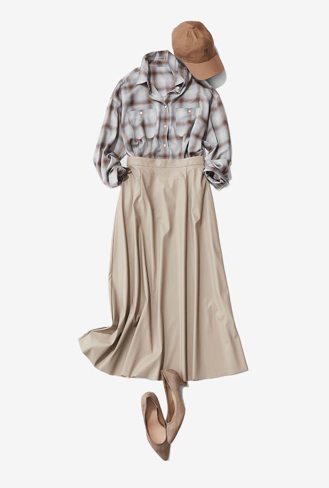 相性抜群なチェック×レザーはフレアスカートでレディに取り入れて。足元はパンプスで上品に仕上げればワンランク上の大人カジュアルが完成。