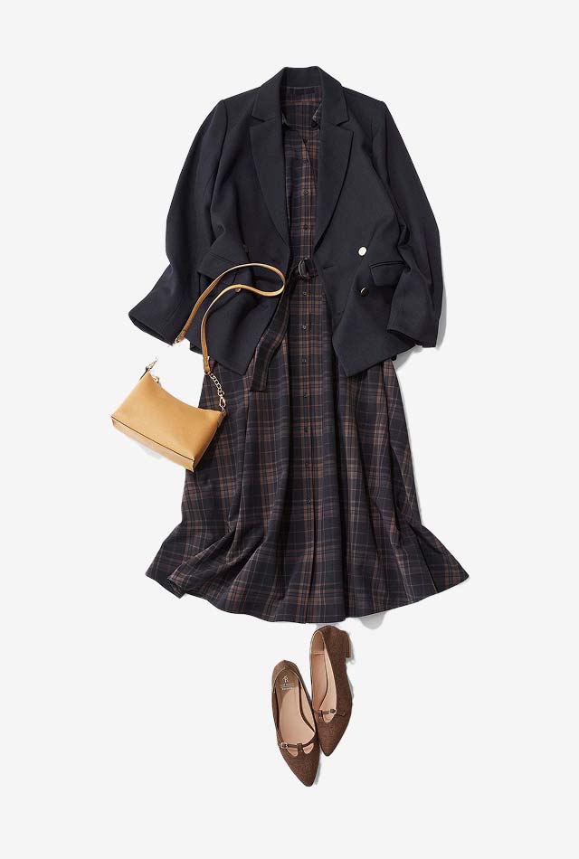 ジャケットを羽織ればお仕事もいけちゃう上品スタイルに。バッグや足元で抜け感をだしてレディに着こなして。