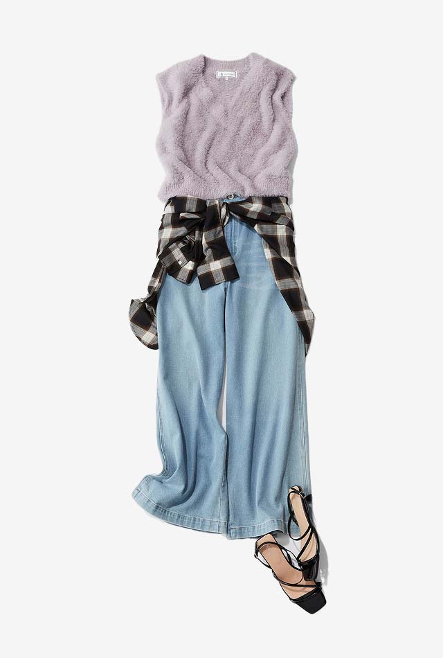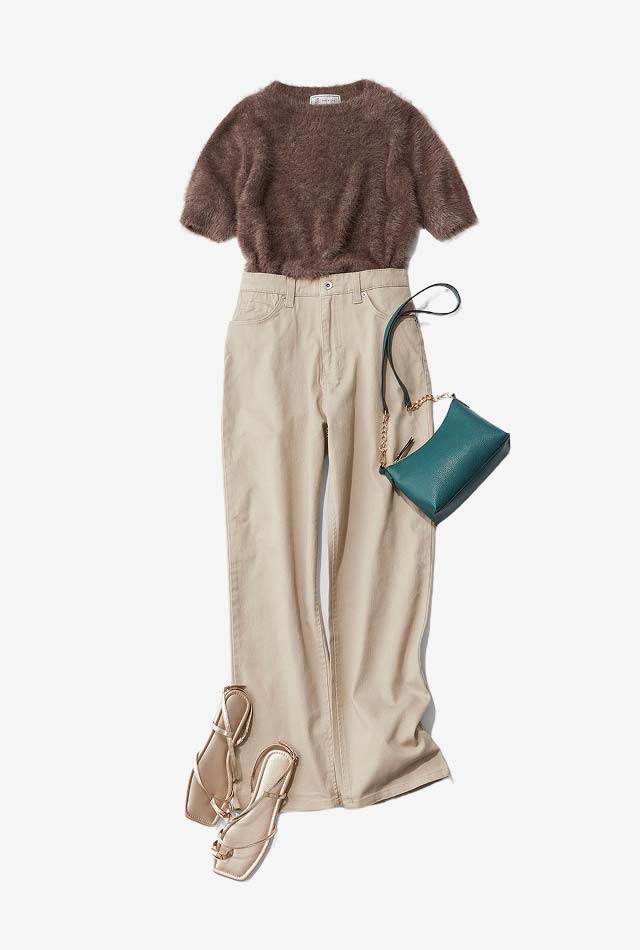トップスにフェザーを投入するだけで、いつものカジュアルコーデをレディに底上げ。
