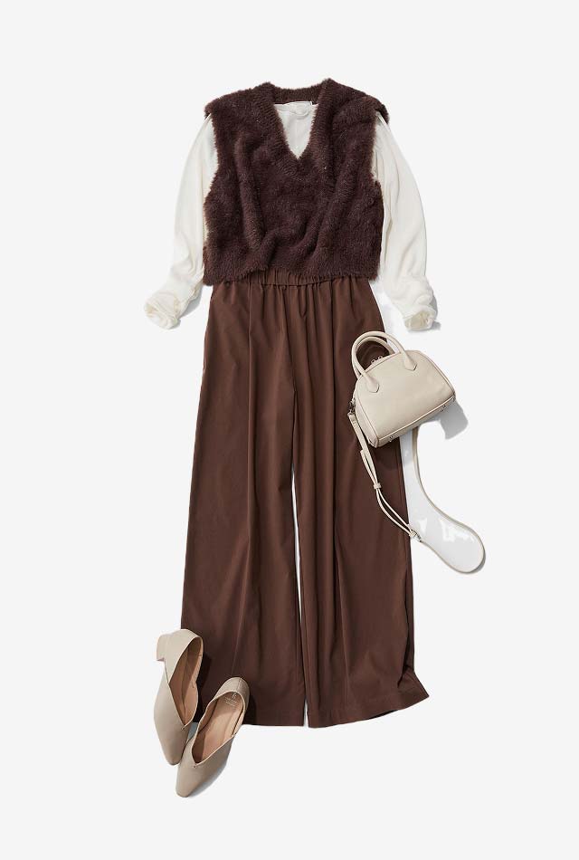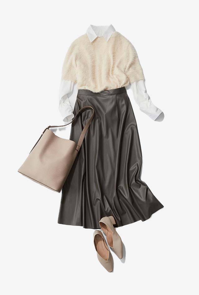 一見難しそうな異素材アイテムは、ワントーンで大人にまとめれば万事解決。野暮ったくならないように小物はコンパクトにするとgood。
