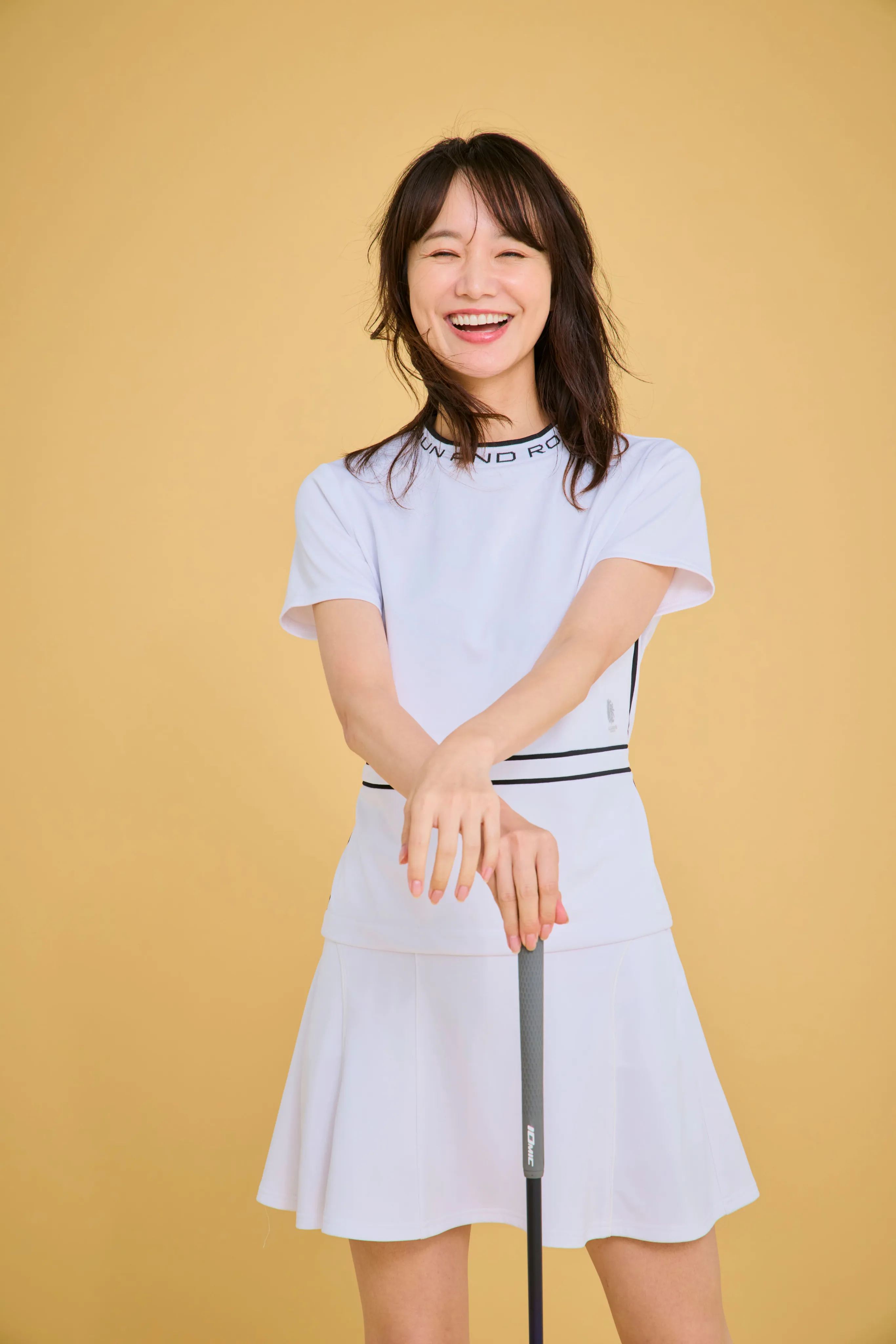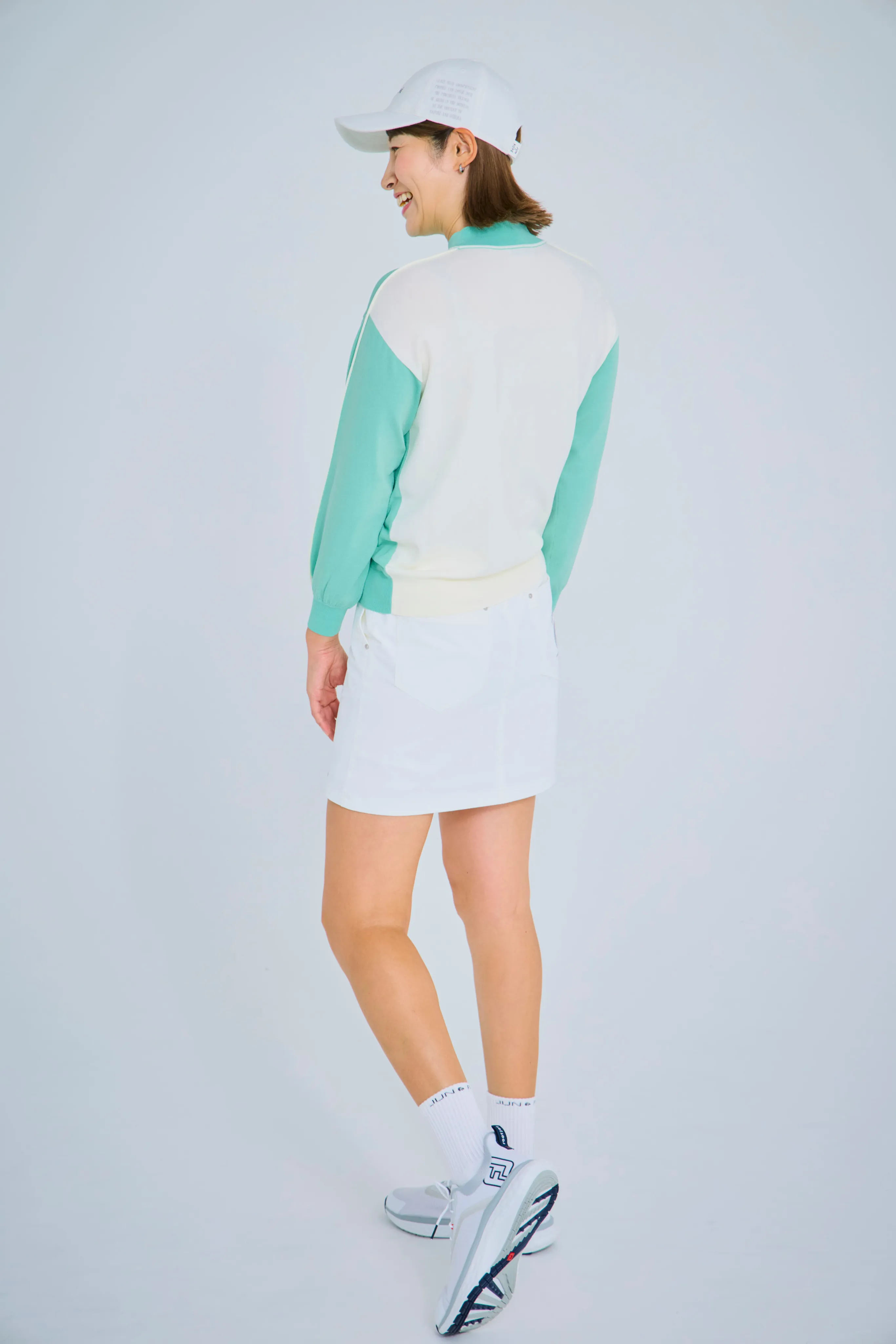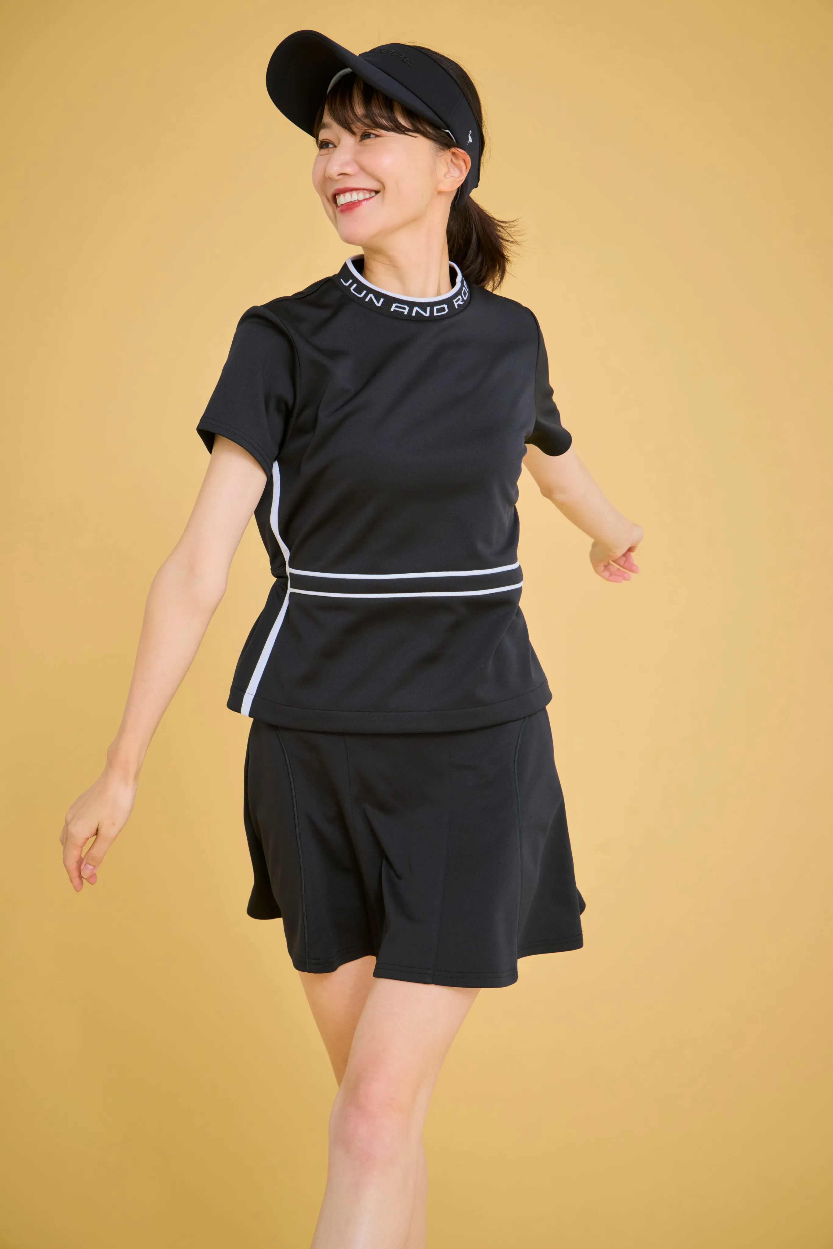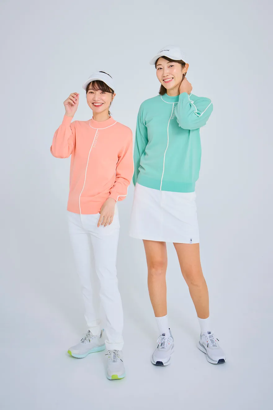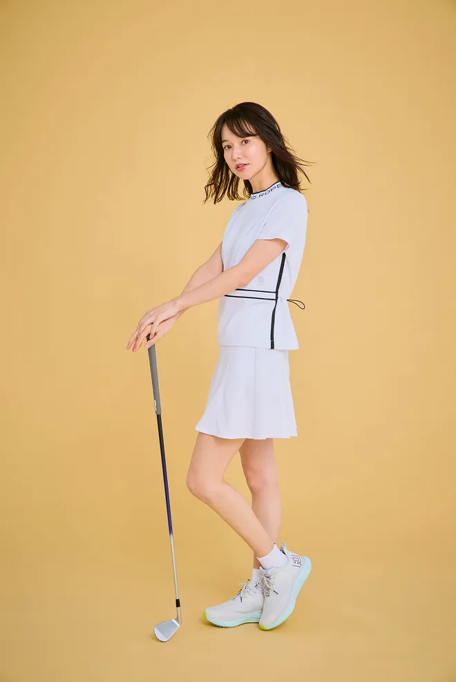 トップスは、誰が着てもきれいに見えるシルエットにこだわりました。パンツの日はウエストを絞ってすっきりと、スカートの日はゆるめてふんわりと。サイドのラインで、さりげなく細見えもプラスしています。スカートはスイングしたときの動きがきれいに出るよう、甘さ控えめのシルエットに仕上げました。