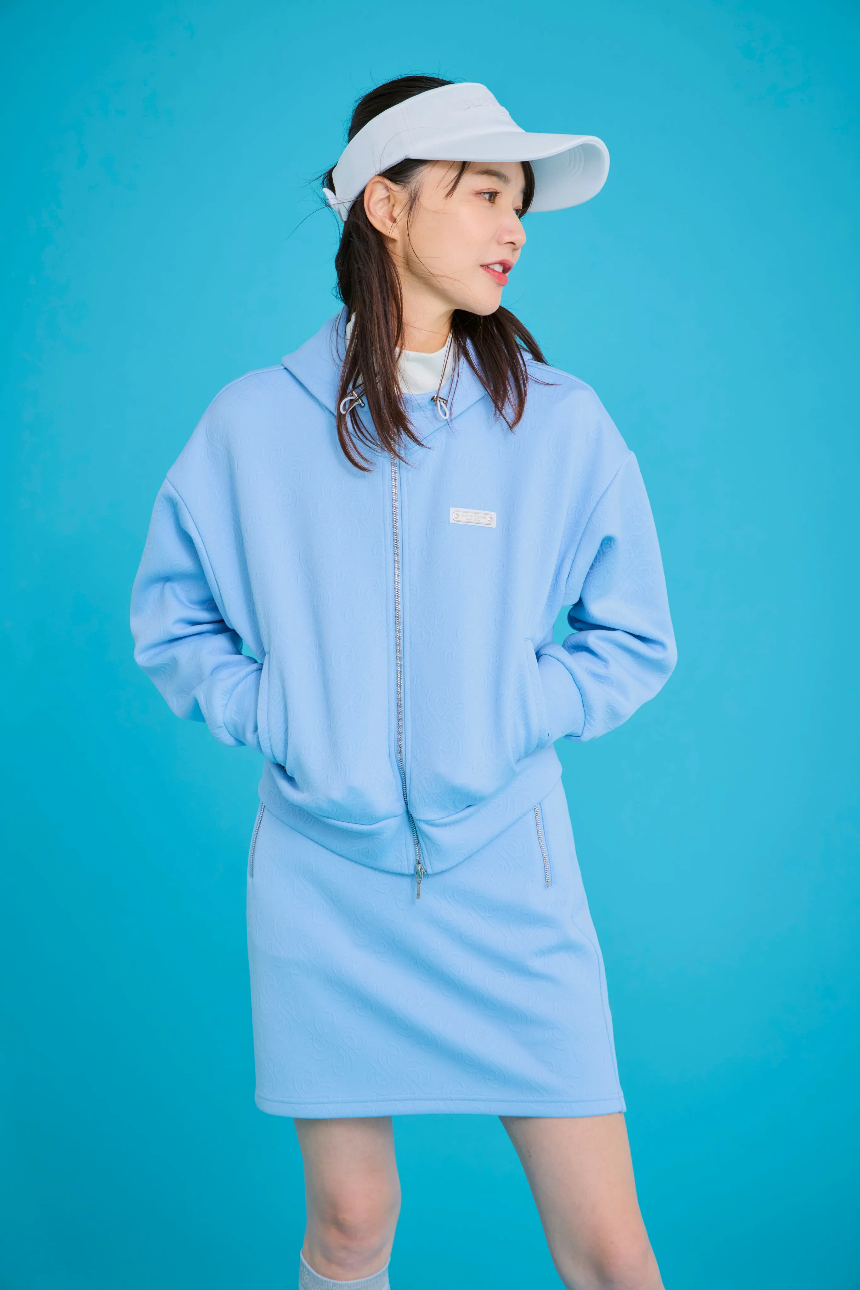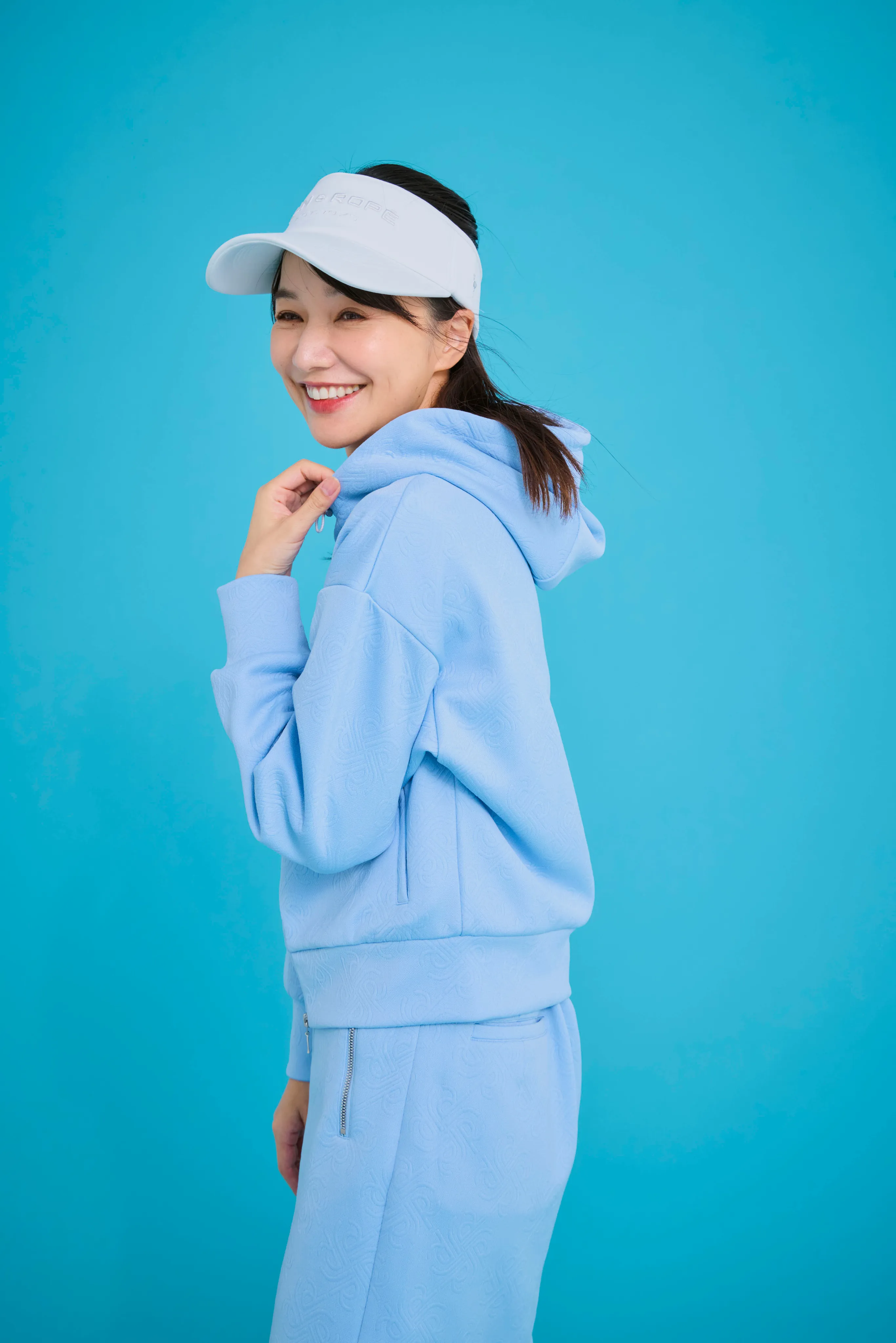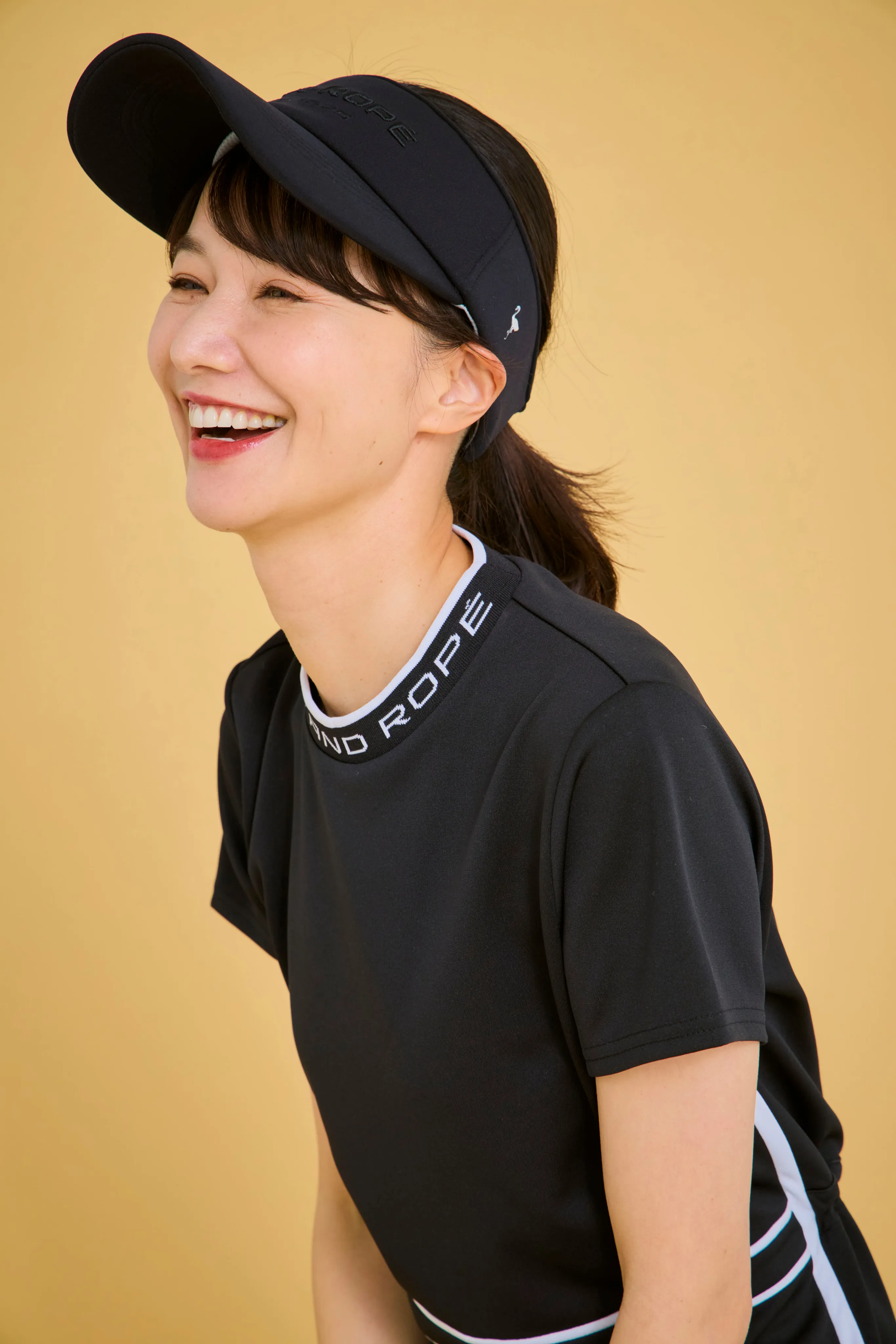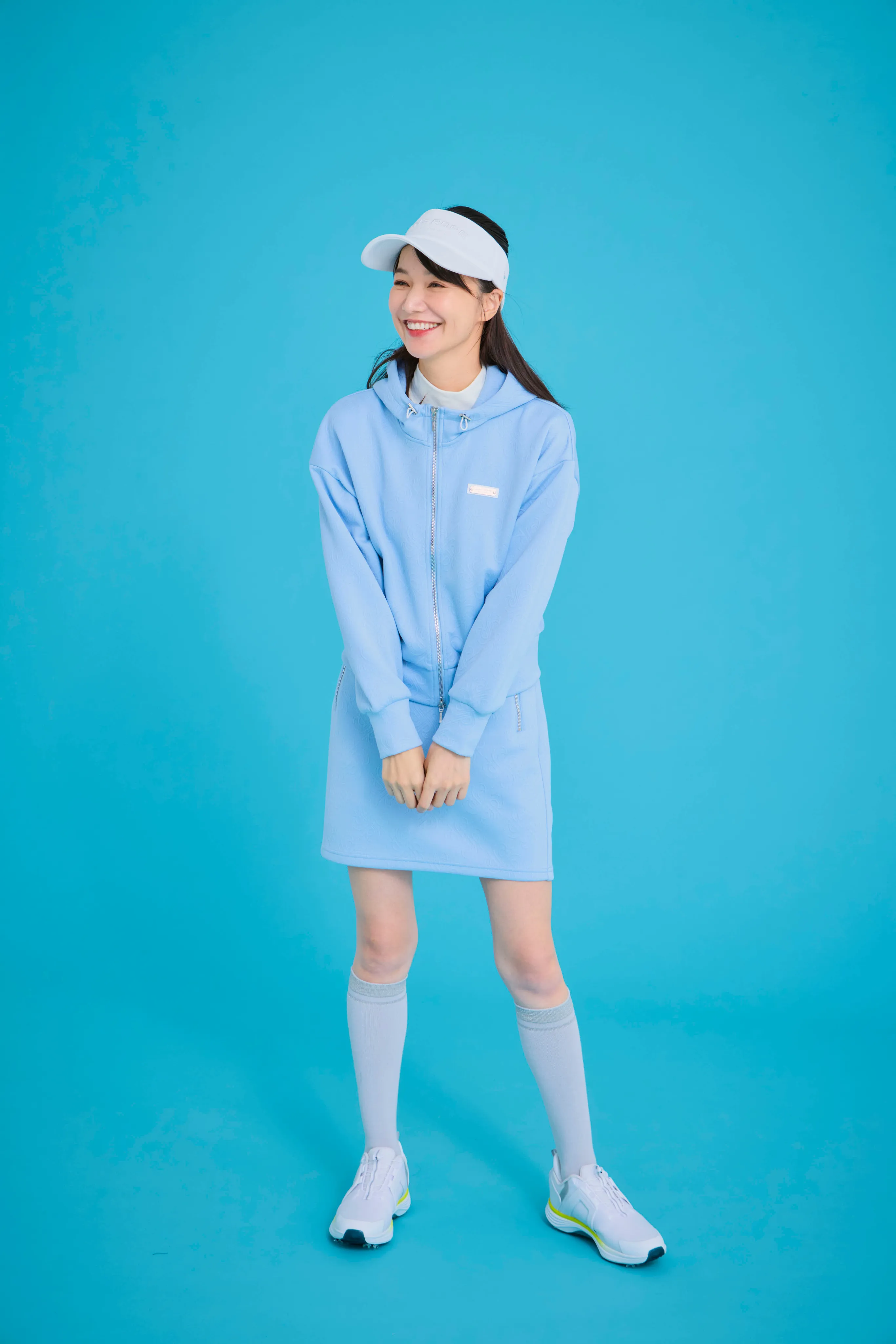 トップスは、誰が着てもきれいに見えるシルエットにこだわりました。パンツの日はウエストを絞ってすっきりと、スカートの日はゆるめてふんわりと。サイドのラインで、さりげなく細見えもプラスしています。スカートはスイングしたときの動きがきれいに出るよう、甘さ控えめのシルエットに仕上げました。