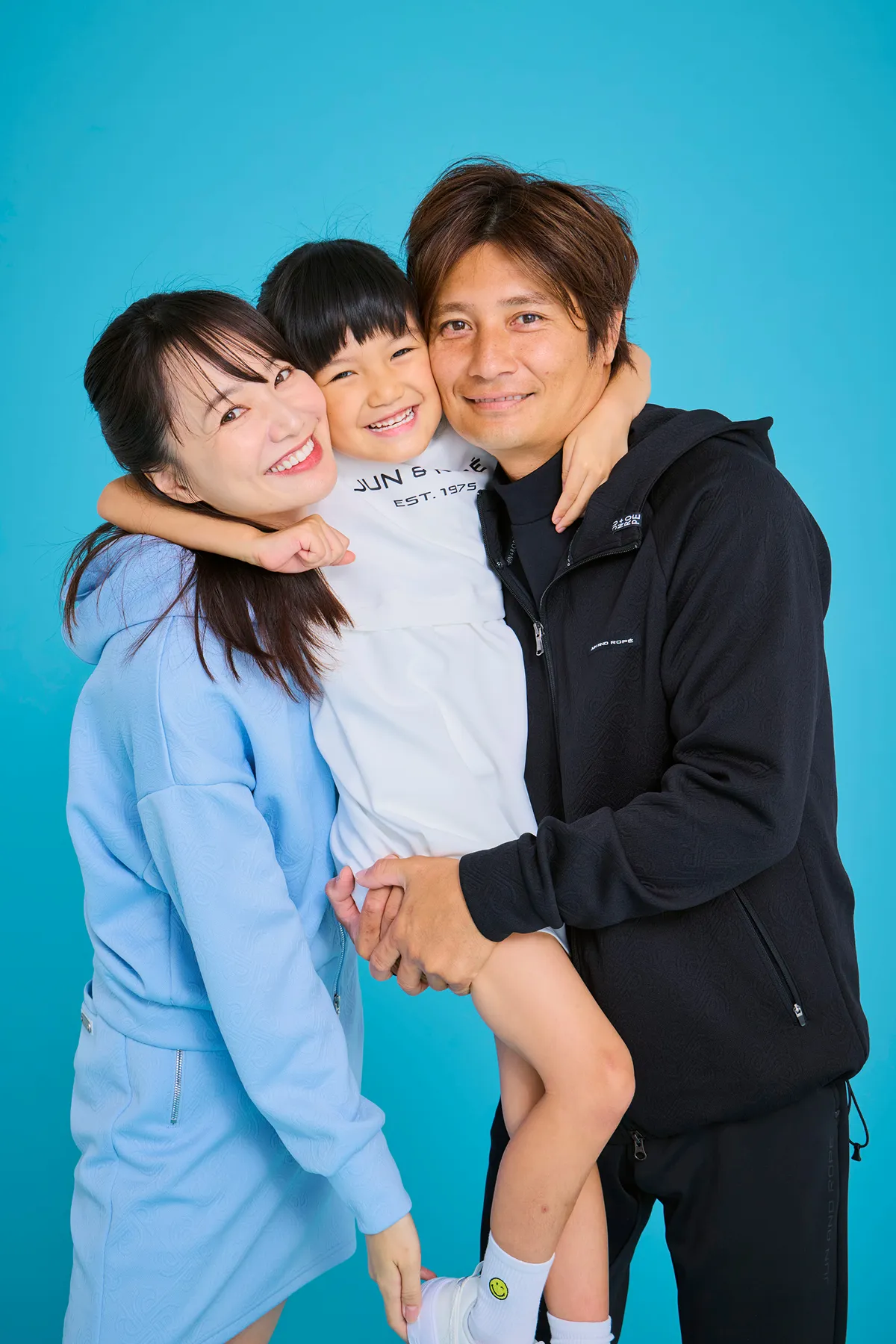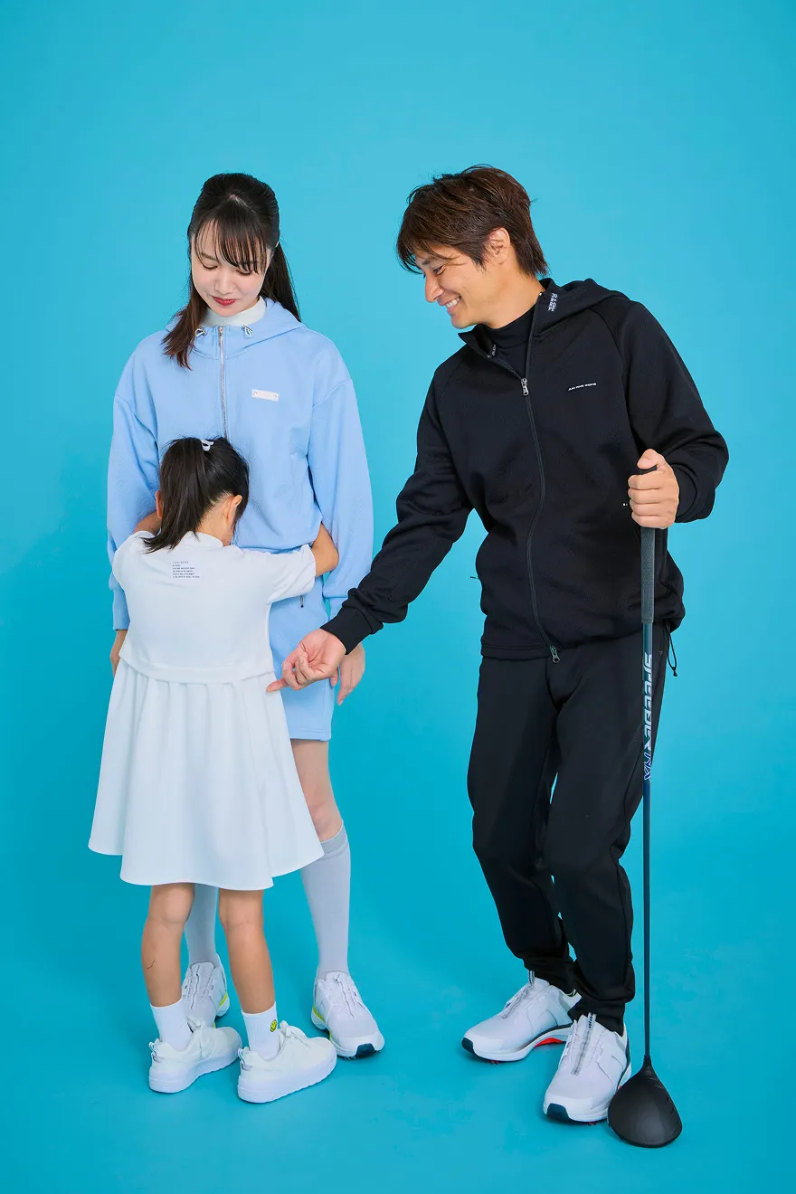 TAGS」のモチーフを、エンボスロゴでさりげなく表現したシリーズ。主張しすぎないデザインだからこそ、セットアップでも上品に着こなせるのがポイントです。私が選んだのは、爽やかさと品のあるキレイめなブルー。旦那はシックにまとまるブラックをセレクトして、さりげないリンク感を楽しみました。色を合わせすぎないことで、それぞれの個性も大事に!!