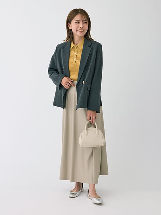 ベルトデザインが印象的なキルトスカートが同シリーズに新登場。ジャケットと合わせて、上品で大人な着こなしにひと役。ロング丈で下半身のお悩みもカバーできるのも推しポイントです。