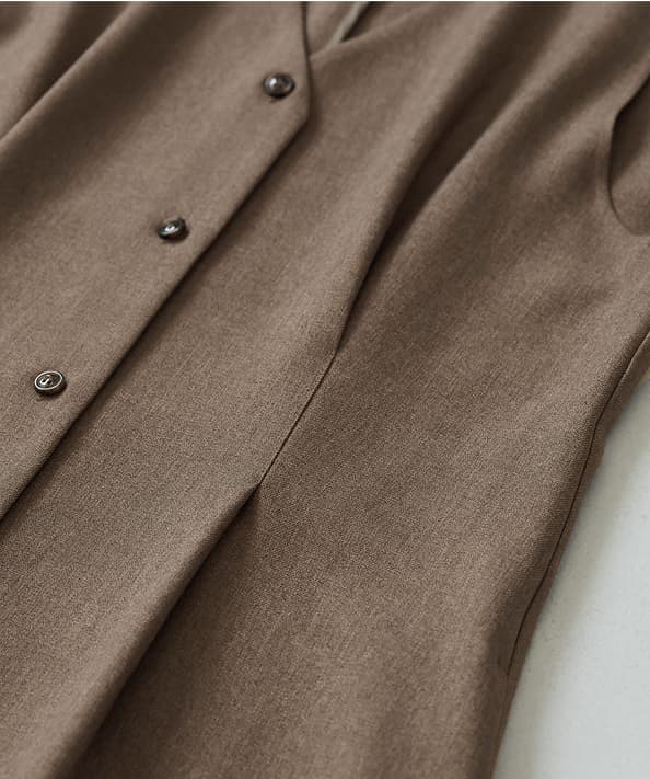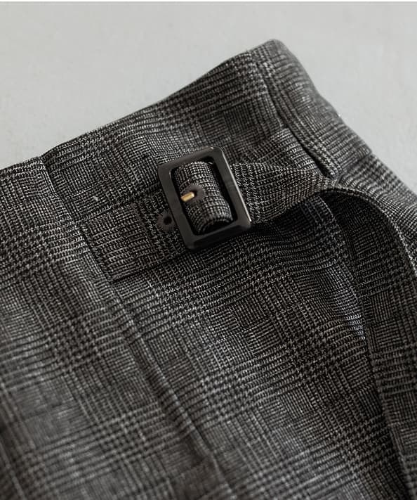ウエストのベルトディテールがクラシカルで、どこか落ち着いた品を纏わせています。シワになりにくい素材なので、気になる座りジワも軽減してくれます。
