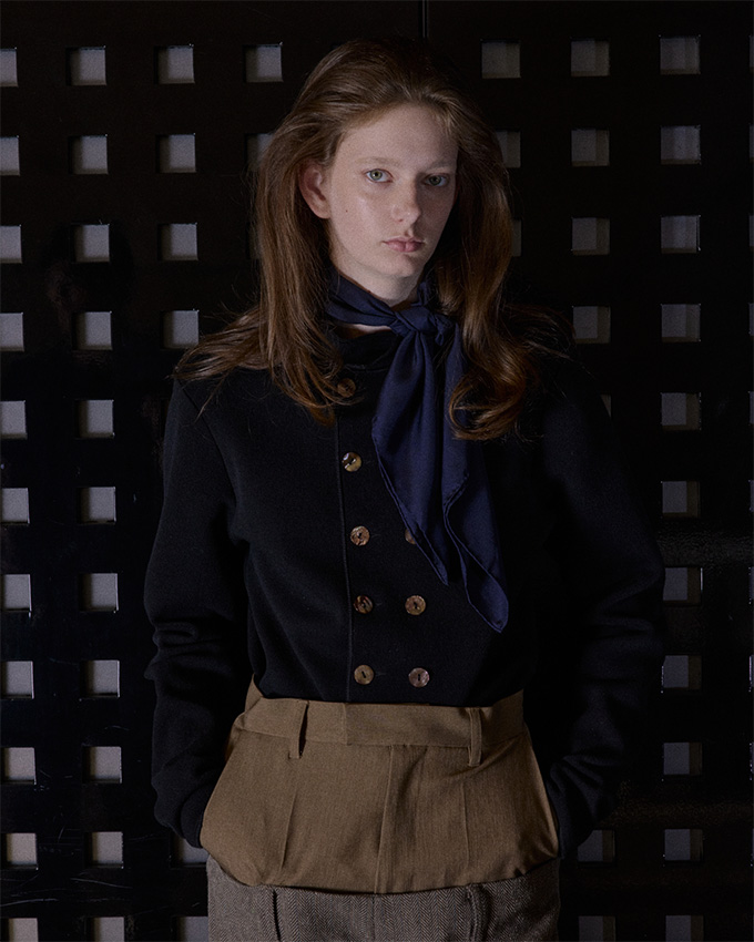 「スノッブ(snob)」という言葉には“気取り屋”という否定的な意味がありますが、本コレクションではそれを“都会的でモダンな美意識”として再定義。80年代の男性的ファッションが放っていた欲望や誇り、自己決定といった力強さに、ムウトアールならではの視点で「気取り」や「見栄」を重ね、現代的に再構築しています。