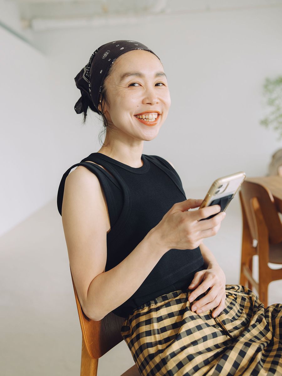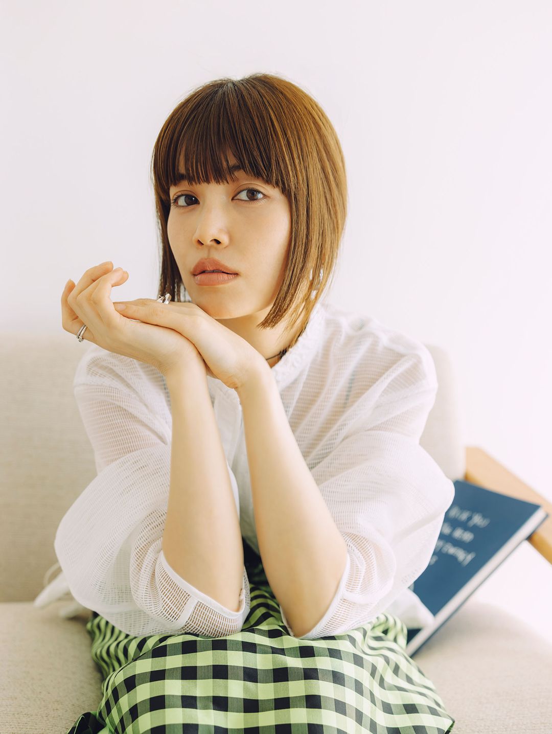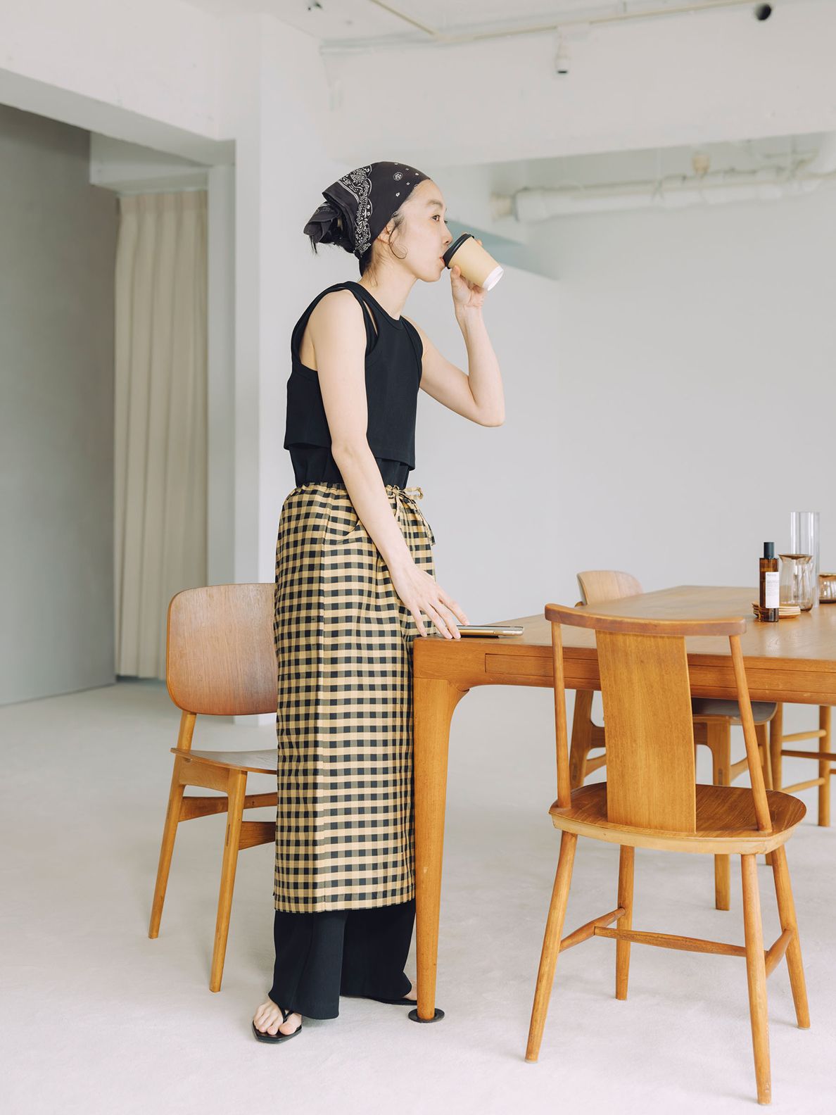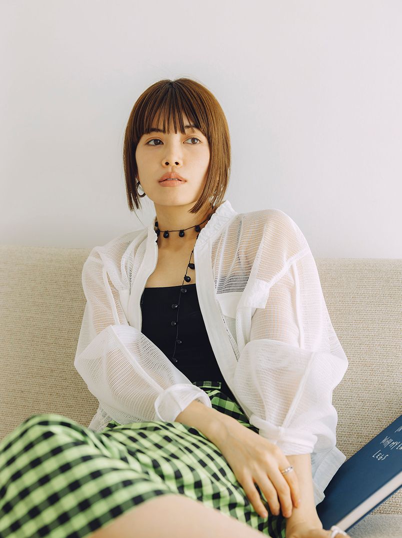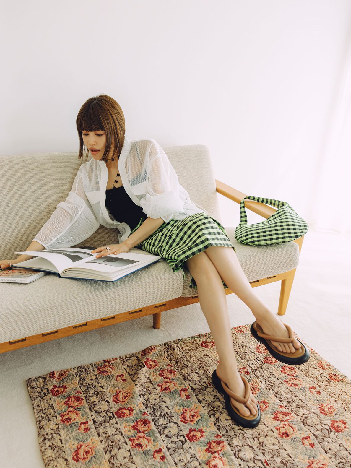 グリーンのギンガムチェックを随所に効かせたキャッチーな着こなしが、垣内さんの持つ空気感によくお似合い。白シャツ感覚で羽織ったメッシュブラウスから透ける素肌が、今の気分を映し出す。
