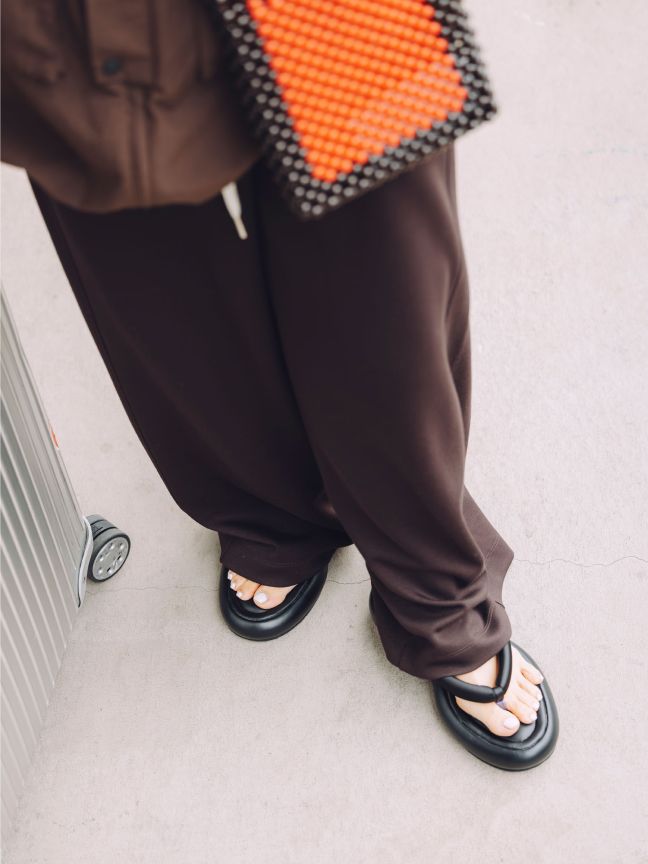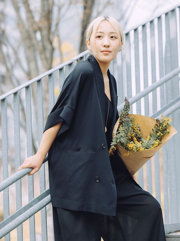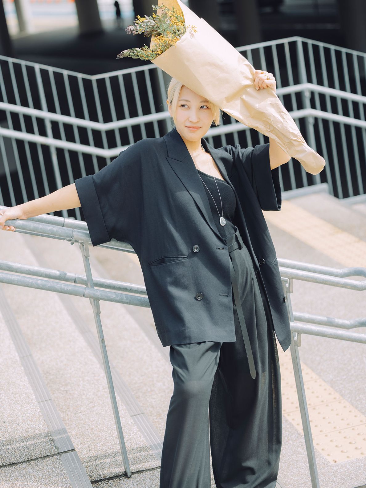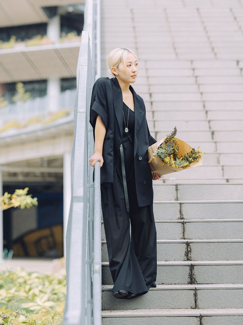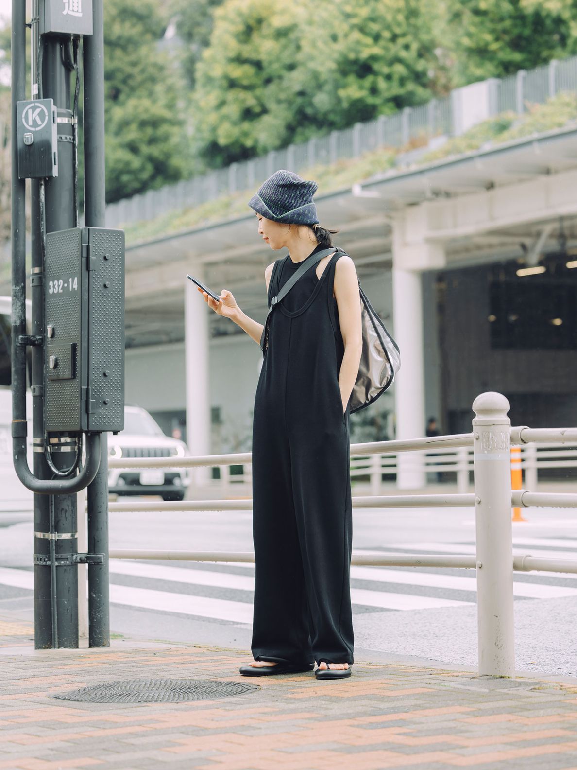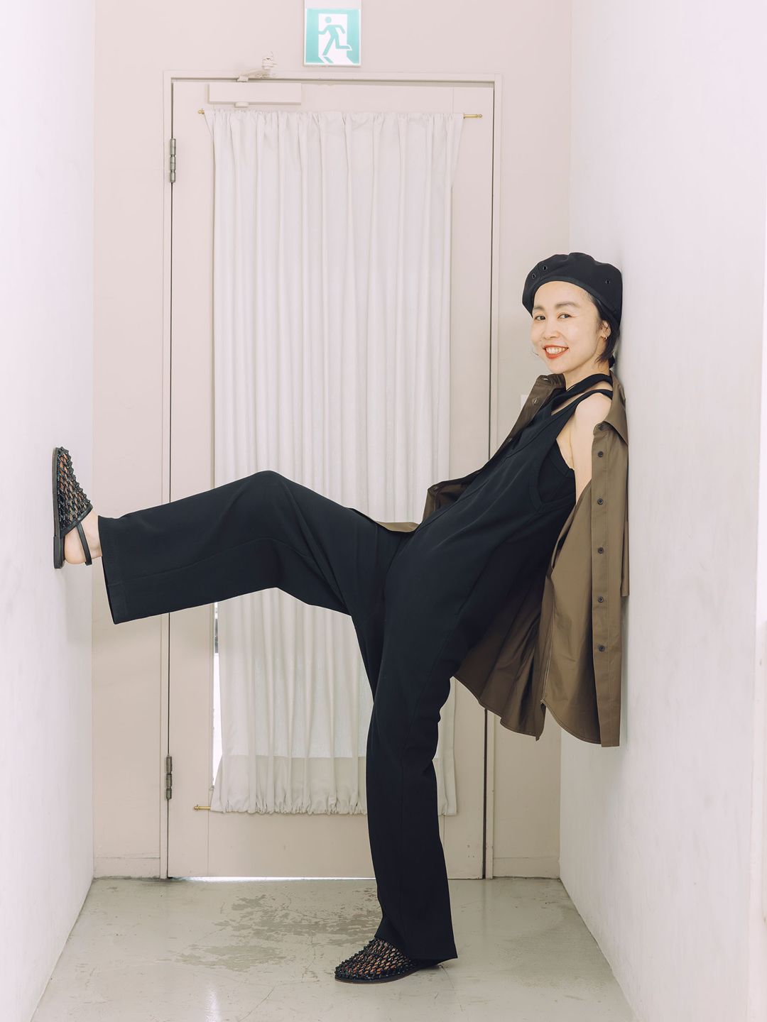 きちんと感と洒落感を両立させたい展示会では、空気感のあるシャツジャケットが大活躍。ワンショルダーのタンクトップに透け感のあるワイドパンツで、オールブラックでも軽やかな印象に。