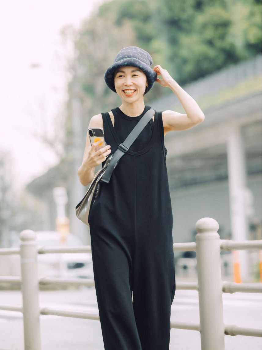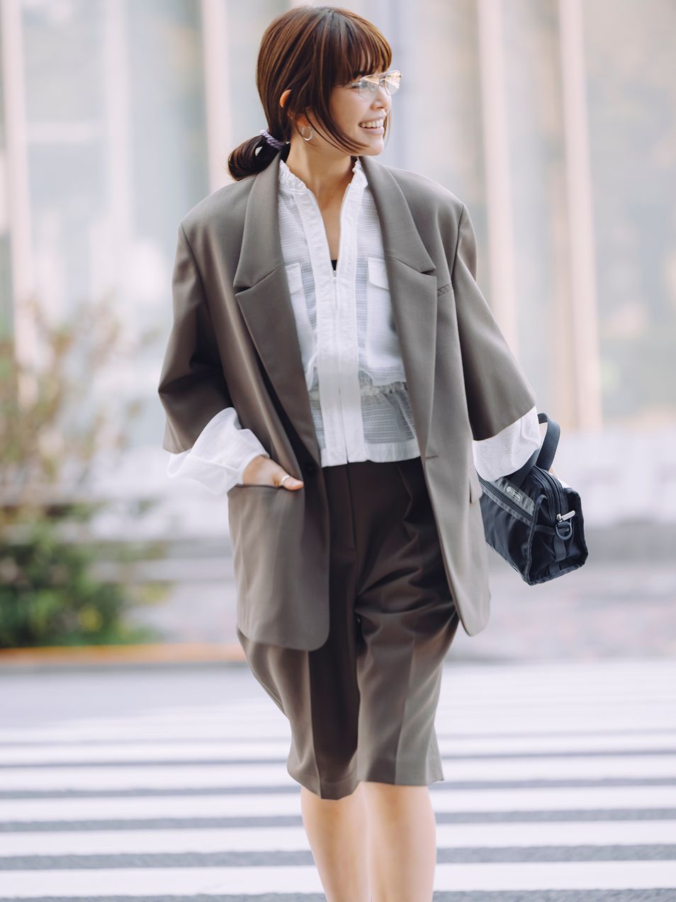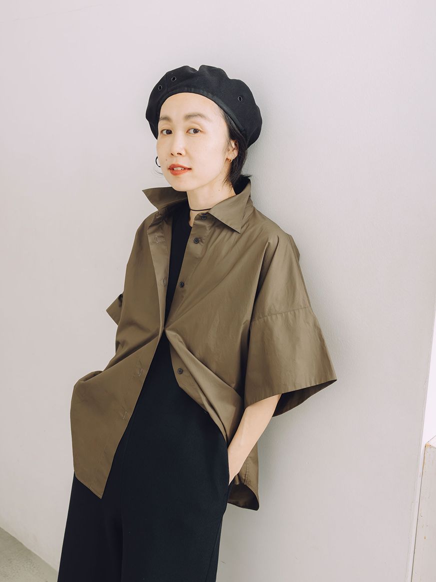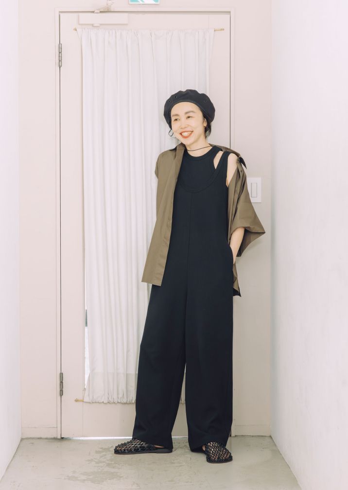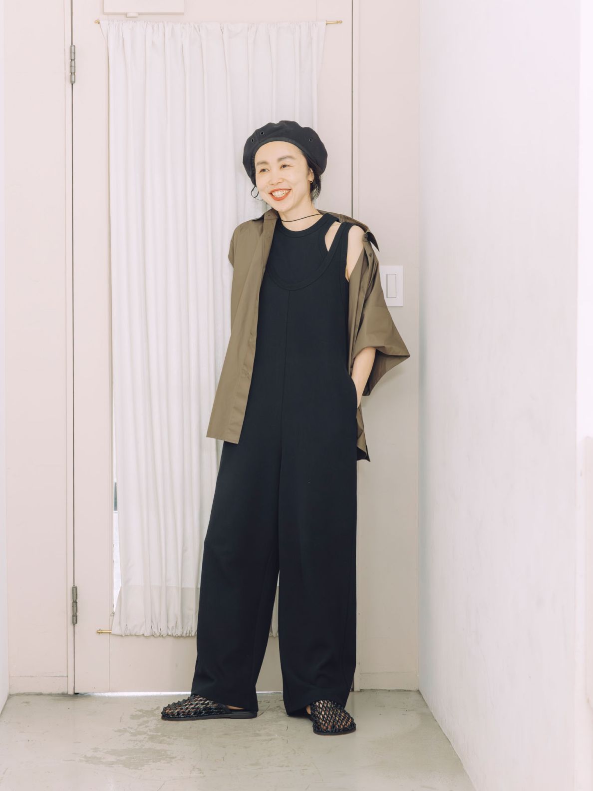 カーキのオーバーサイズシャツをさらりと羽織って、シルエットに遊びをつけた着こなし。ハリのある素材感をプラスすることで、リラックス感のあるジャージーロンパースも都会的なムードに。