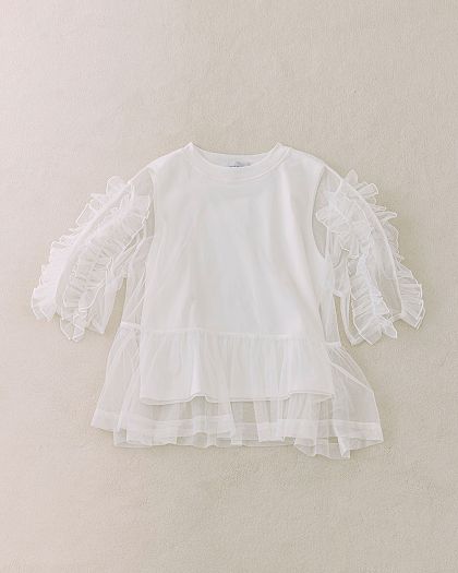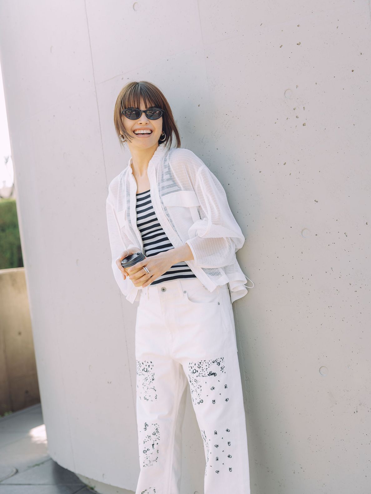 いつもの白シャツにはない、軽やかさとほどよい甘さが楽しめる技アリのスタイリング。