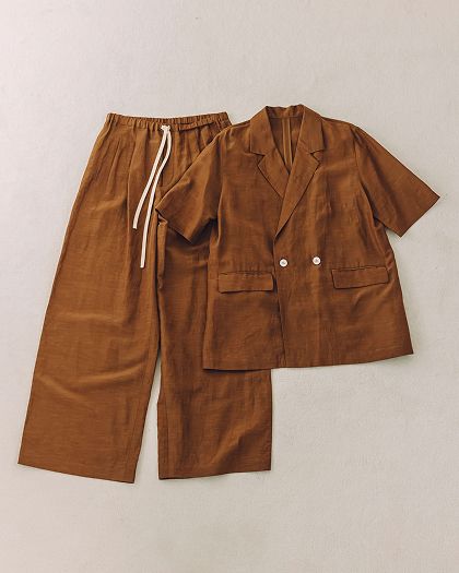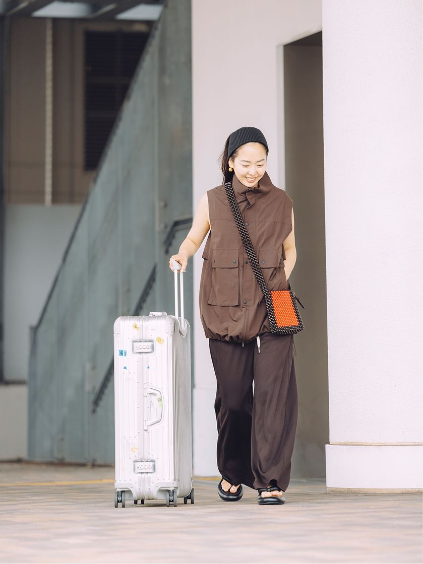 仕事で出かける旅には、動きやすさはもちろんのこと、きちんと感も大事なエッセンス。大きなポケットが効いたメンズライクなベストでつくるブラウンのワントーンコーディネートがちょうどいい。