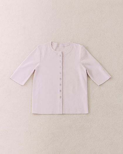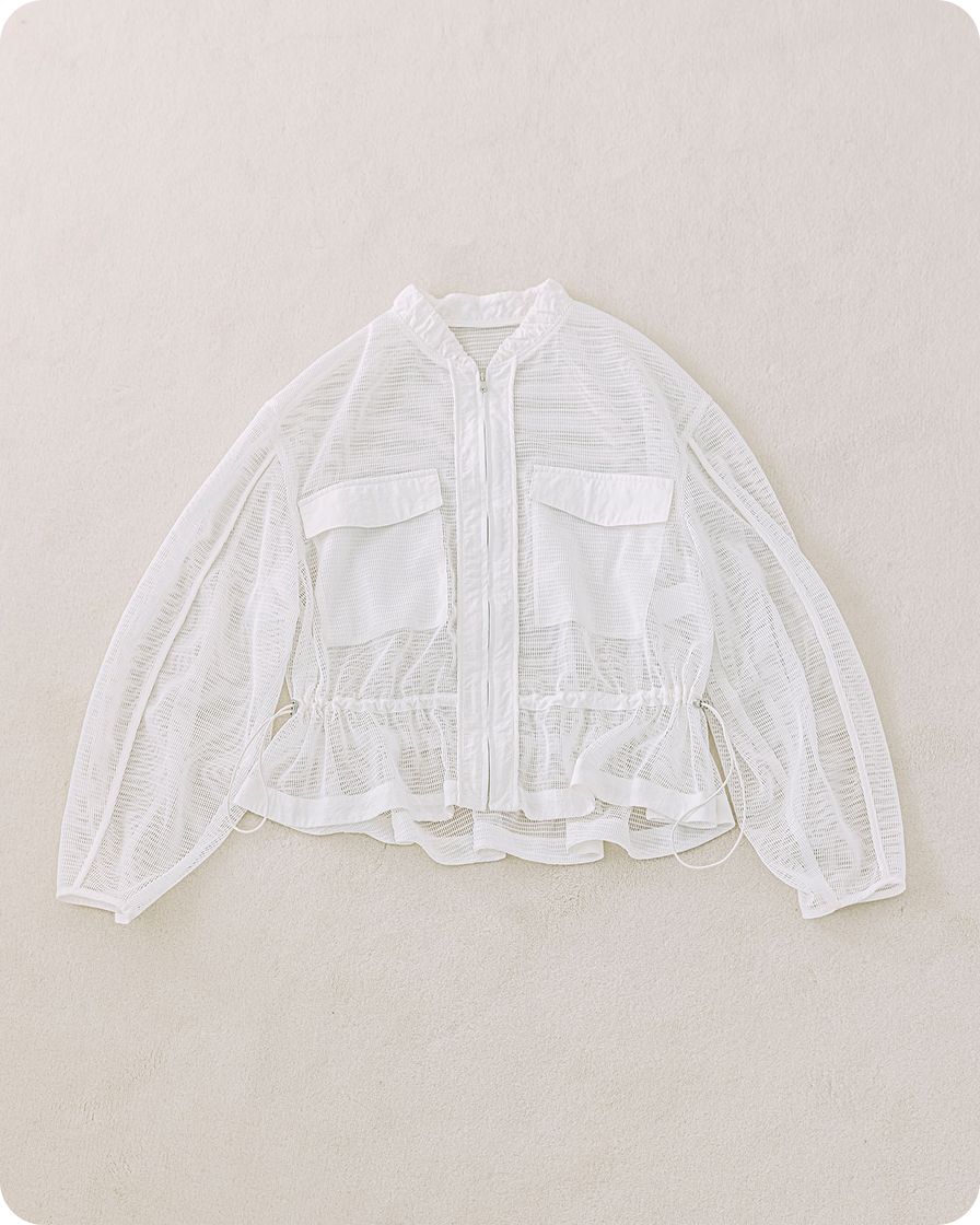 ふんわりとした袖とウエストのドロストデザインに大人の甘さを宿した、ブルゾン見えするフロントジップのメッシュシャツ。