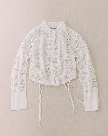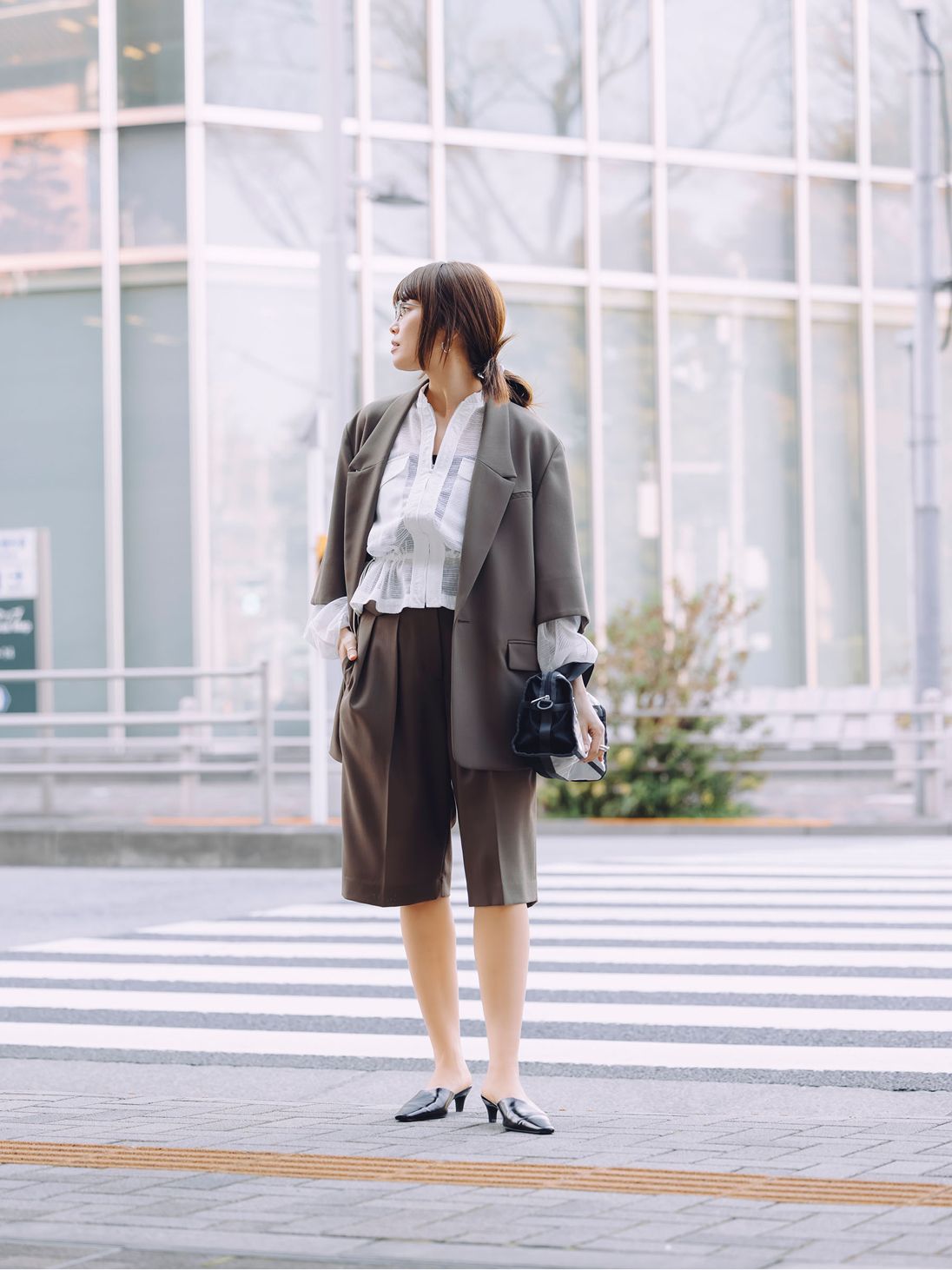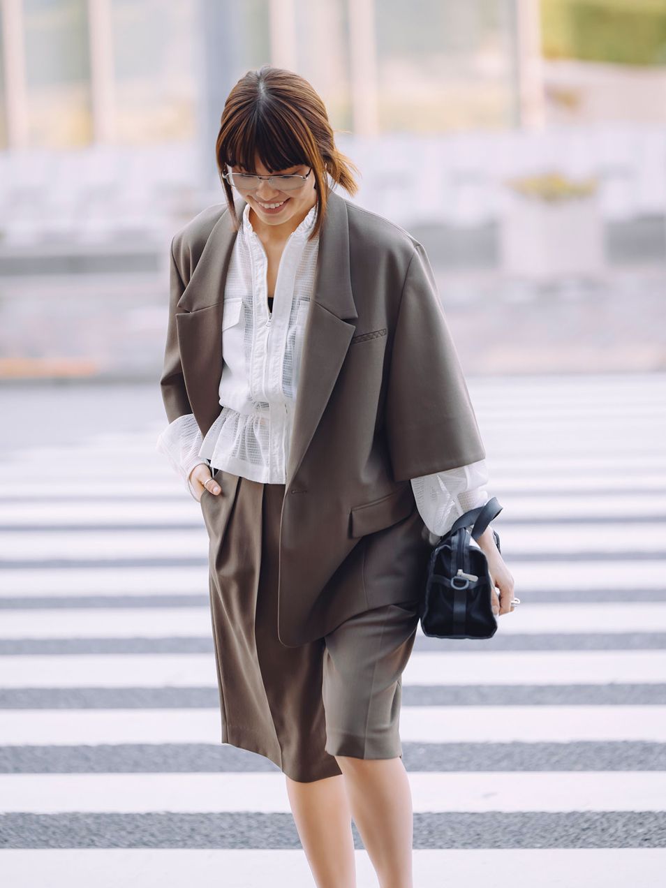 フロントを閉じて着たメッシュブラウスをクリーンなセットアップのインナーとして活用。