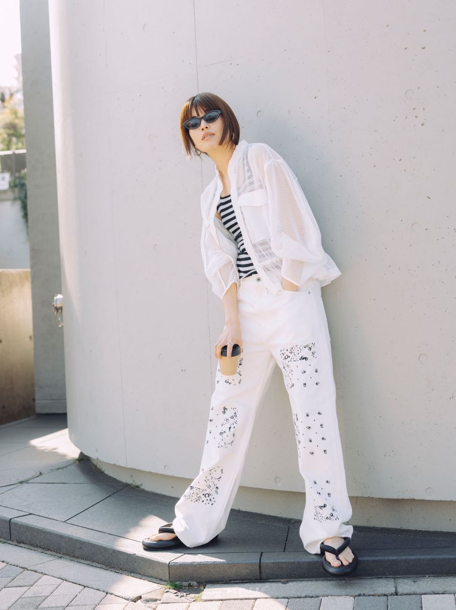 全身を白でまとめた、初夏に似合うパンツスタイル。プリントデニムとボーダーのタンクトップが、シンプルなだけじゃない洒落の効いたオーラをプラス。ビーサンタイプの足元でラフな抜け感を。