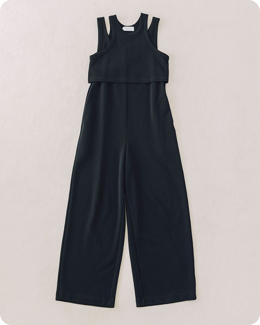 ショート丈のタンクトップがセットに。気軽にレイヤードが楽しめるジャージー素材のロンパースは、最高にイージーな着心地が魅力。
