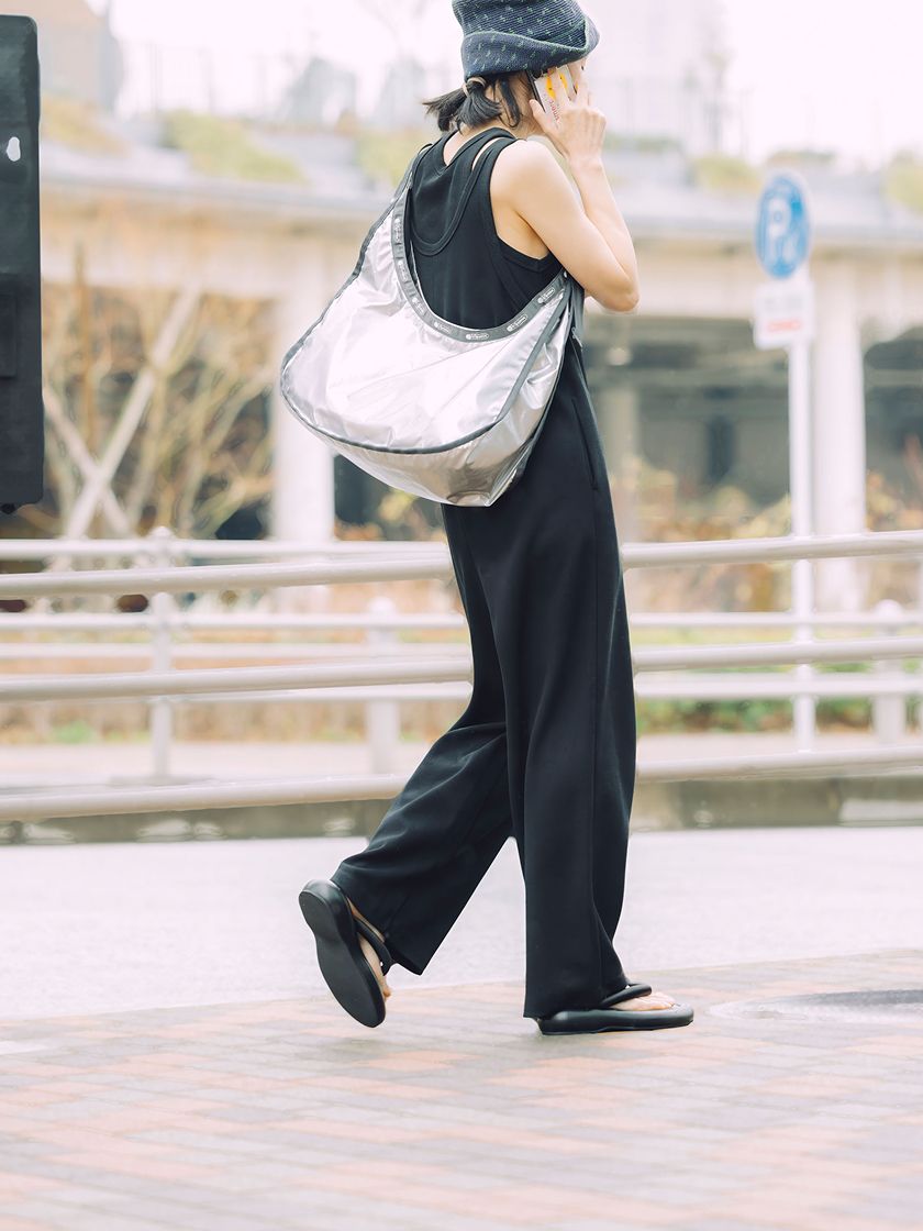 荷物が多くなりがちなキッズたちとの休日は、セットのタンクトップを中に着て、より動きやすく。両手が使えて便利なレスポートサックのショルダーは、コーディネートのアクセントになるシルバーをチョイス。