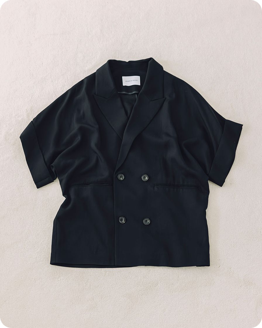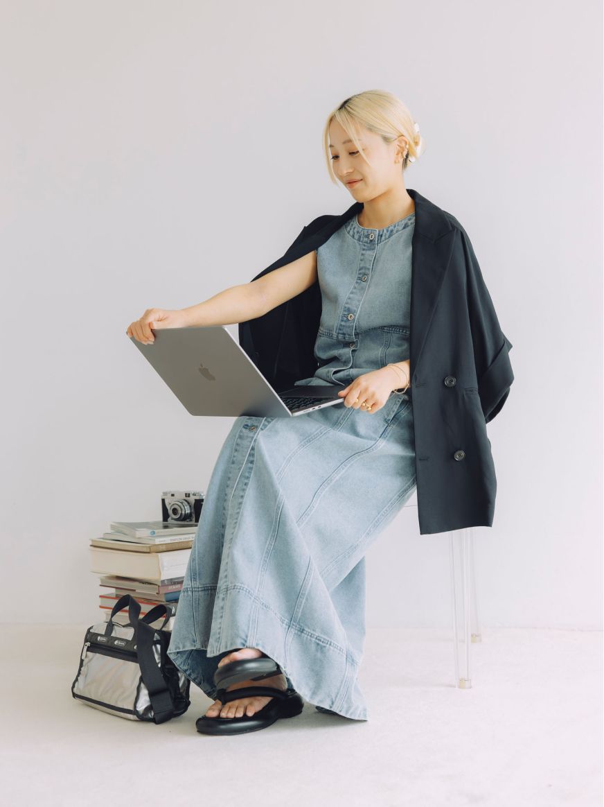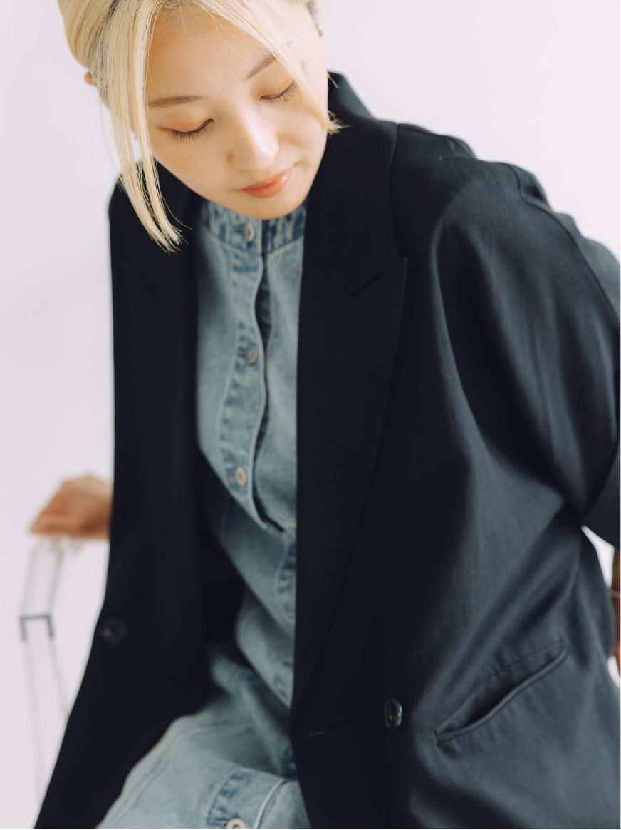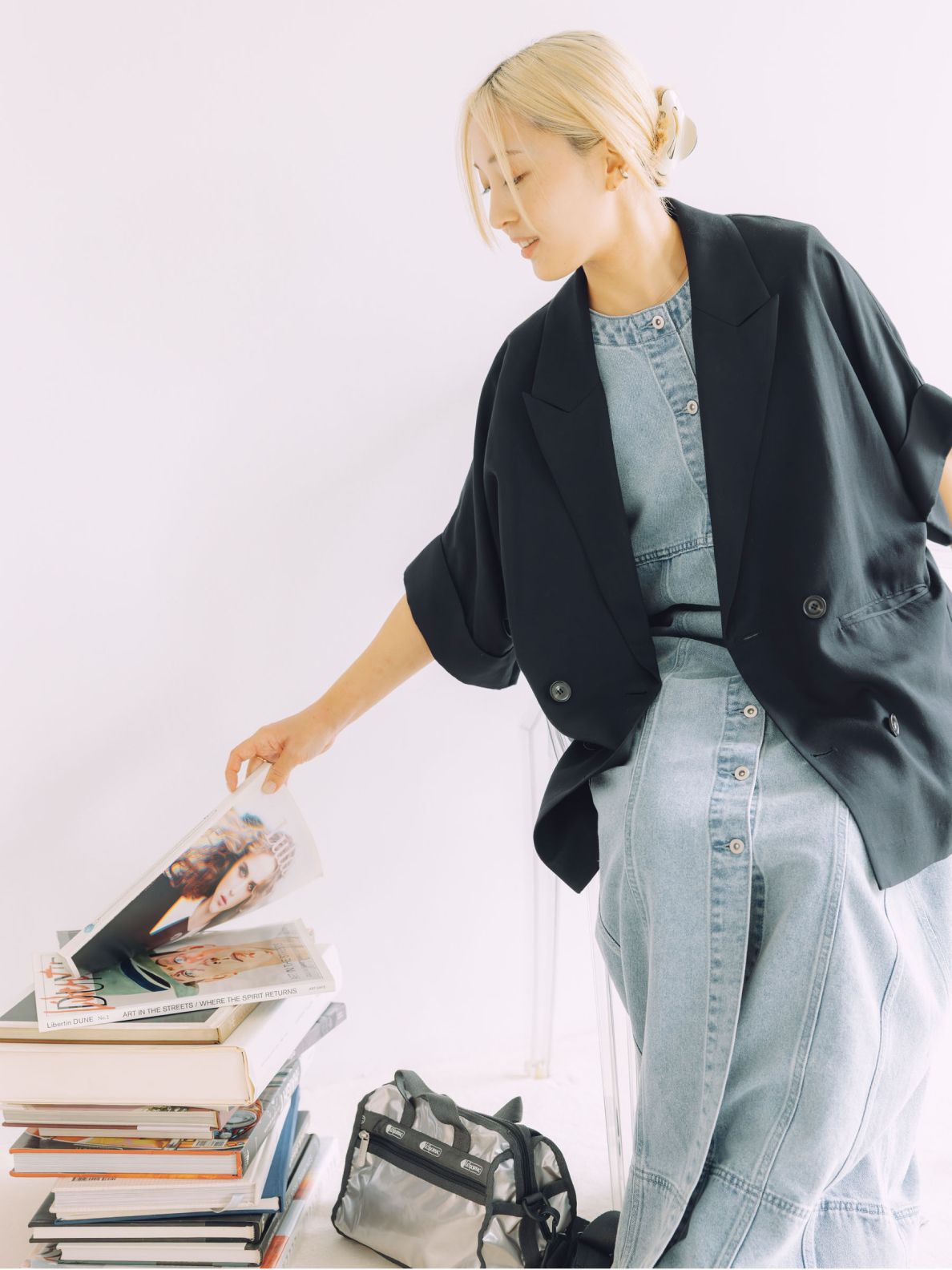 夏を感じるデニムのロングワンピースが、黒ジャケットの効果でとたんにクールな装いに。軽い着心地でシワにもなりにくいジャケットは、ストレスフリーに過ごしたいお仕事タイムに必要不可欠。