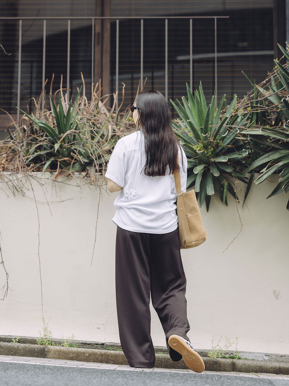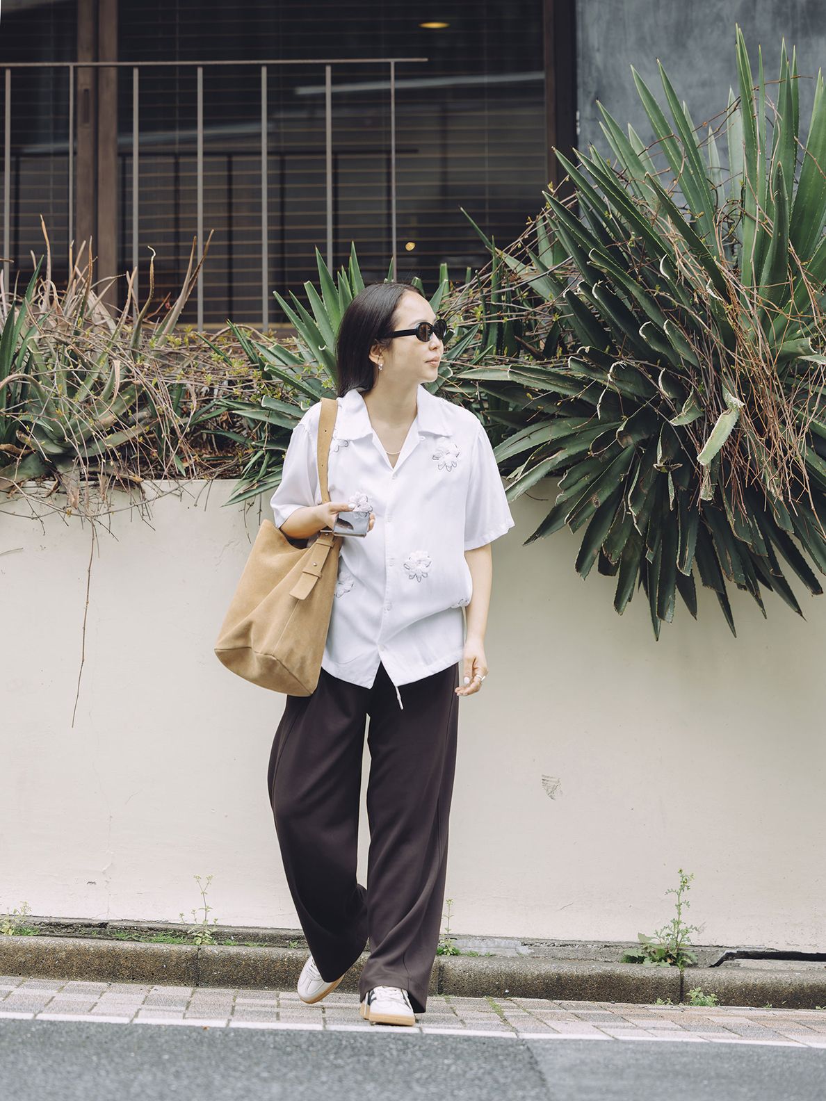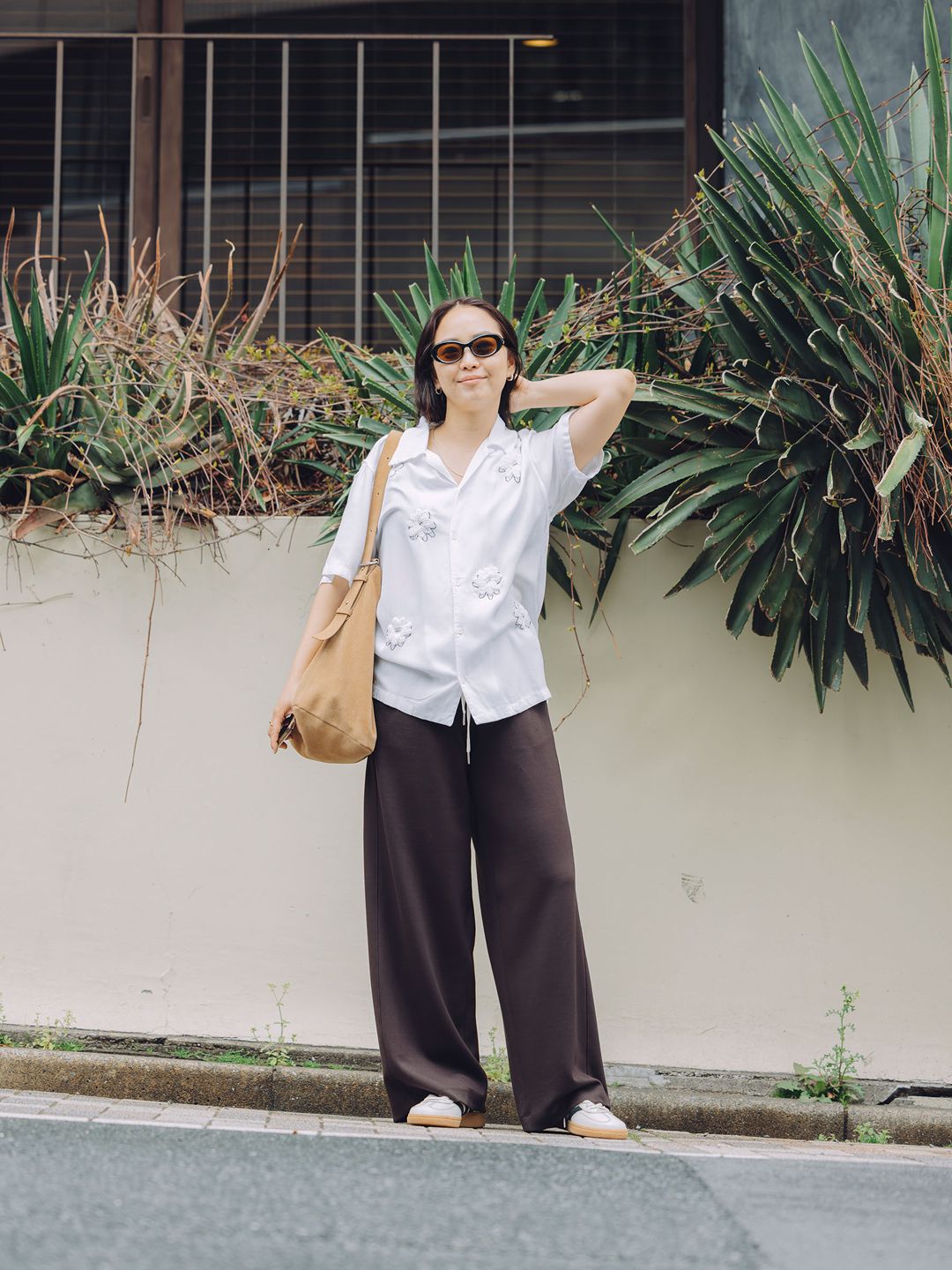 歩きやすさ重視のジャージーパンツ+スニーカーの楽ちんコーデにファッション要素をプラスしてくれるのが、フラワー刺繍が施されたオープンカラーの白シャツ。さらりと羽織るだけで、洒落感のある佇まいに。