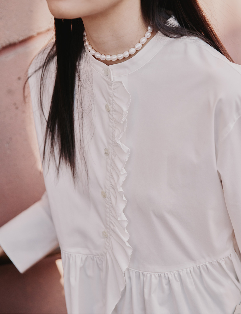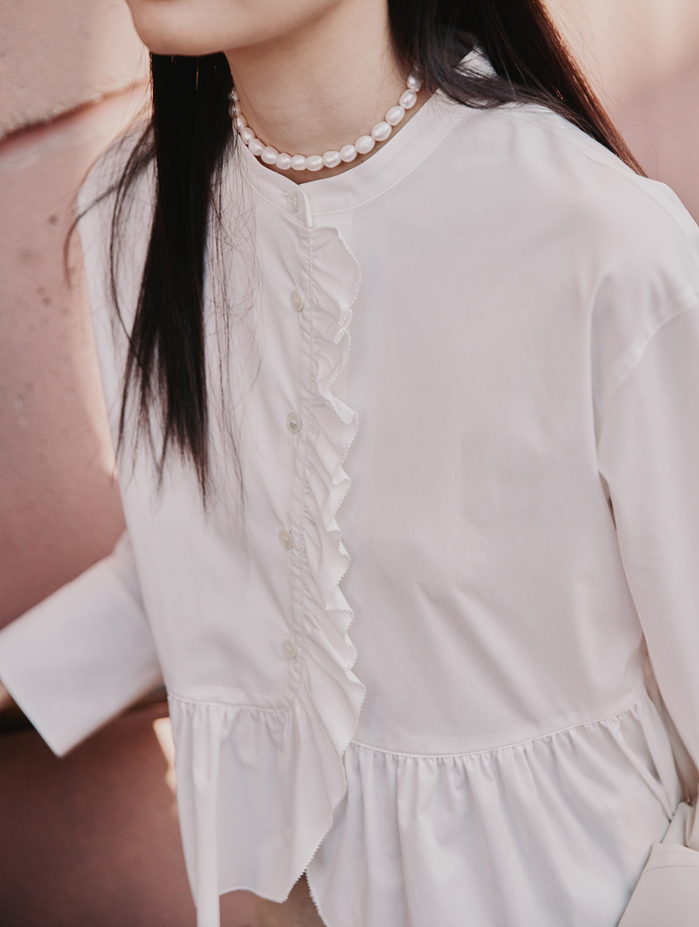 すっきりとしたバンドカラーがこなれ感を演出してくれるフリルブラウス。