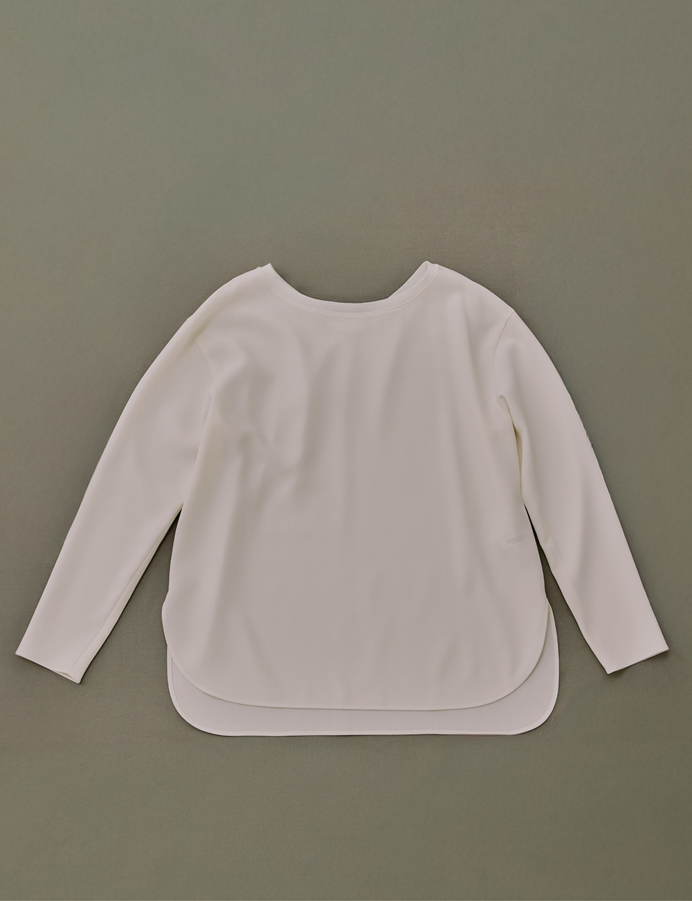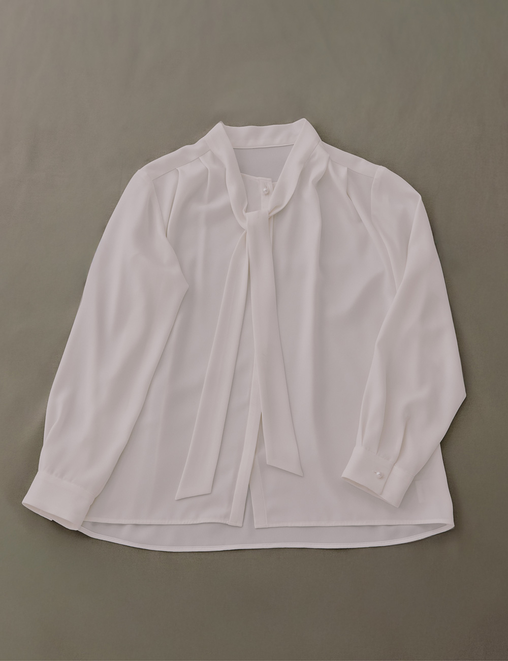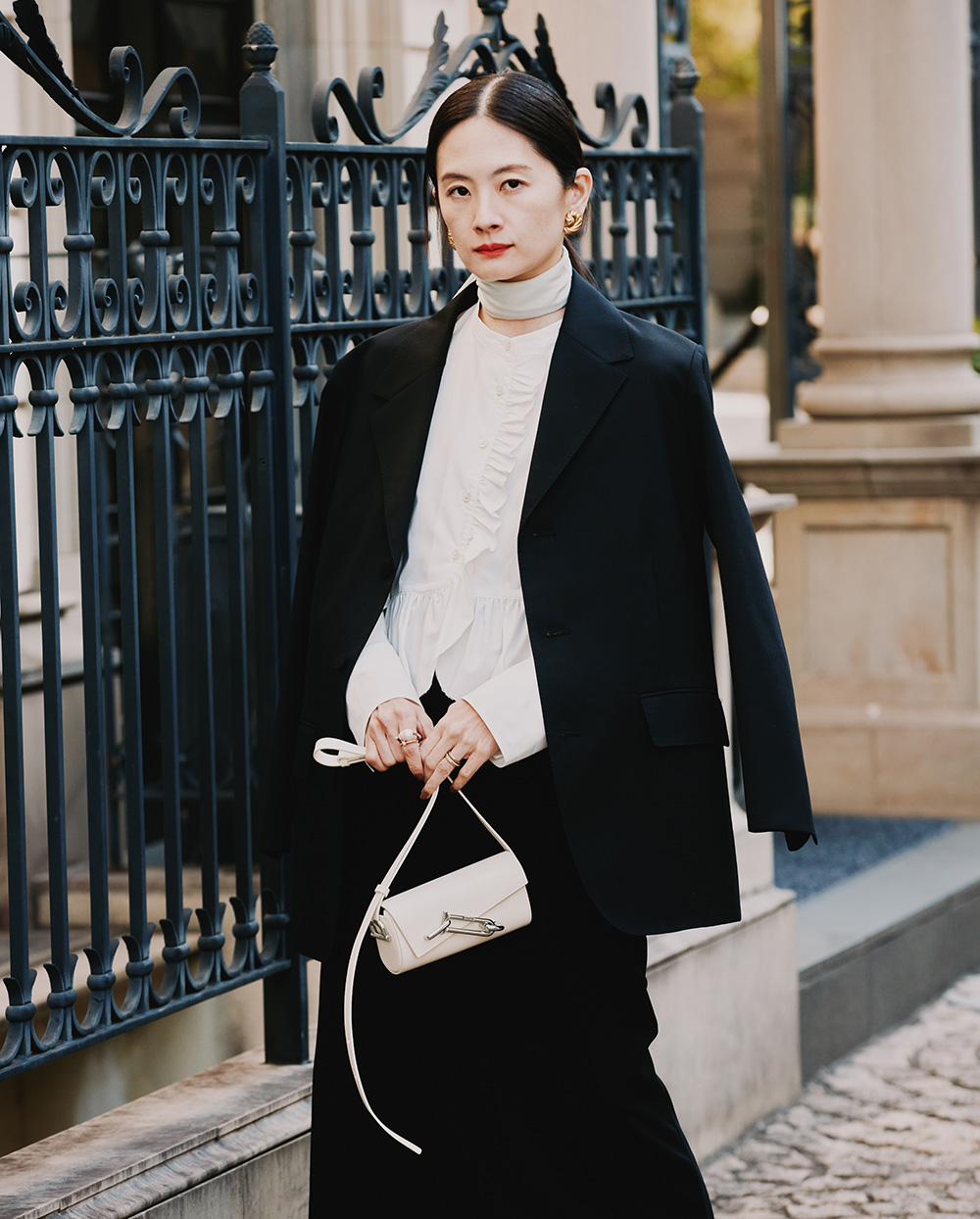 白いブラウスの見え方を黒いジャケットを羽織ることで調整しました。