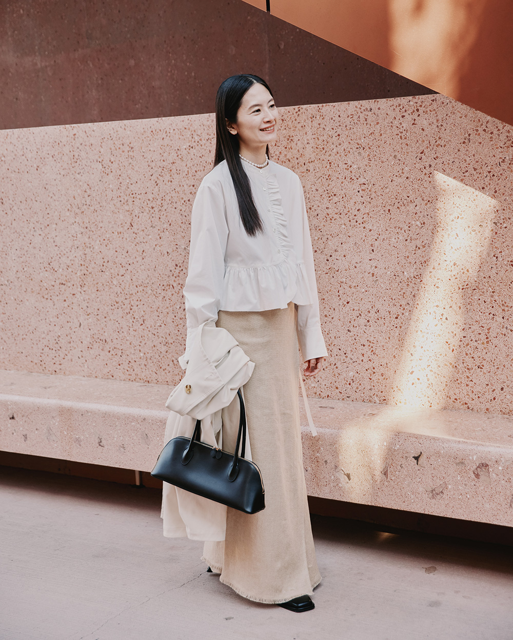 華やかな要素は1つに絞り、今回はフリルシャツを主役に、上品さは保ちながらも、どこか肩の力が抜けた装いにしました。