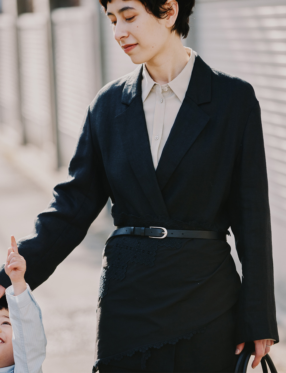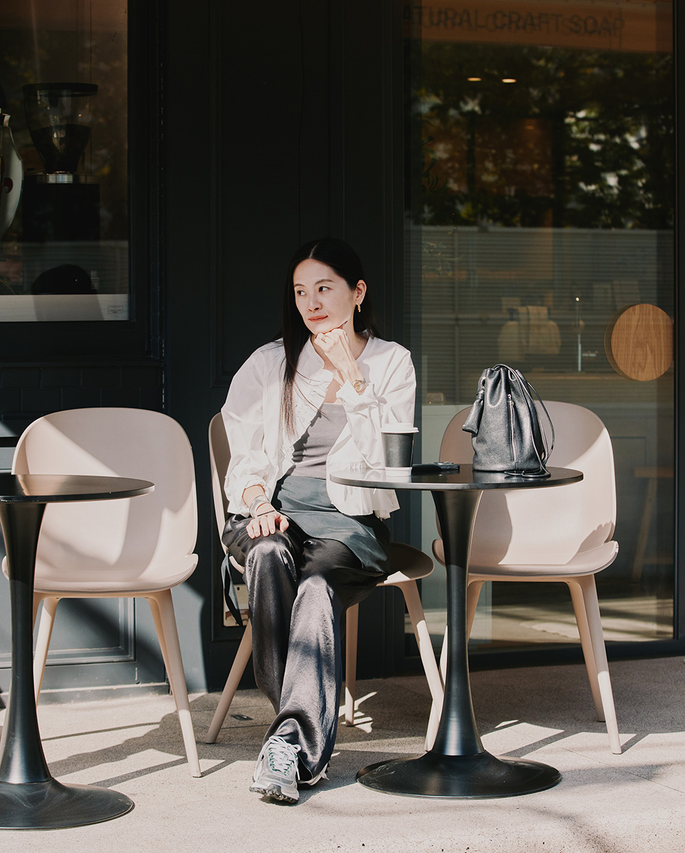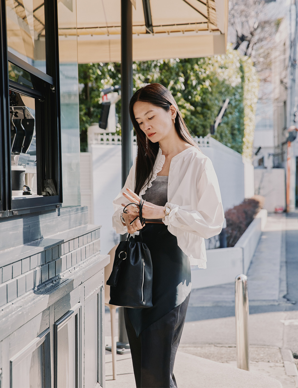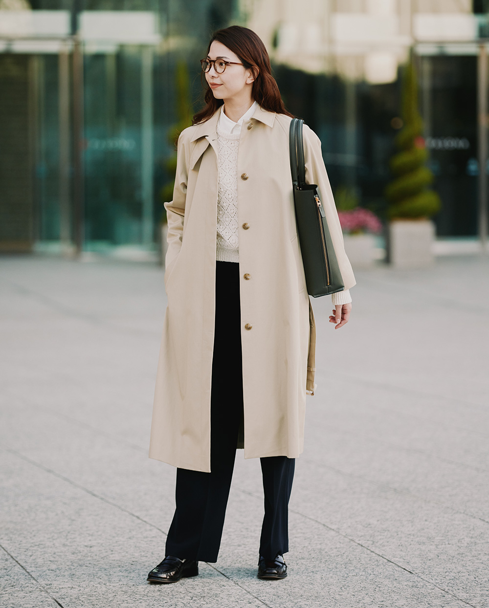 全体的に落ち着いたトーンですが、ワンポイントに茶目っ気のあるジュエリーやレザー小物を合わせてリラックスしすぎないムードを意識しました。
