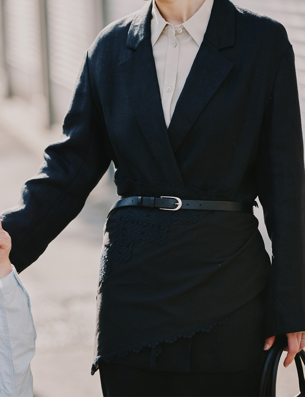 ブラックのセットアップなので、ウエストにレースのスカーフとベルトを巻いて立体感のあるスタイリングを意識しました。