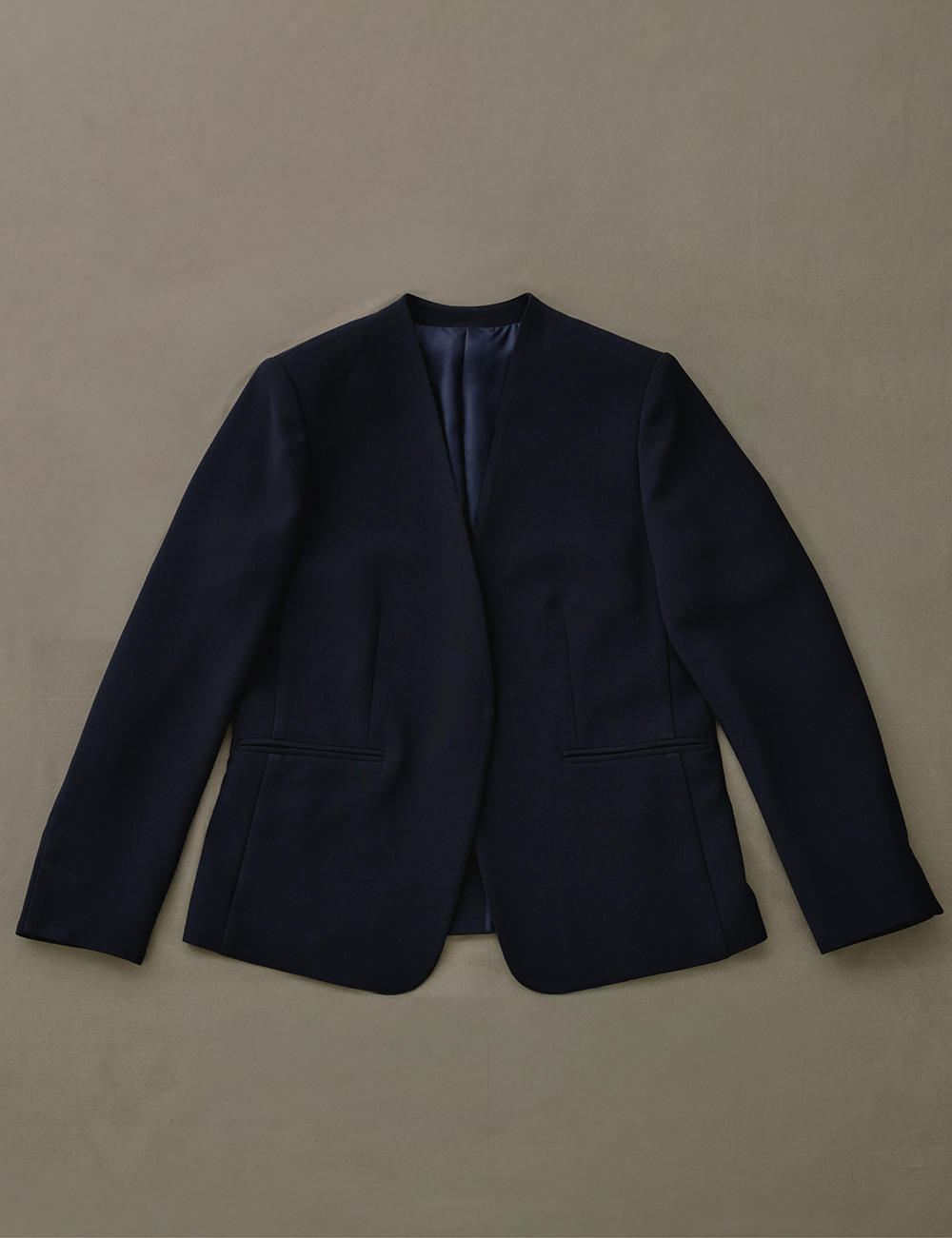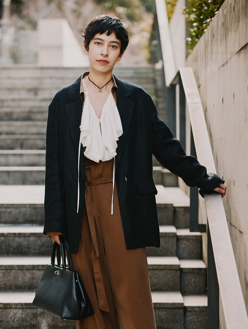 今回はマニッシュなジャケットとジャンプスーツを選び、そこにフェミニンなシャツをレイヤードすることで、程よい華やかさをプラスしてみました。