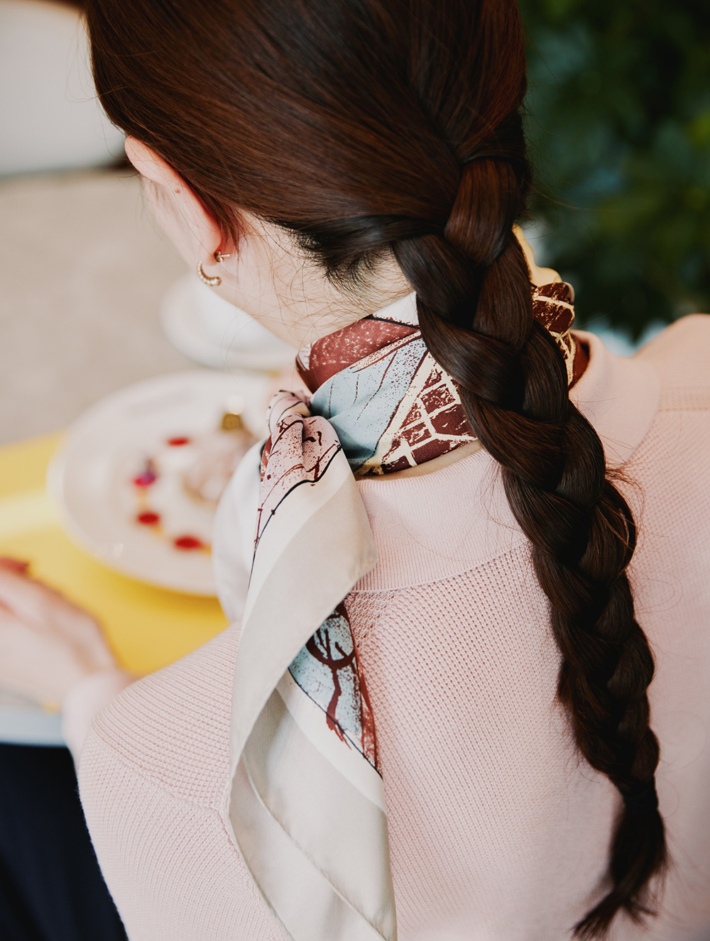 座っても可愛いコーディネートをしたかったので、春らしいピンクのニットとスカーフを合わせました。