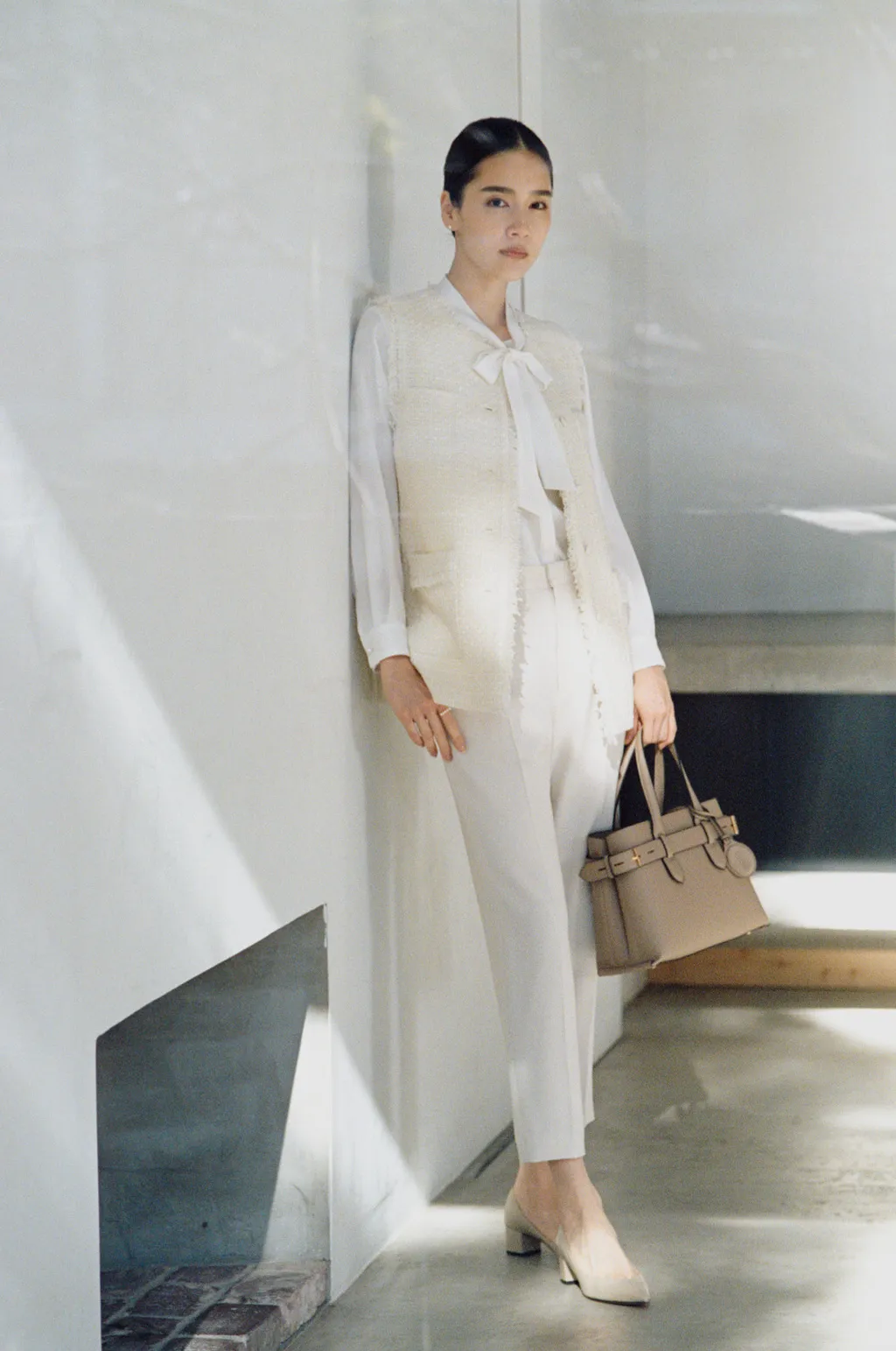春らしいベージュのパンツスタイルには、ジャケットよりも気負わず羽織れるジレをセレクト。風合いのあるミックスツイードがほどよい華やかさを添え、ボウタイブラウスとのレイヤードも好相性。デニムと合わせれば、カジュアルな集まりやラフなシーンにも着回せる、汎用性の高さも魅力です。