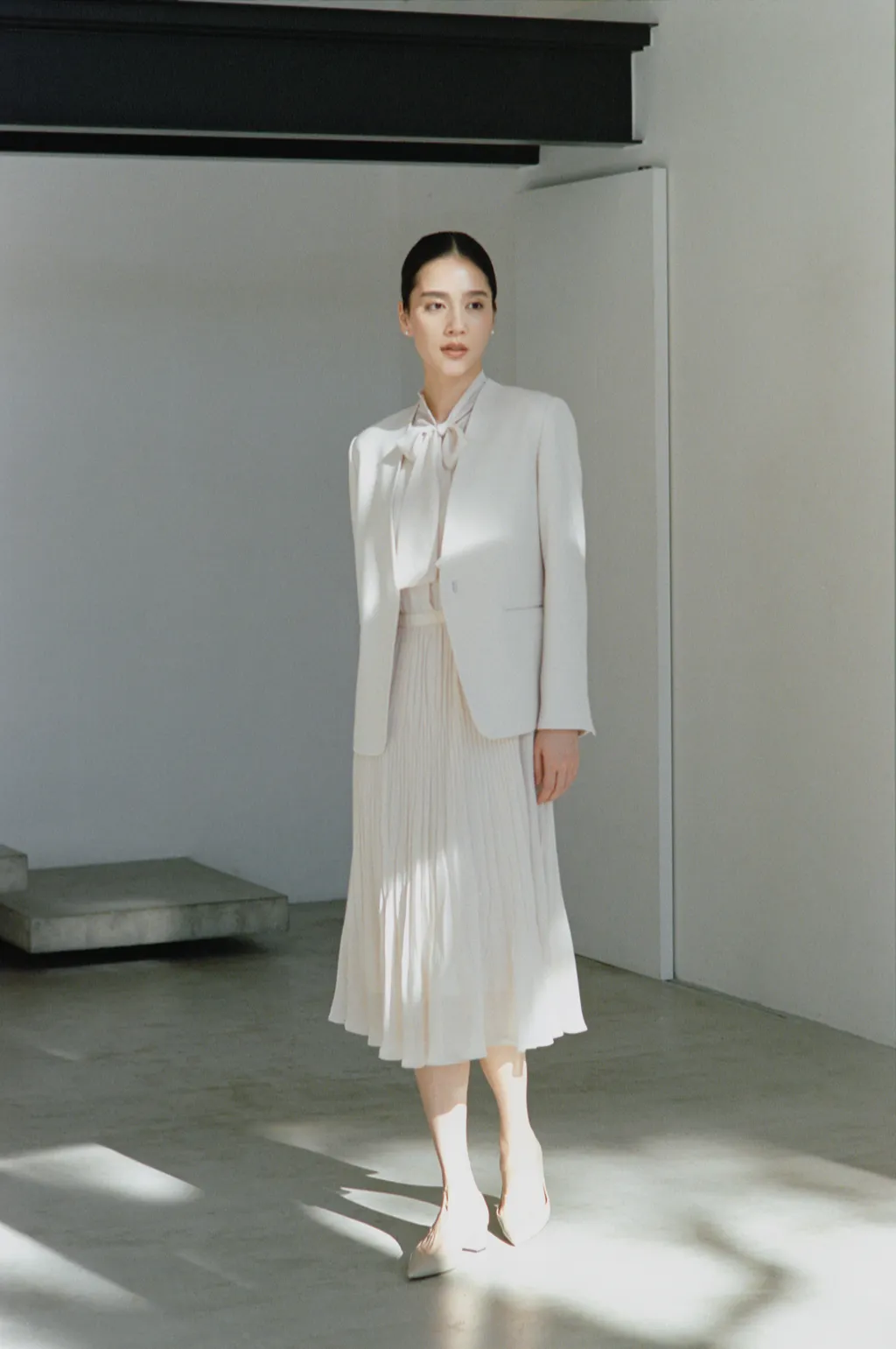 襟もとのボウタイが顔まわりに明るさを添え、落ち着きの中にも上品さを漂わせるシフォンプリーツワンピース。同色のノーカラージャケットを羽織れば、いっそうフォーマルな装いに。クラシカルなプリーツが清楚な佇まいを引き立て、洗練されたエレガンスが所作を美しく際立たせます。