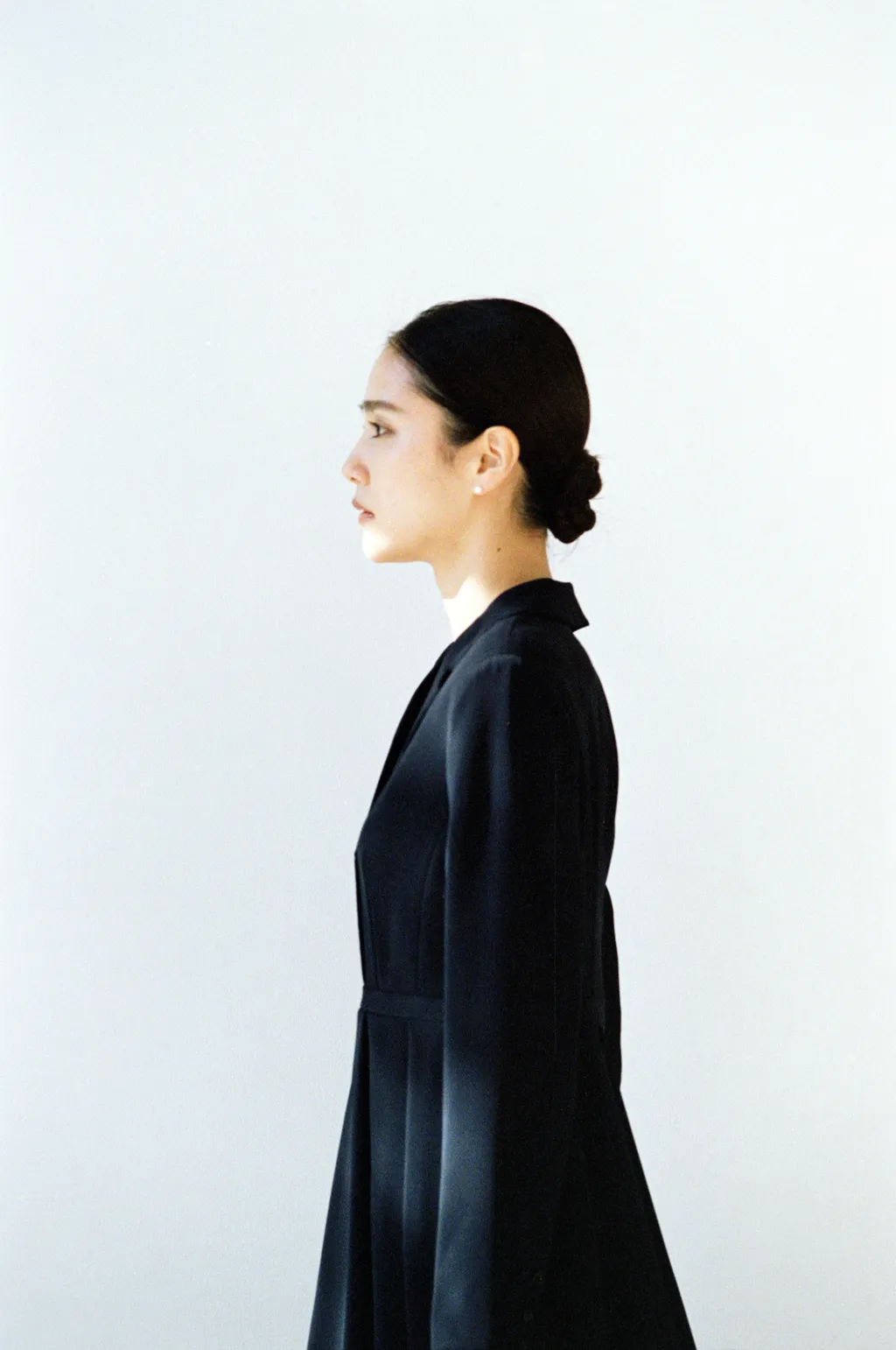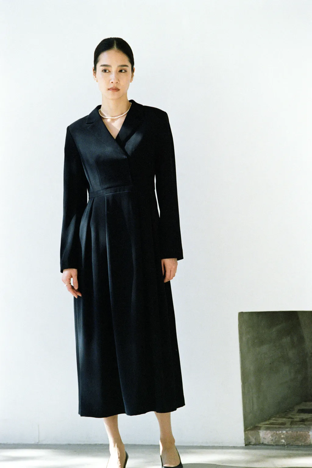 パターン設計からディティールに至るまで、美意識を丁寧にめぐらせた一着。ナローシルエットに配したデザインタックが立体感のあるフォルムを描き、立ち姿をエレガンスに演出。セミダブルブレスト仕立てにより、ドレッシーになりすぎることなく、品格と女性らしさが静かに引き立つ佇まいに。