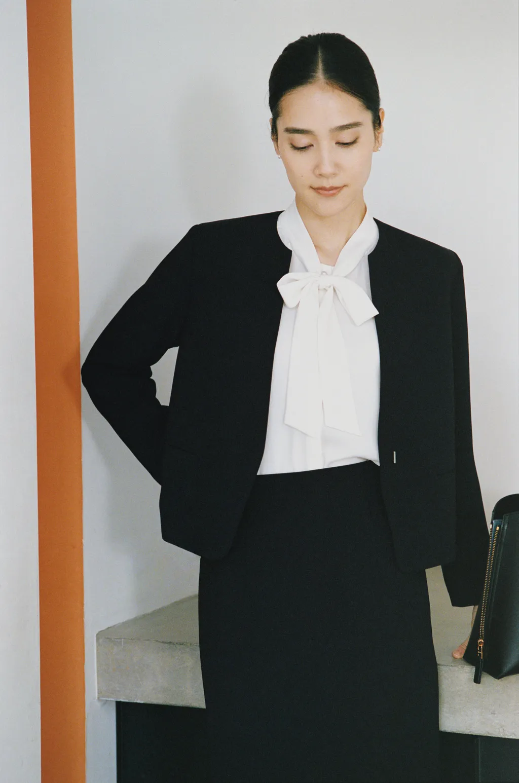 格式ある場にもふさわしく、安心して着用できる、正統派のセットアップ。ラウンドカラージャケットが首もとを端正に整え、セミフレアスカートが描くラインが装いに気品を添えます。ボウタイはラフに垂らしても、リボンに結んで華やかにも。首元に配したパールボタンがアクセントに。