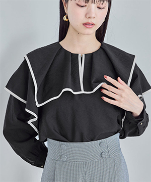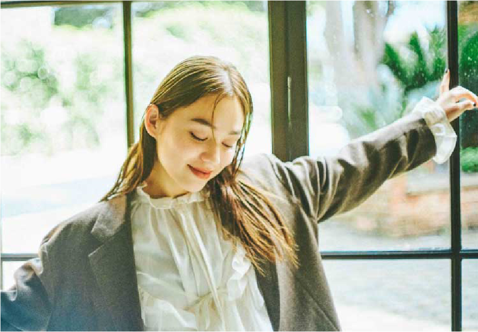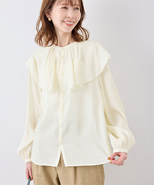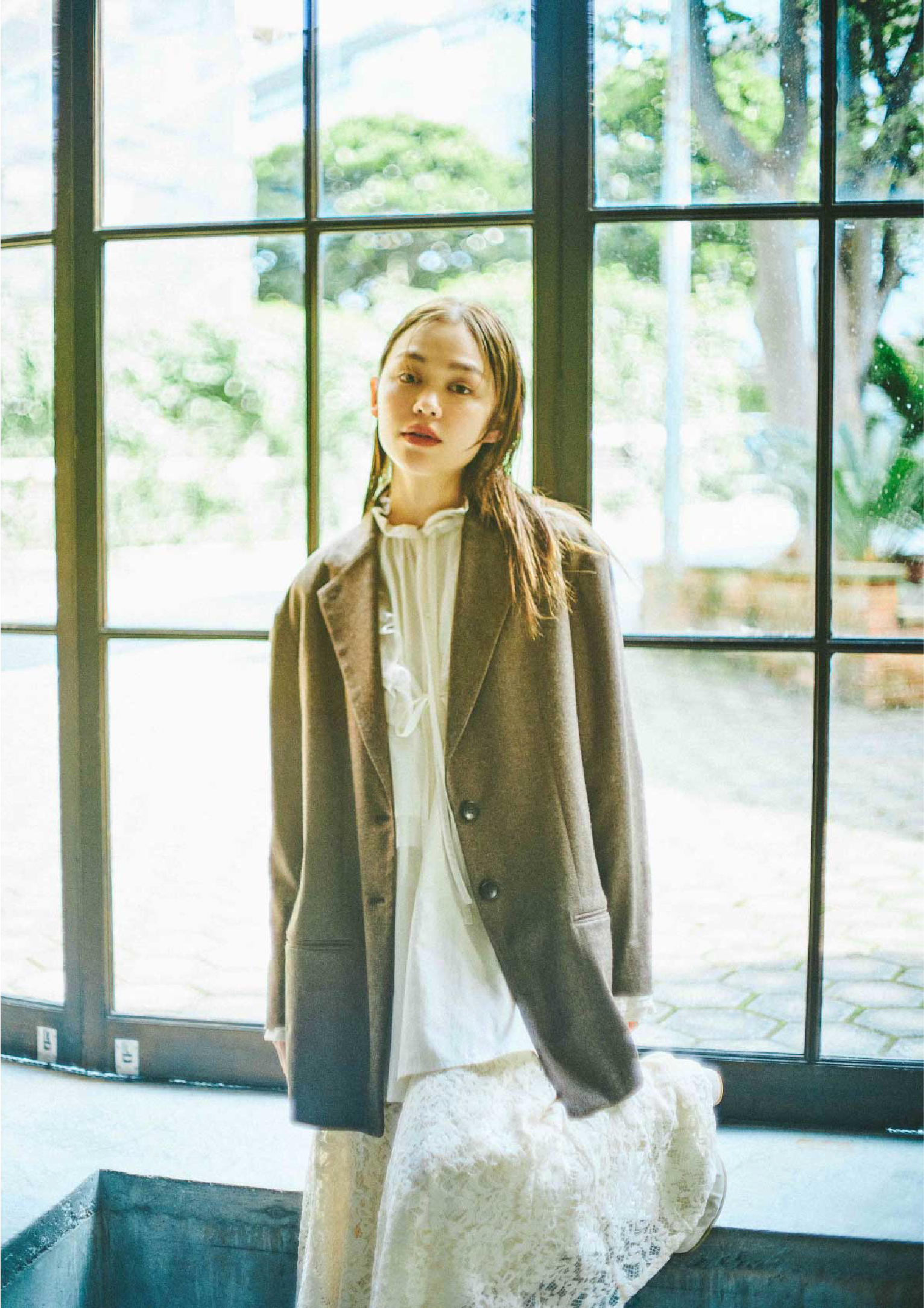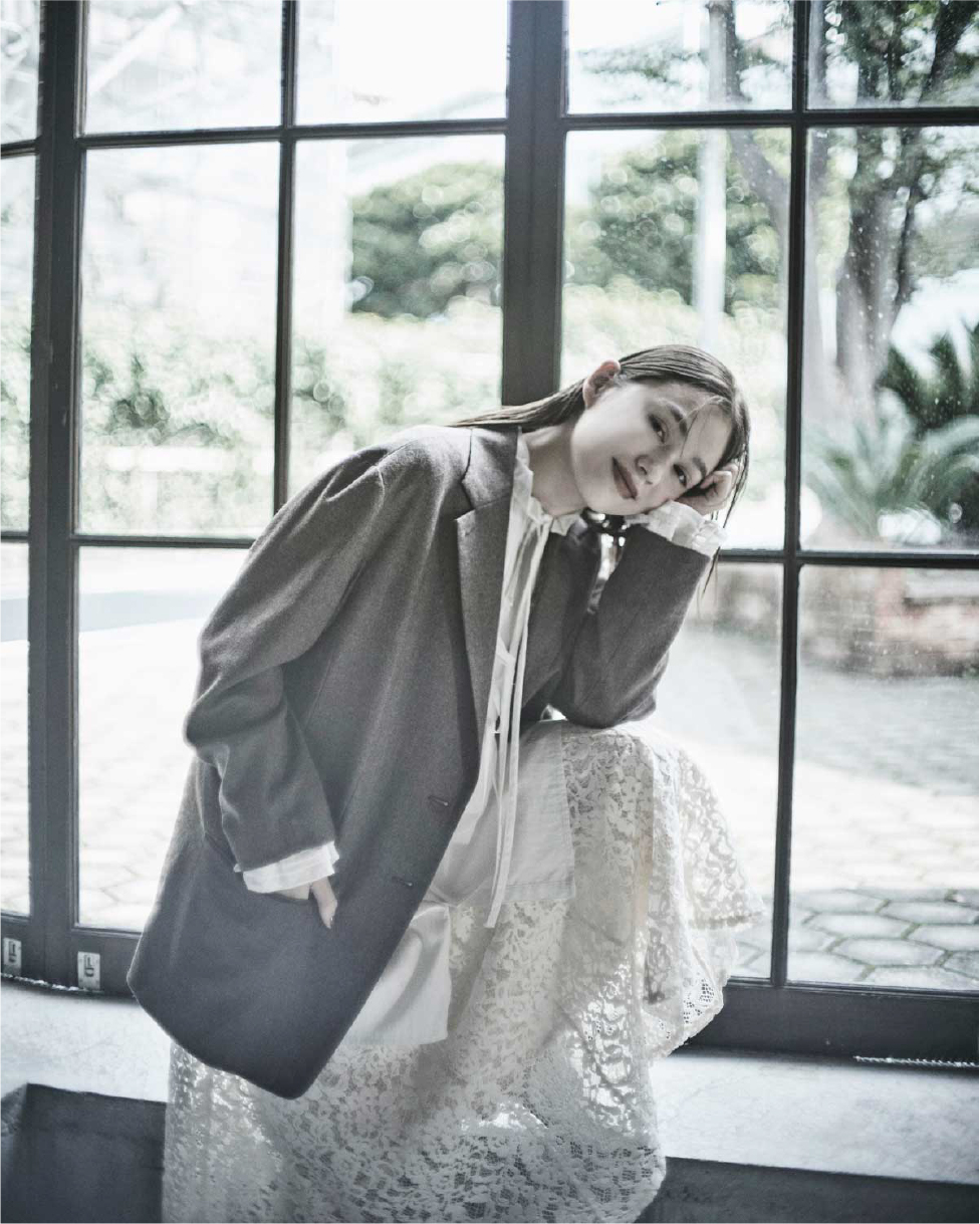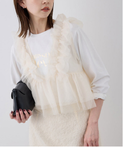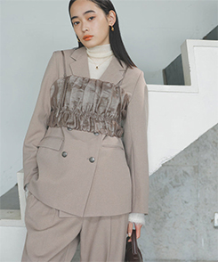 ジャケットが印象を引き締めてくれるから、他は甘すぎるくらいがちょうどいい。フリルが華やかなブラウスやビスチェ、フレアスカート……。軽やかさや動きを出してくれるデザインをチョイス。