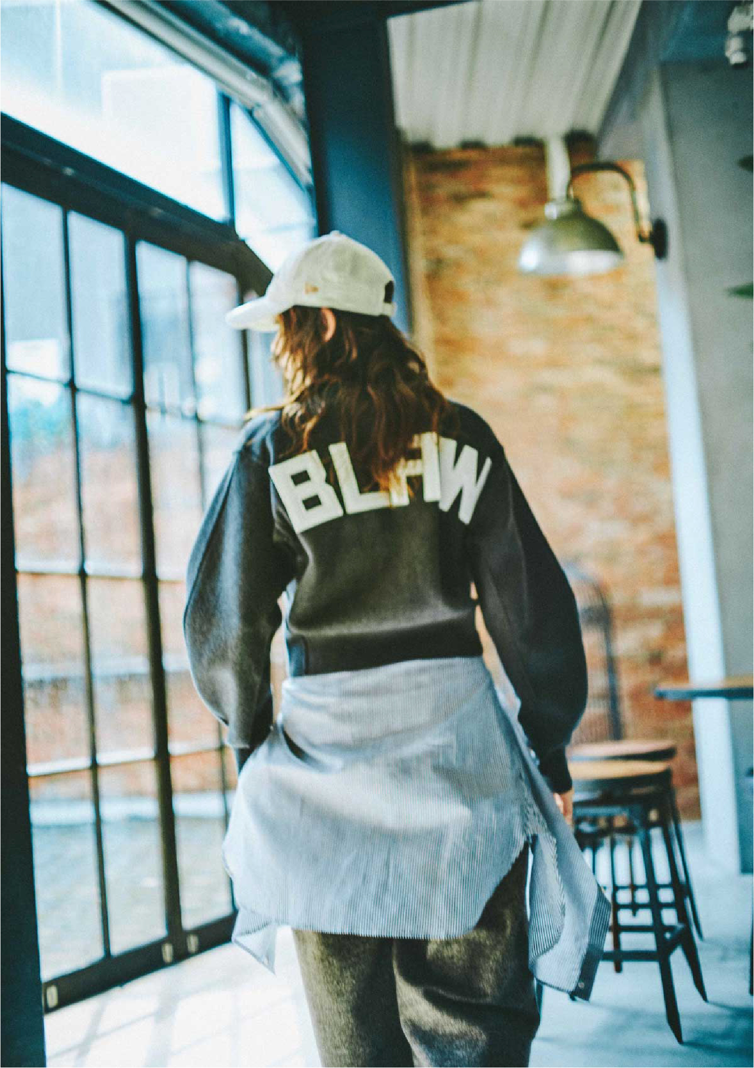 相反するスタイルのミックス&マッチを楽しんで。フェルト刺繍がアクセントのスウェットに、シャツを腰巻きしたストリート風な装いも、トラッド感のあるパンツと合わせればほどよく大人な印象に。