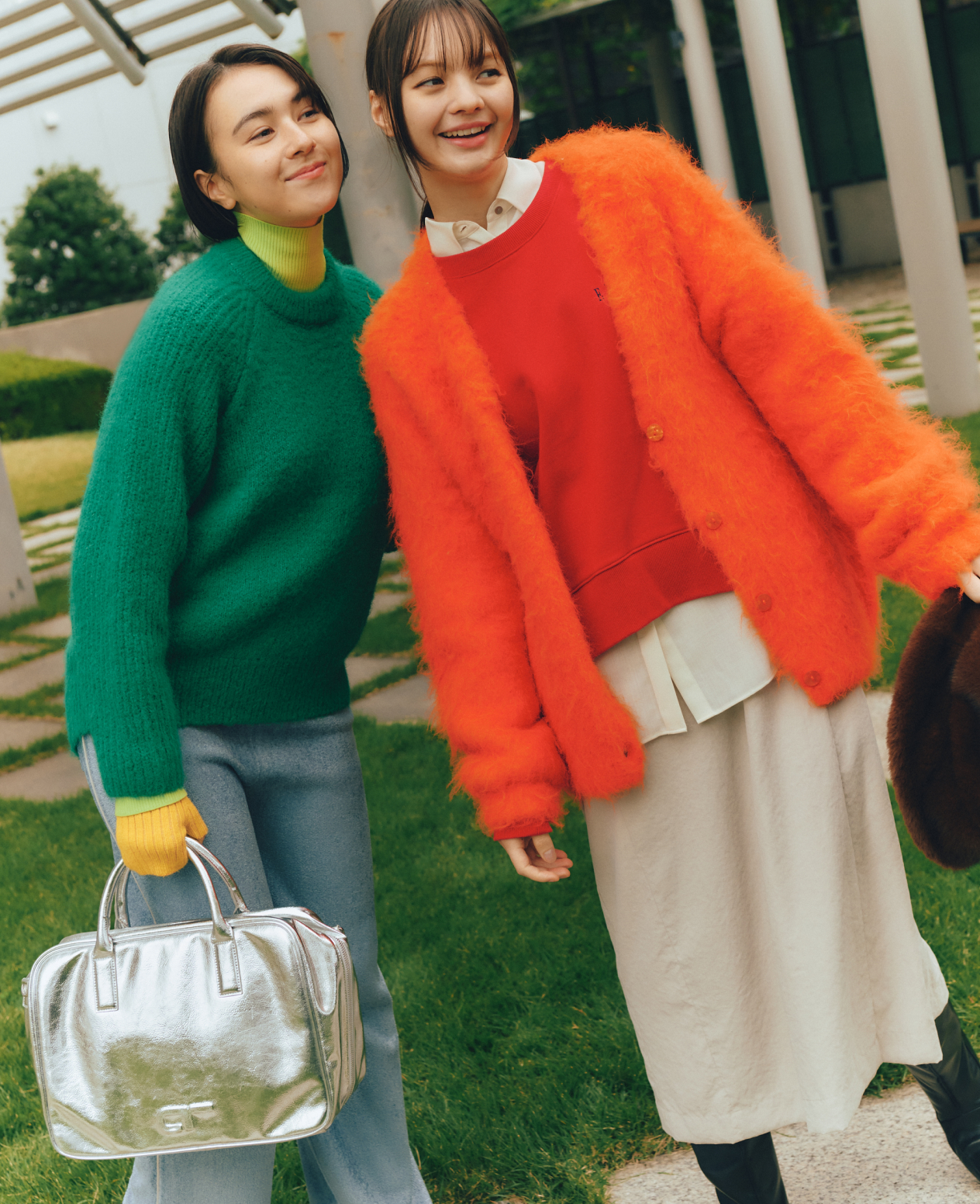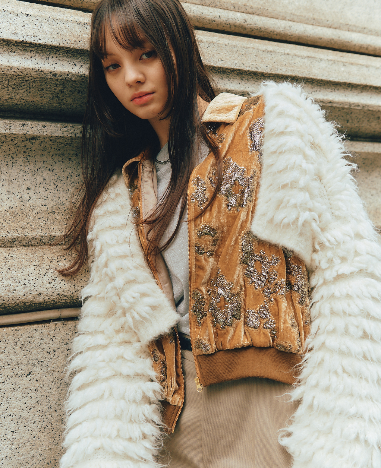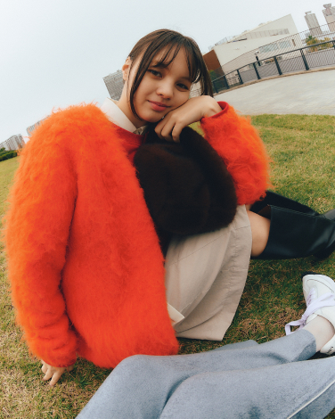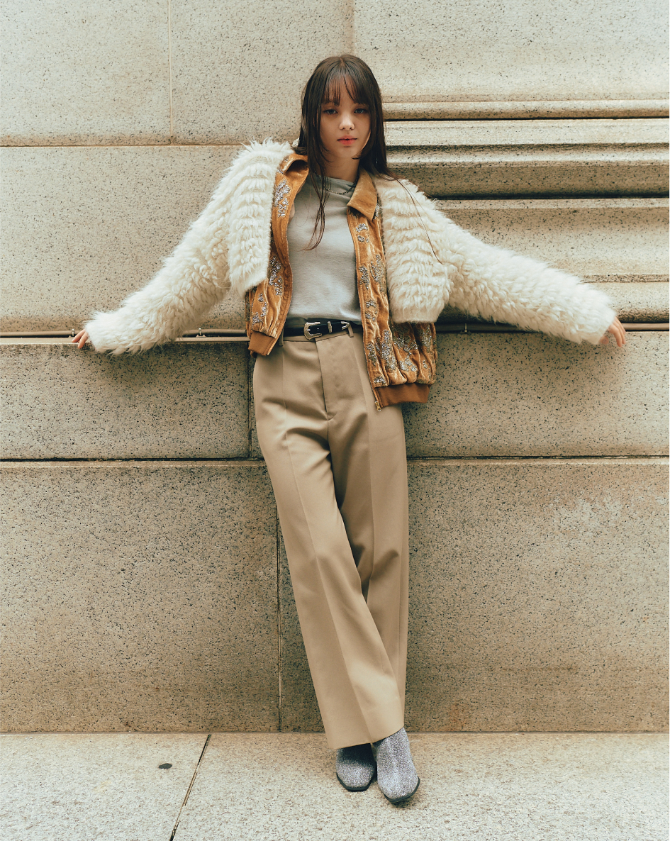煌めくブルゾン、フワフワなカーディガンを重ねた、私らしさ全開な着こなし