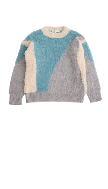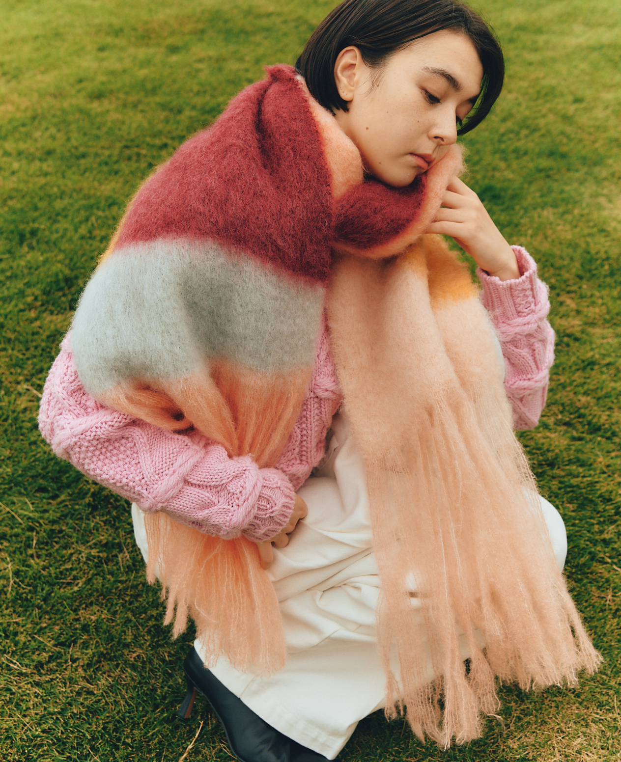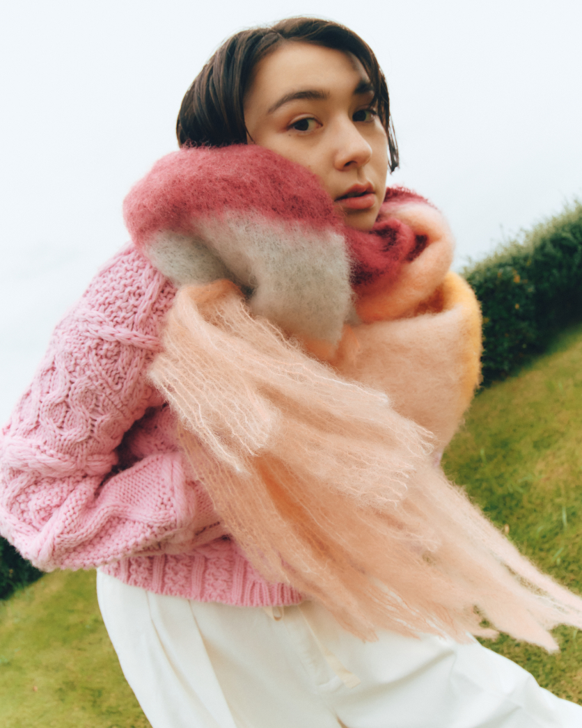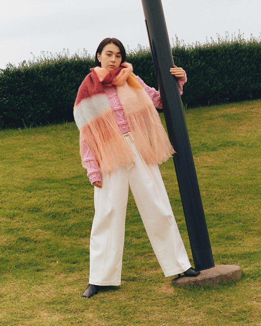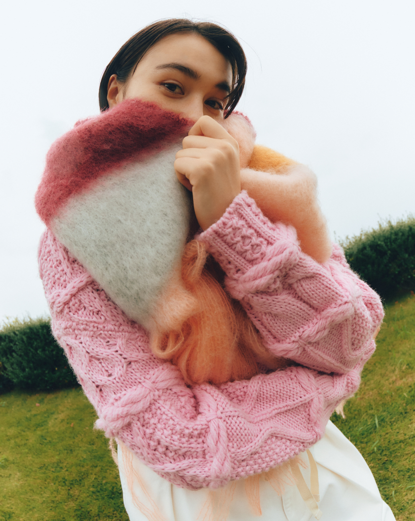 る。立体的な編み地がキュートなニットに、ふわふわのマフラーをくるっと巻