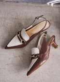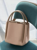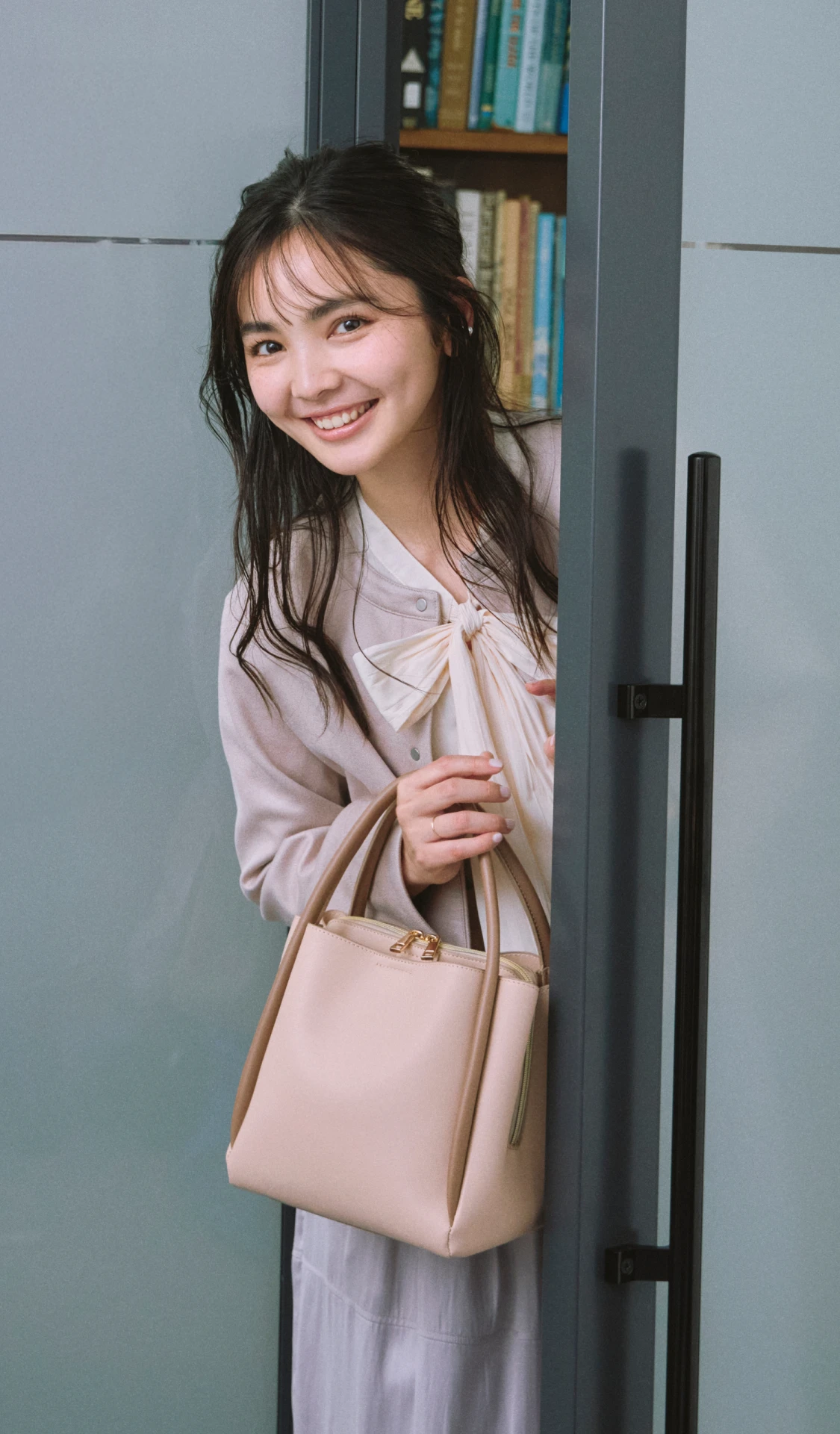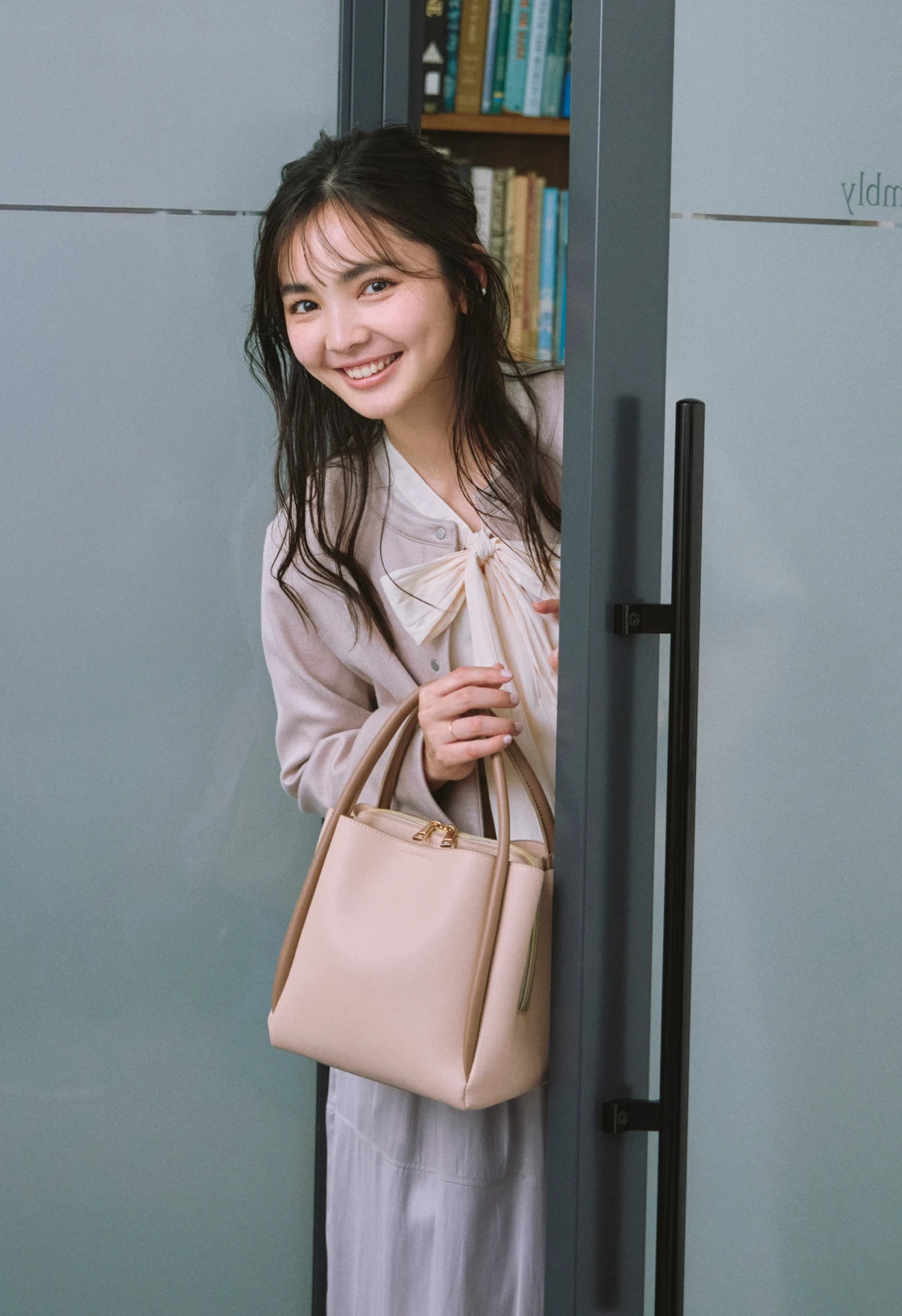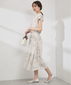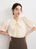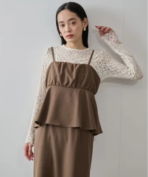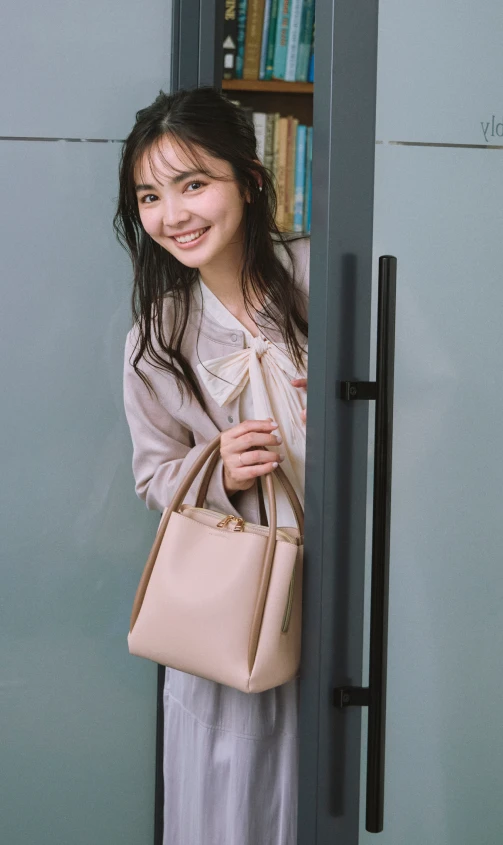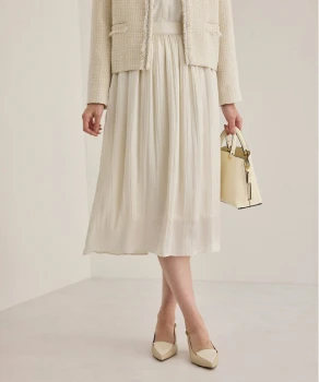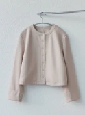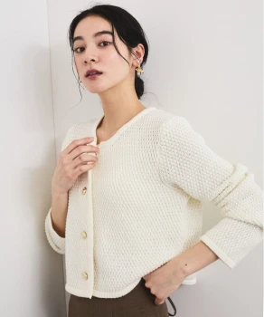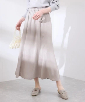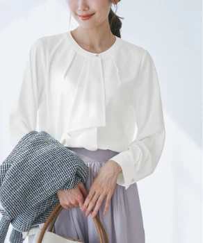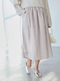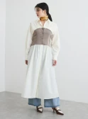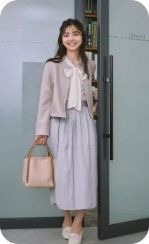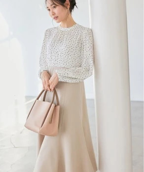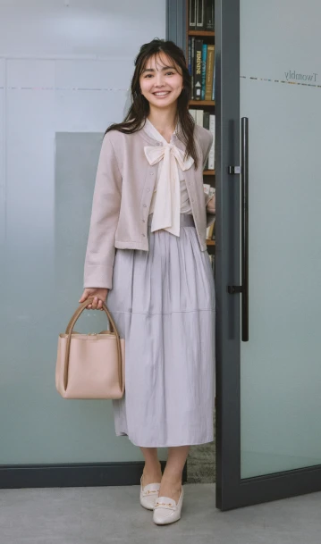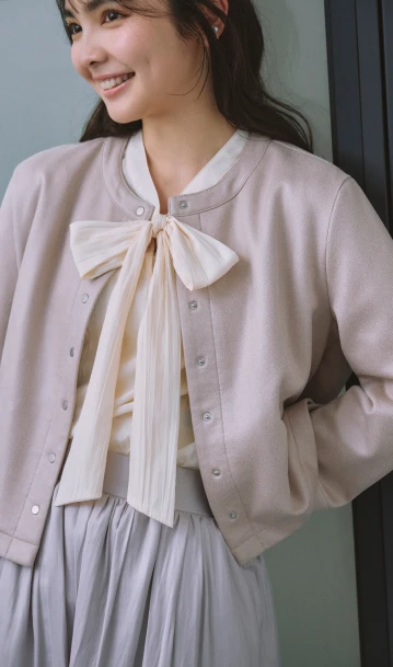 優しい色調のグラデーションでまとめた、あたたかく落ち着きを感じさせるスタイリング。ニュアンスカラーのカーディガン風ブルゾンとスカートには、明るいベージュのブラウスを合わせれば顔色がトーンアップ。