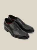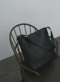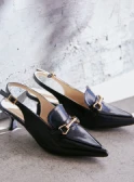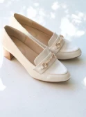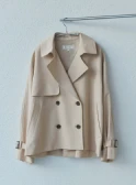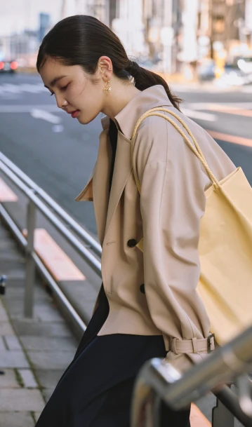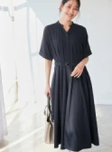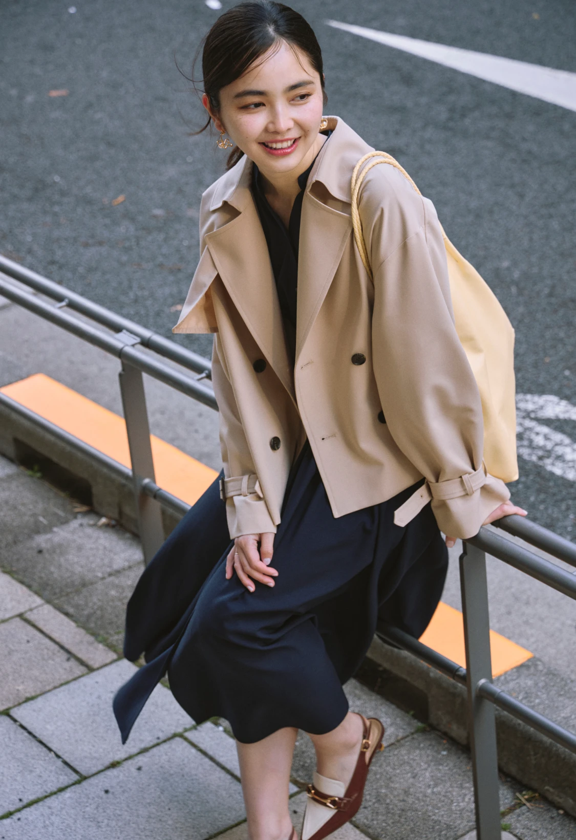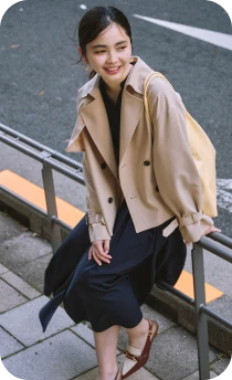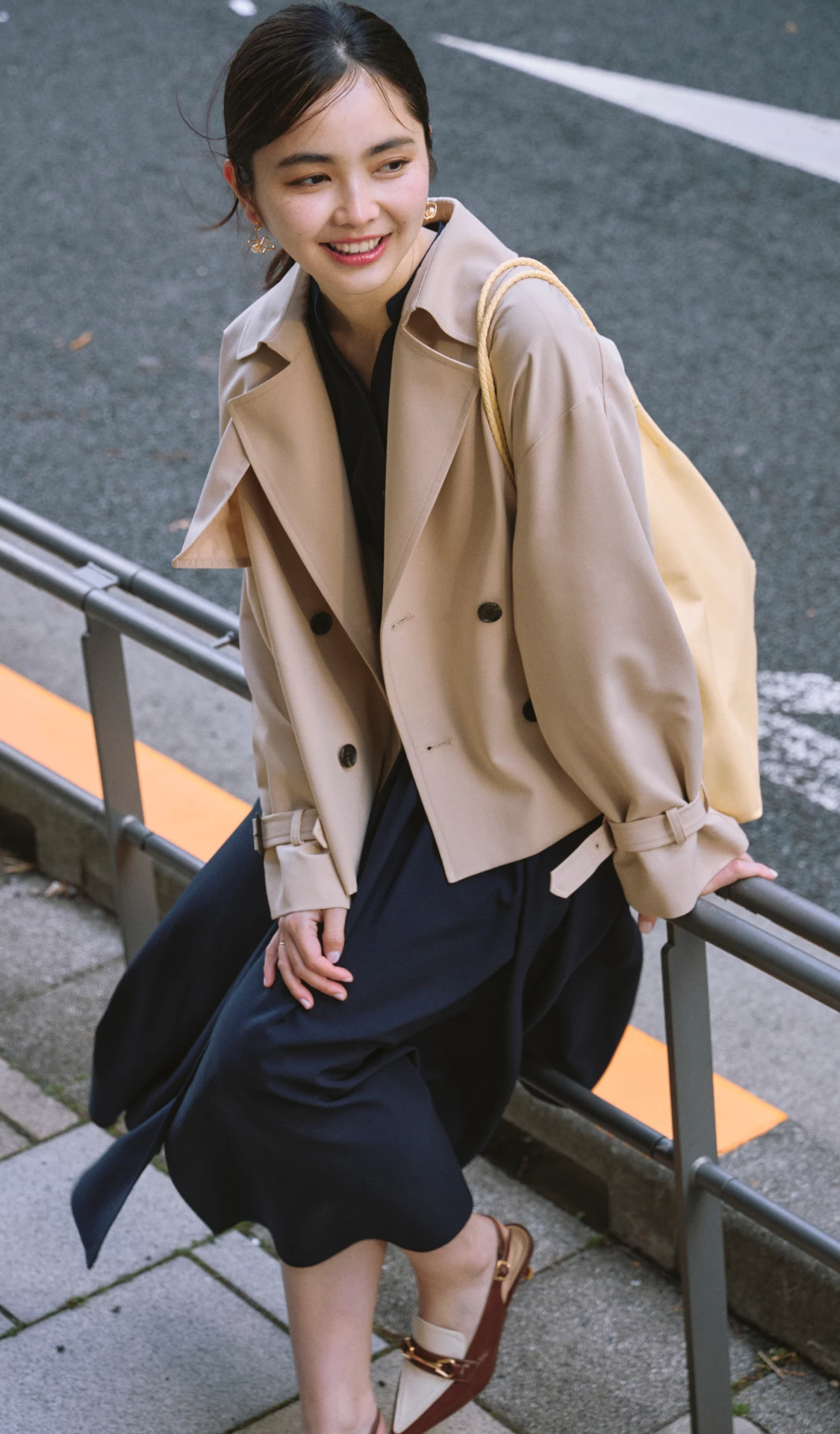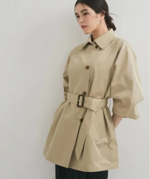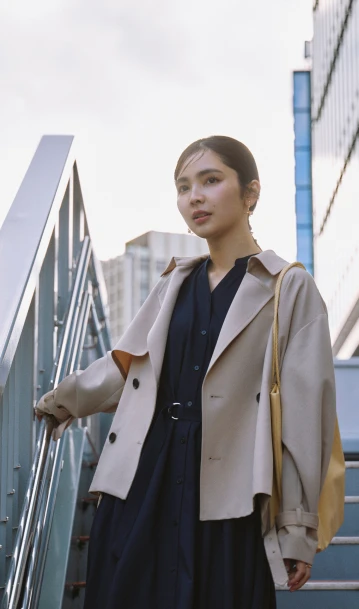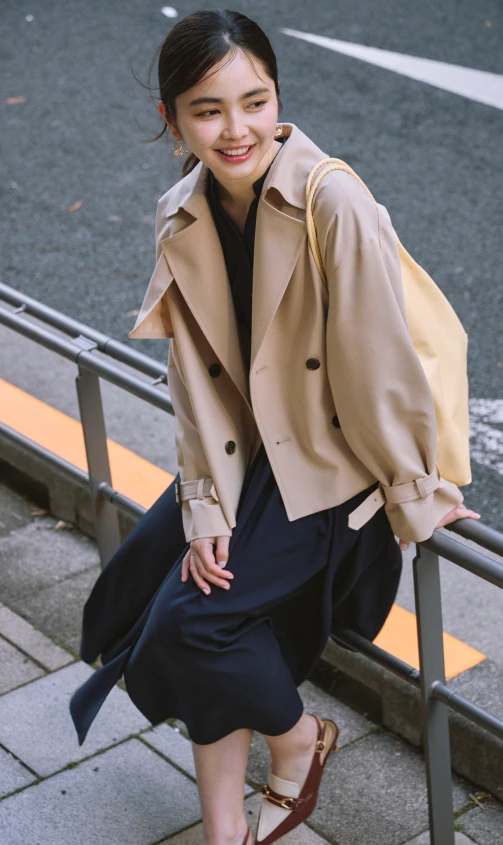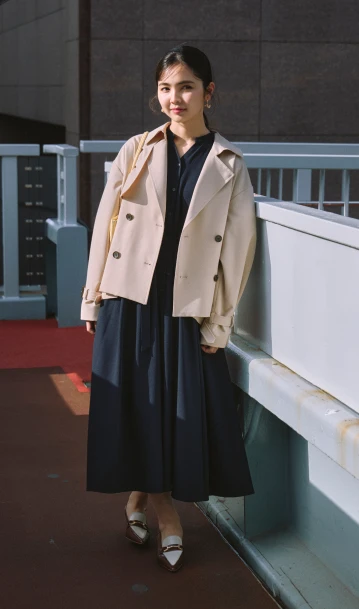 クラシカルなネイビーのシャツワンピースには、ショート丈のトレンチコートが好バランス。トレンドのヒールローファーを合わせて足元も抜かりなく。バッグは